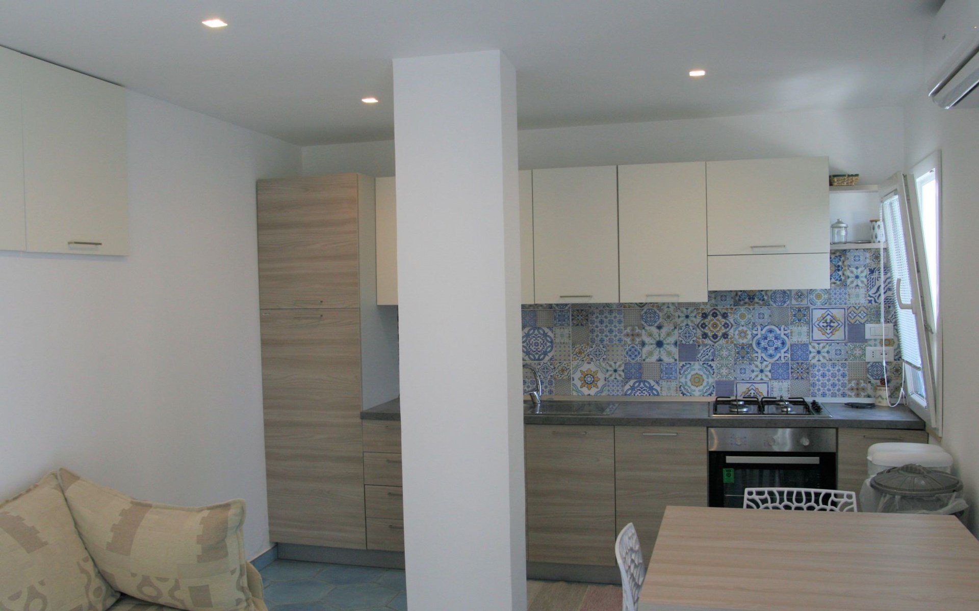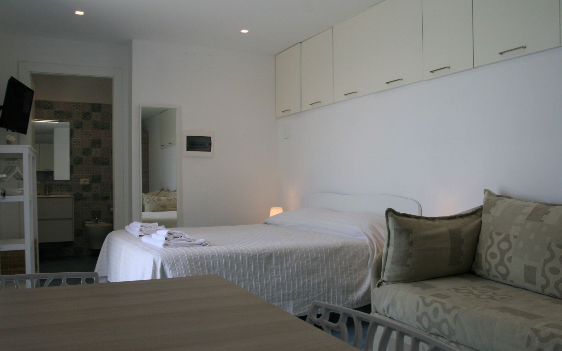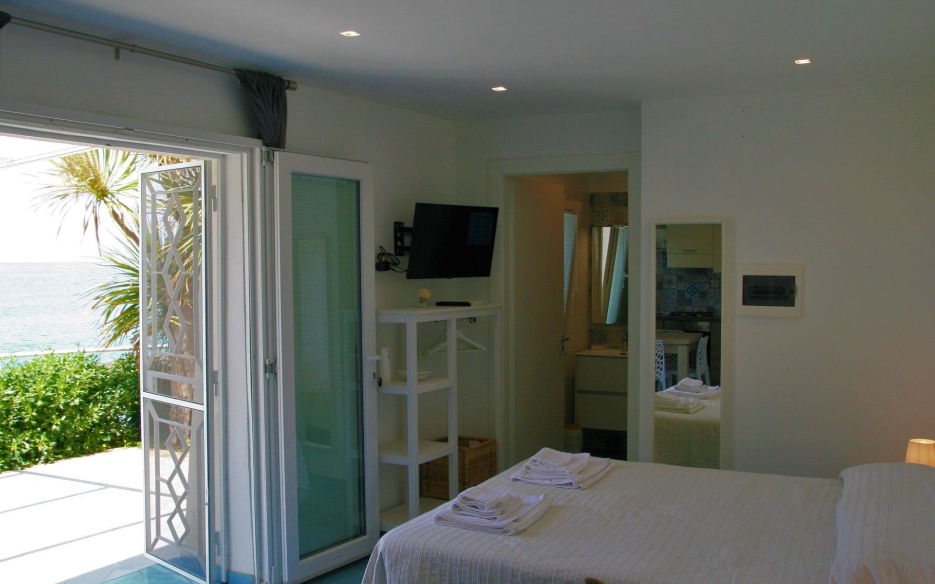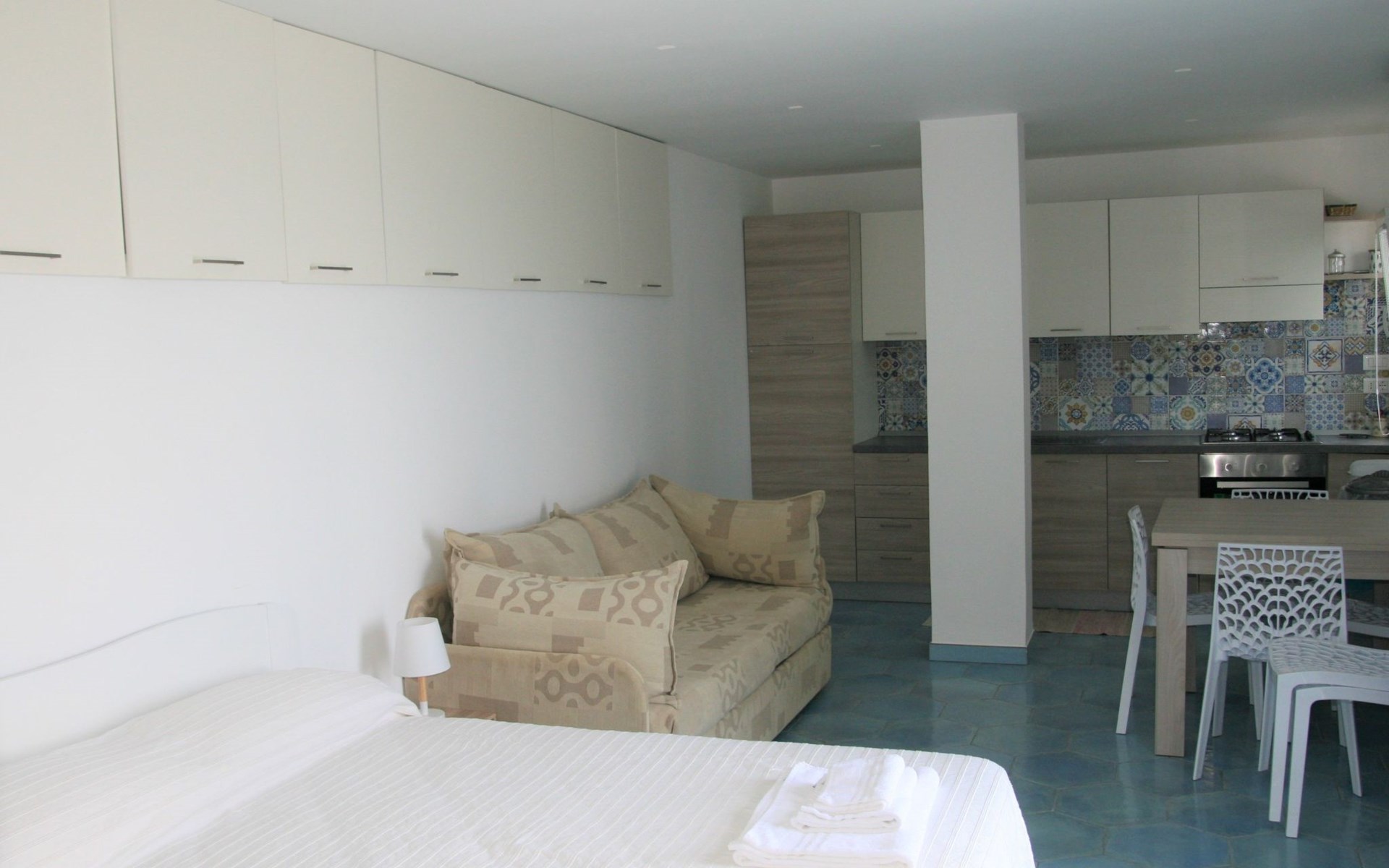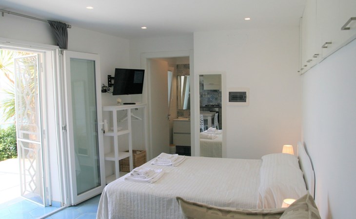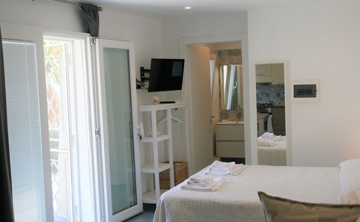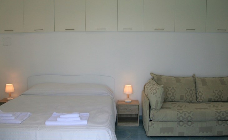 The studio, measuring approximately 40 sq. m., consists of a living/dining room with flat-screen TV, double bed, sofa bed, dining table, and a fully equipped kitchen area with cooker, oven, microwave, coffee maker, and refrigerator with freezer. It has a large bathroom with shower and bidet and a laundry corner with washing machine. Floors and wall tiles are glazed ceramic in Mediterranean style. The large terrace, accessible from the living room, overlooks the sea and is equipped with awnings, table, chairs and sun loungers.