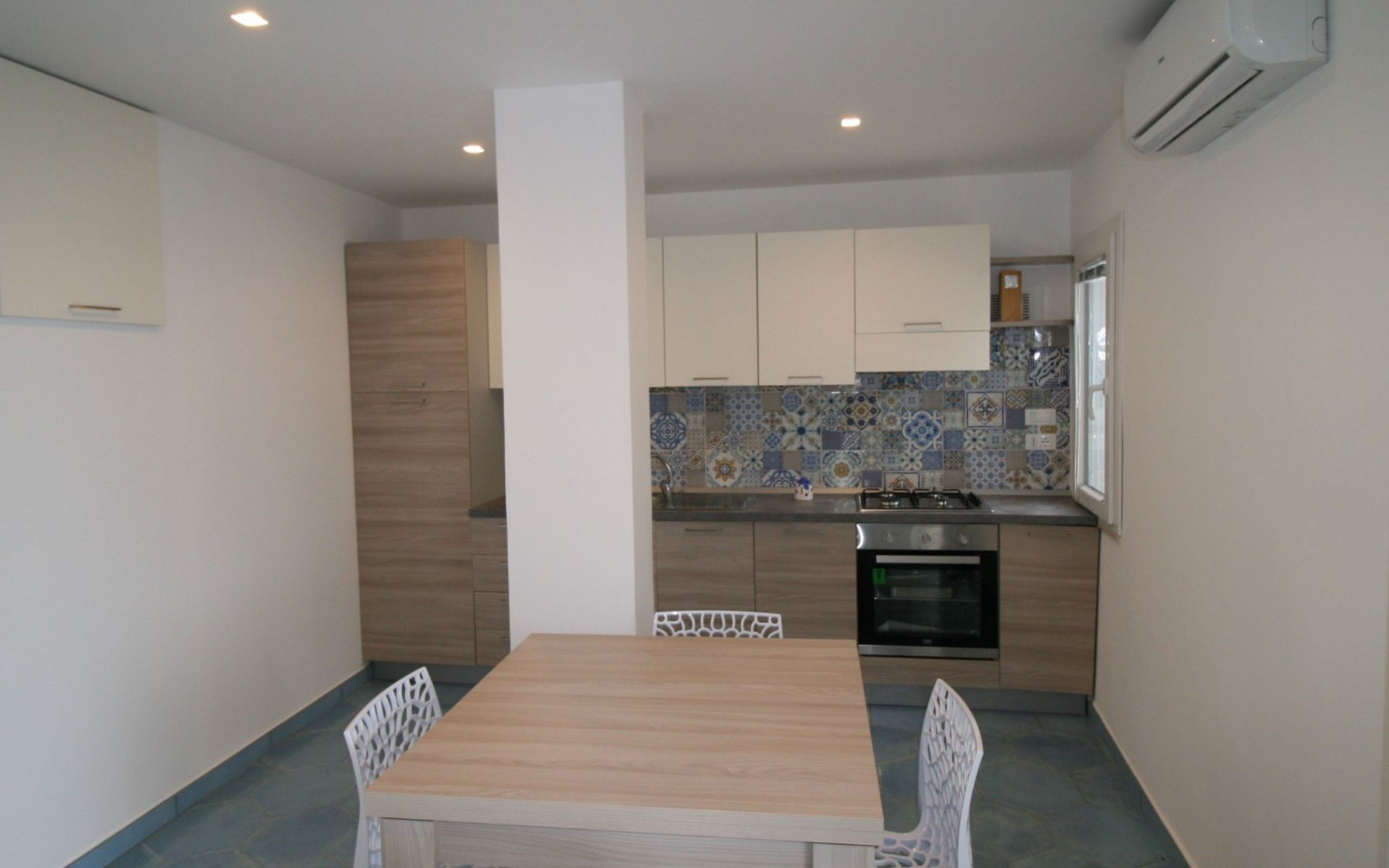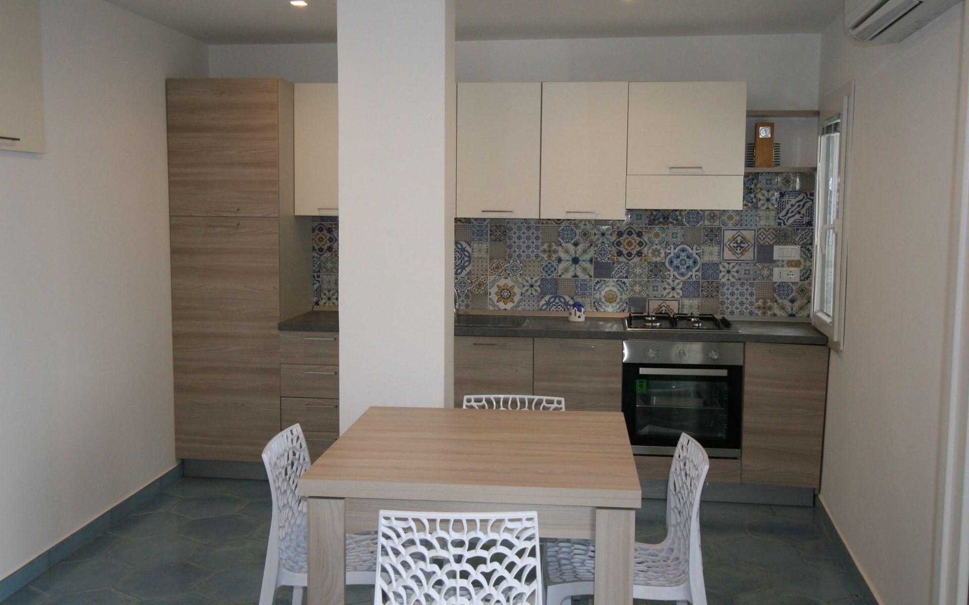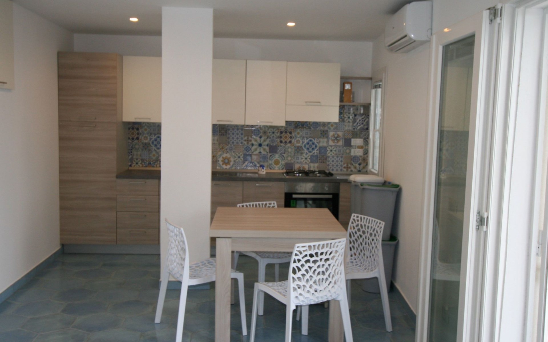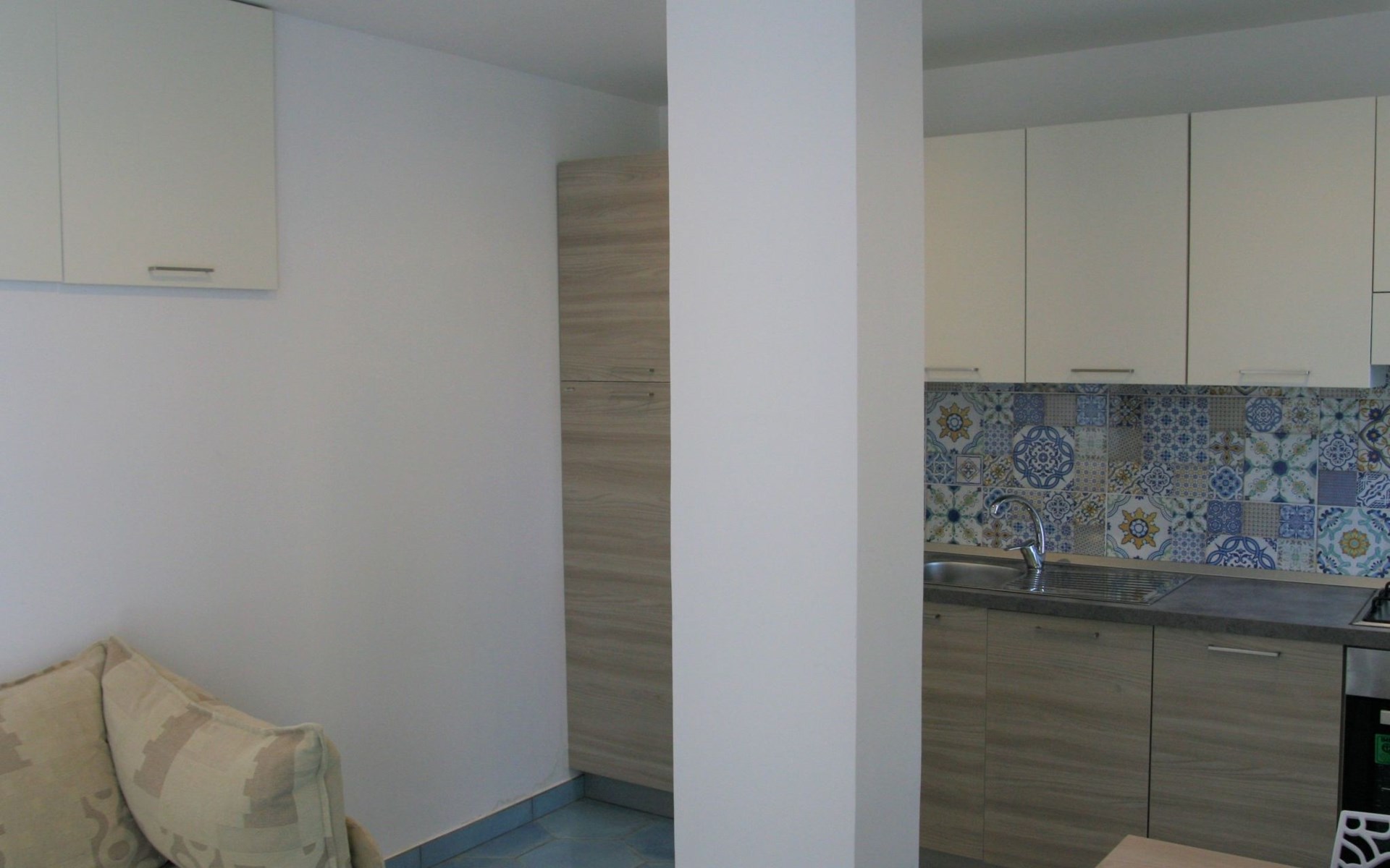 The studio, measuring approximately 40 sq. m., consists of a living/dining room with flat-screen TV, double bed, sofa bed, dining table, and a fully equipped kitchen area with cooker, oven, microwave, coffee maker, and refrigerator with freezer. It has a large bathroom with shower and bidet and a laundry corner with washing machine. Floors and wall tiles are glazed ceramic in Mediterranean style. The large terrace, accessible from the living room, overlooks the sea and is equipped with awnings, table, chairs and sun loungers.