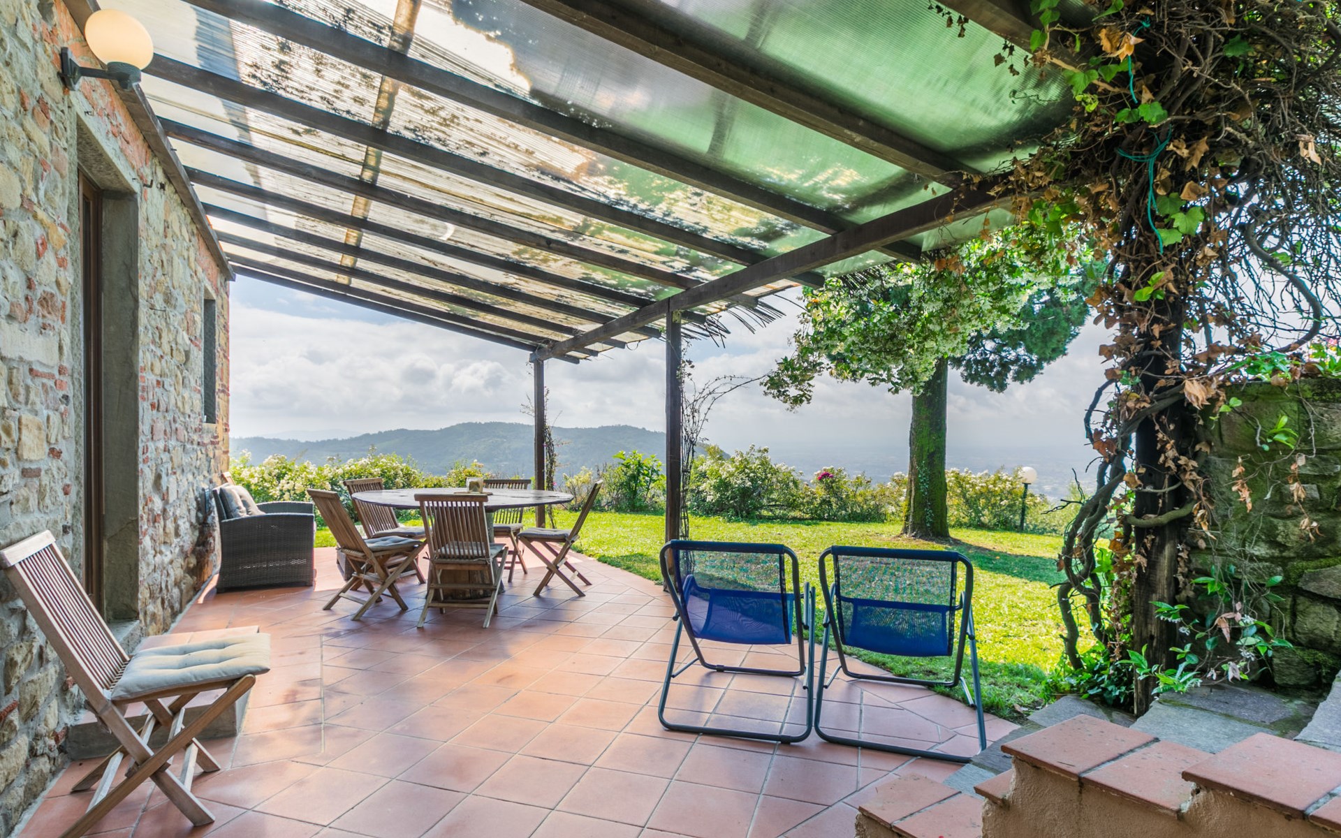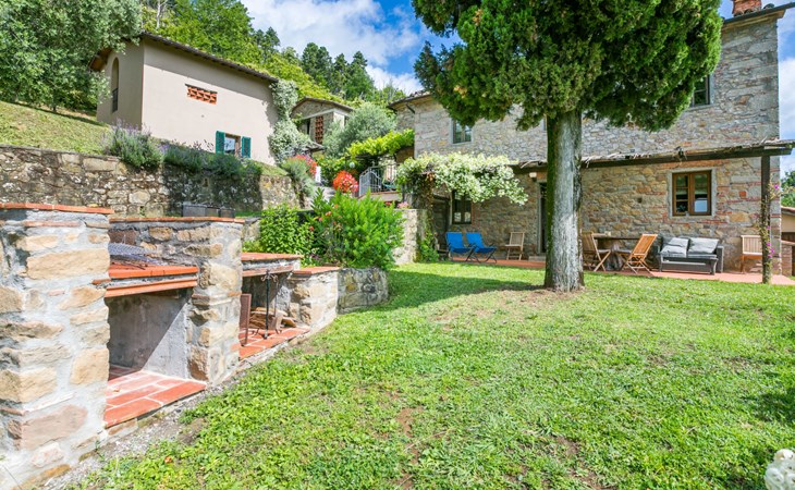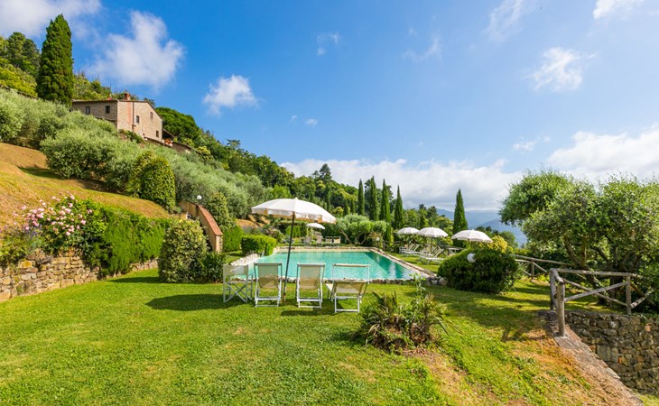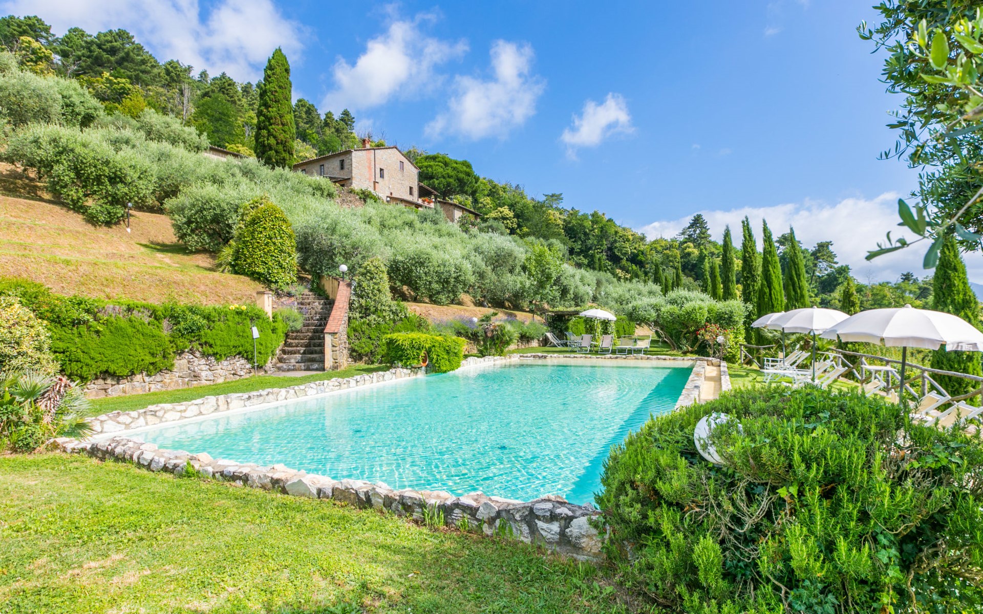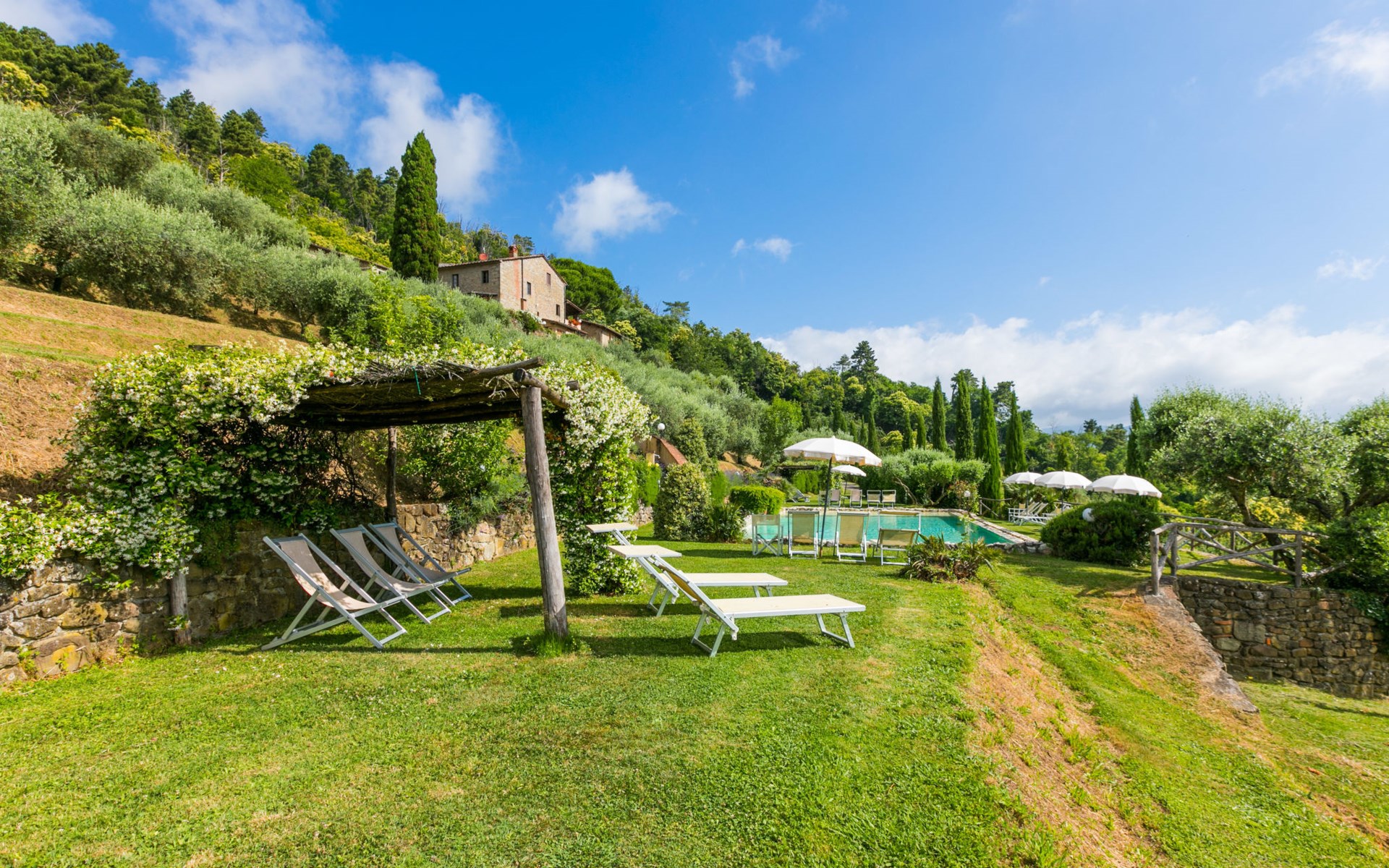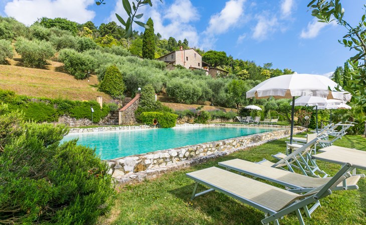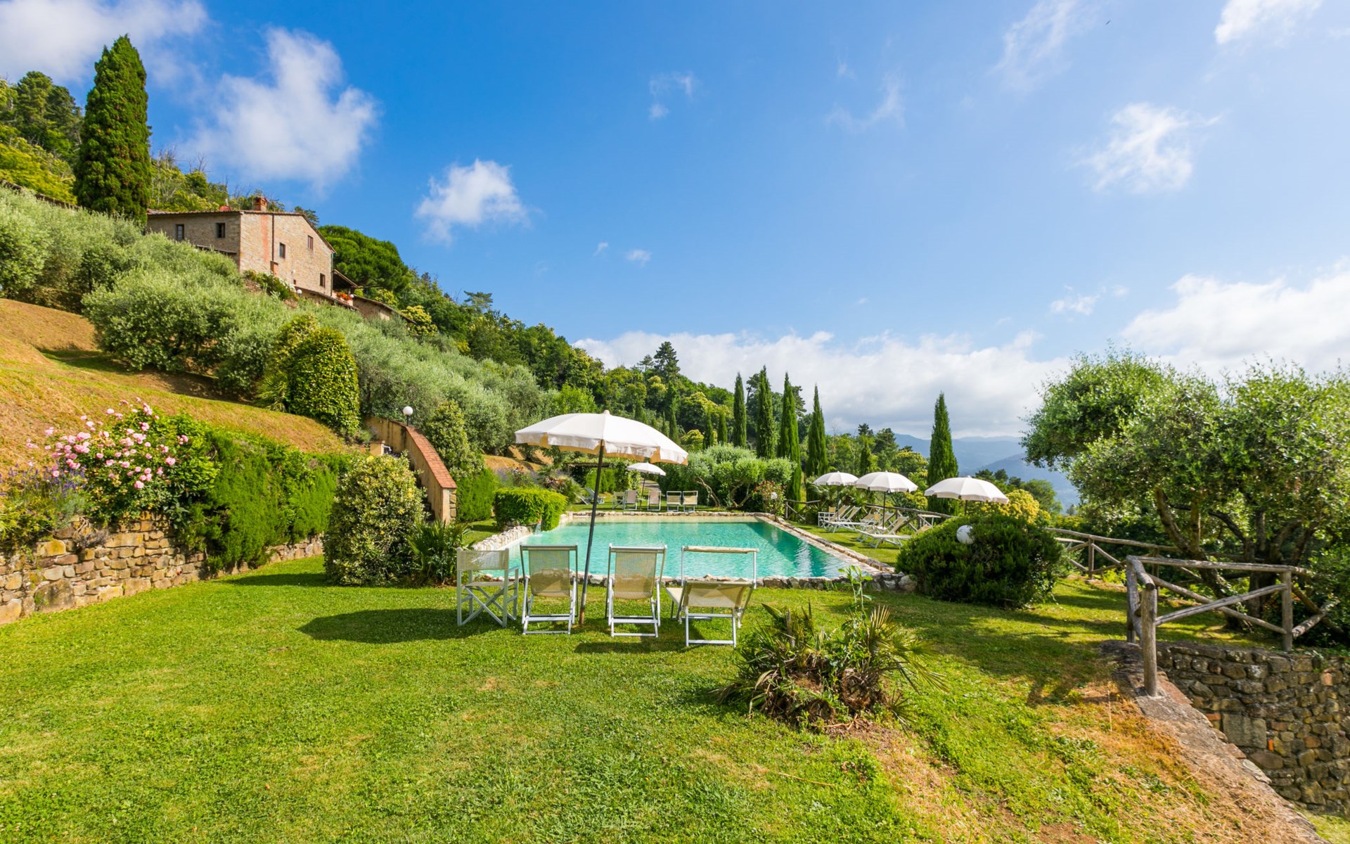 Agriturismo "La Cupola", 500 m a.s.l., surrounded by trees and vineyards. 3 houses in the residence. 4 apartments in the residence. 5.5 km from the centre of Pescia, 20 km from the centre of Lucca, 45 km from the centre of Pisa, in a secluded position on a slope, 57 km from the sea, in the countryside. For shared use: property 40'000 m2, terraced garden (not fenced) with plants, meadow, swimming pool (19 x 8 m, depth 120 - 160 cm, seasonal availability: 26.Apr. - 27.Sep.). Children's pool, pergola, garden furniture, barbecue. In the house: WiFi, central heating system, washing machine (for shared use), heating to be paid on the spot, heating available only from 01.Nov. - 30.Mar.. 600 m long steep motor access (via unmade road). Parking on the premises. E-charging station. Supermarket 5.5 km, bus stop 3 km, sandy beach "Viareggio" 57 km. Golf course (18 hole) 14 km. Nearby attractions: Collodi 9 km, Montecarlo 11 km, Montecatini Terme 13 km, Vinci, Pistoia 32 km, San Miniato 38 km. Residence with electric gates.
