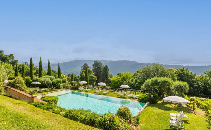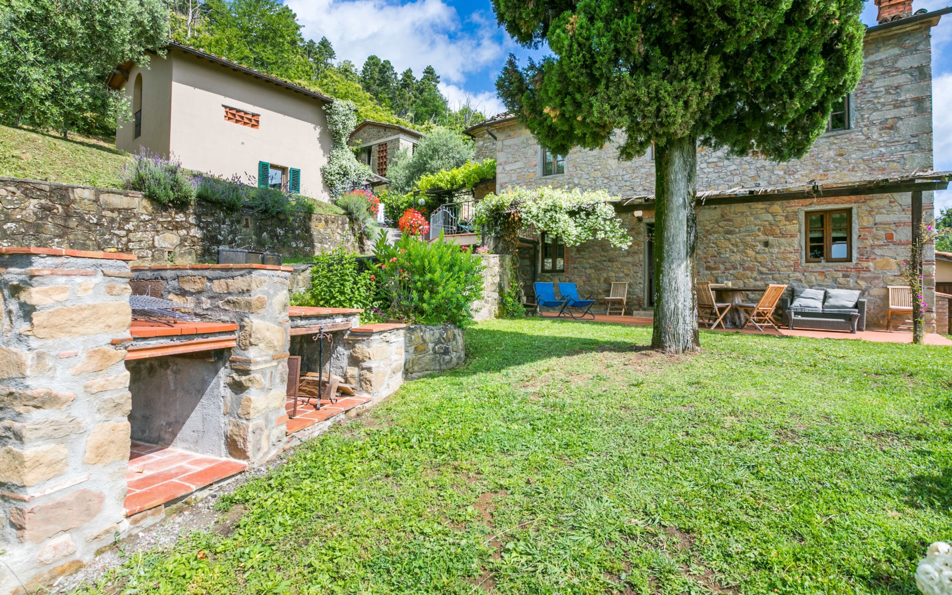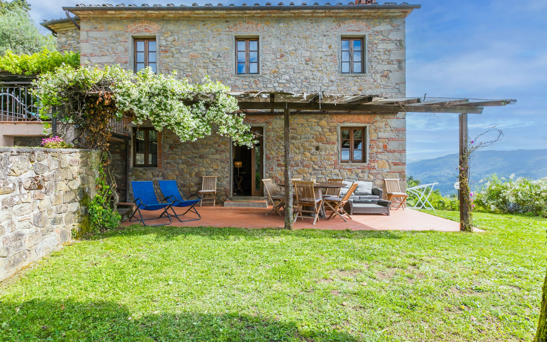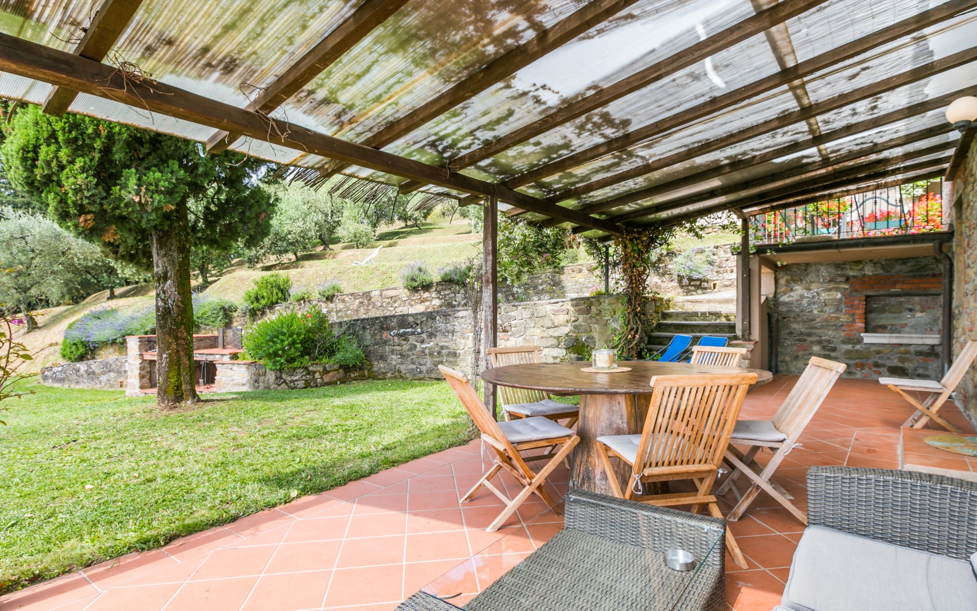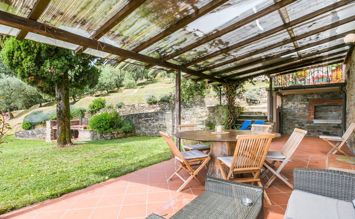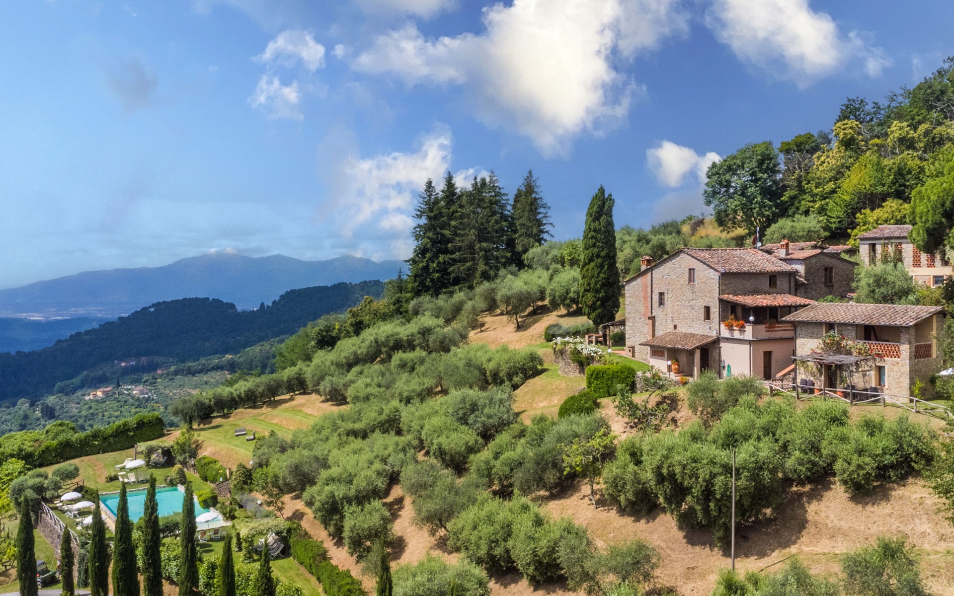 Agriturismo "La Cupola", 500 m a.s.l., surrounded by trees and vineyards. 3 houses in the residence. 4 apartments in the residence. 5.5 km from the centre of Pescia, 20 km from the centre of Lucca, 45 km from the centre of Pisa, in a secluded position on a slope, 57 km from the sea, in the countryside. For shared use: property 40'000 m2, terraced garden (not fenced) with plants, meadow, swimming pool (19 x 8 m, depth 120 - 160 cm, seasonal availability: 26.Apr. - 27.Sep.). Children's pool, pergola, garden furniture, barbecue. In the house: WiFi, central heating system, washing machine (for shared use), heating to be paid on the spot, heating available only from 01.Nov. - 30.Mar.. 600 m long steep motor access (via unmade road). Parking on the premises. E-charging station. Supermarket 5.5 km, bus stop 3 km, sandy beach "Viareggio" 57 km. Golf course (18 hole) 14 km. Nearby attractions: Collodi 9 km, Montecarlo 11 km, Montecatini Terme 13 km, Vinci, Pistoia 32 km, San Miniato 38 km. Residence with electric gates.