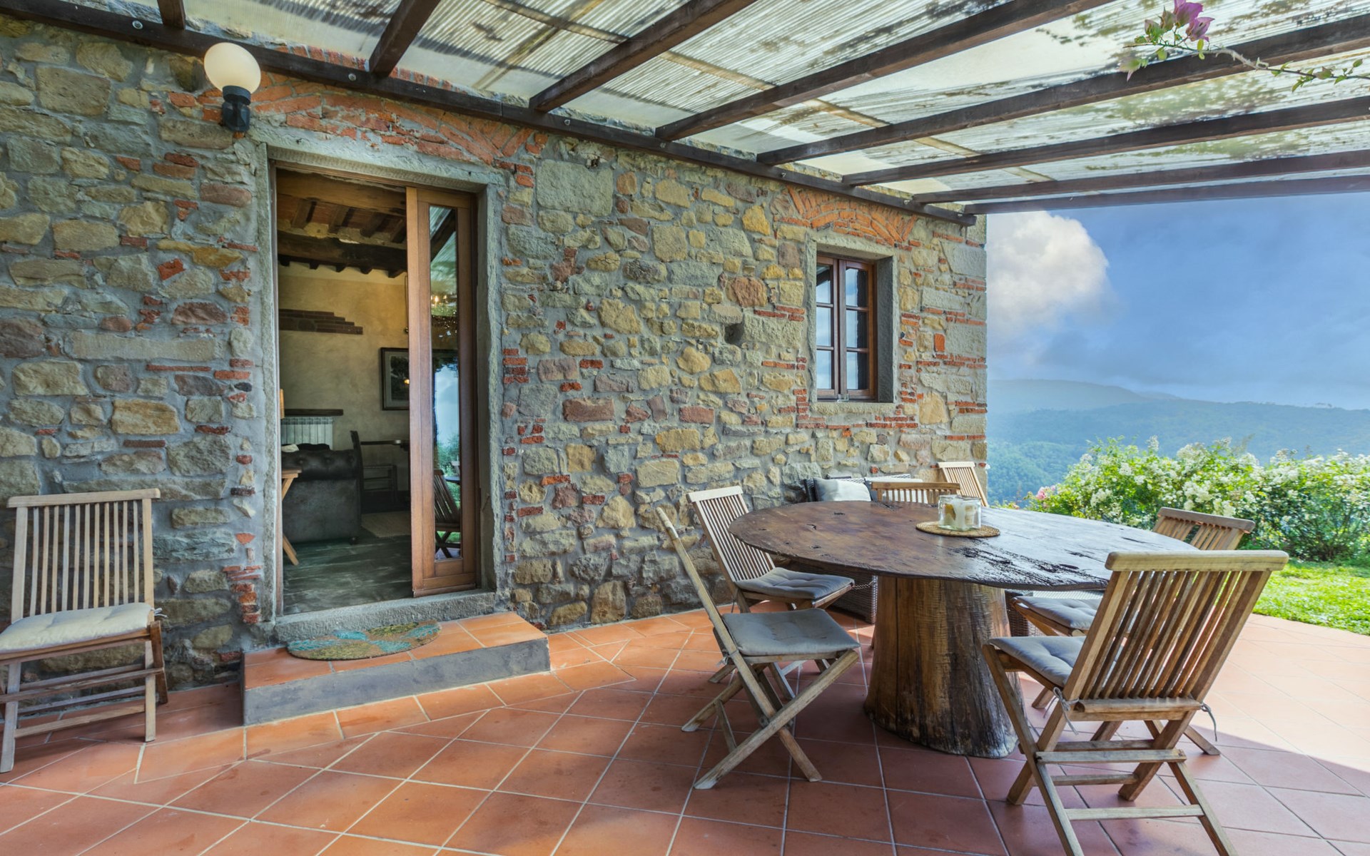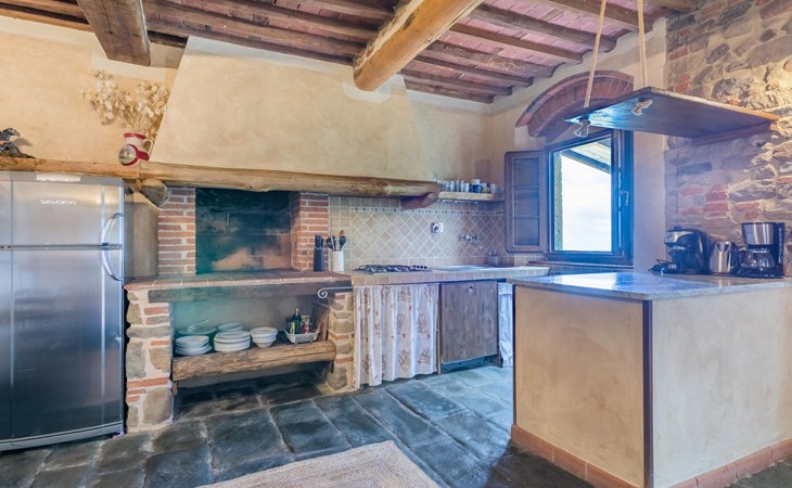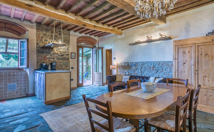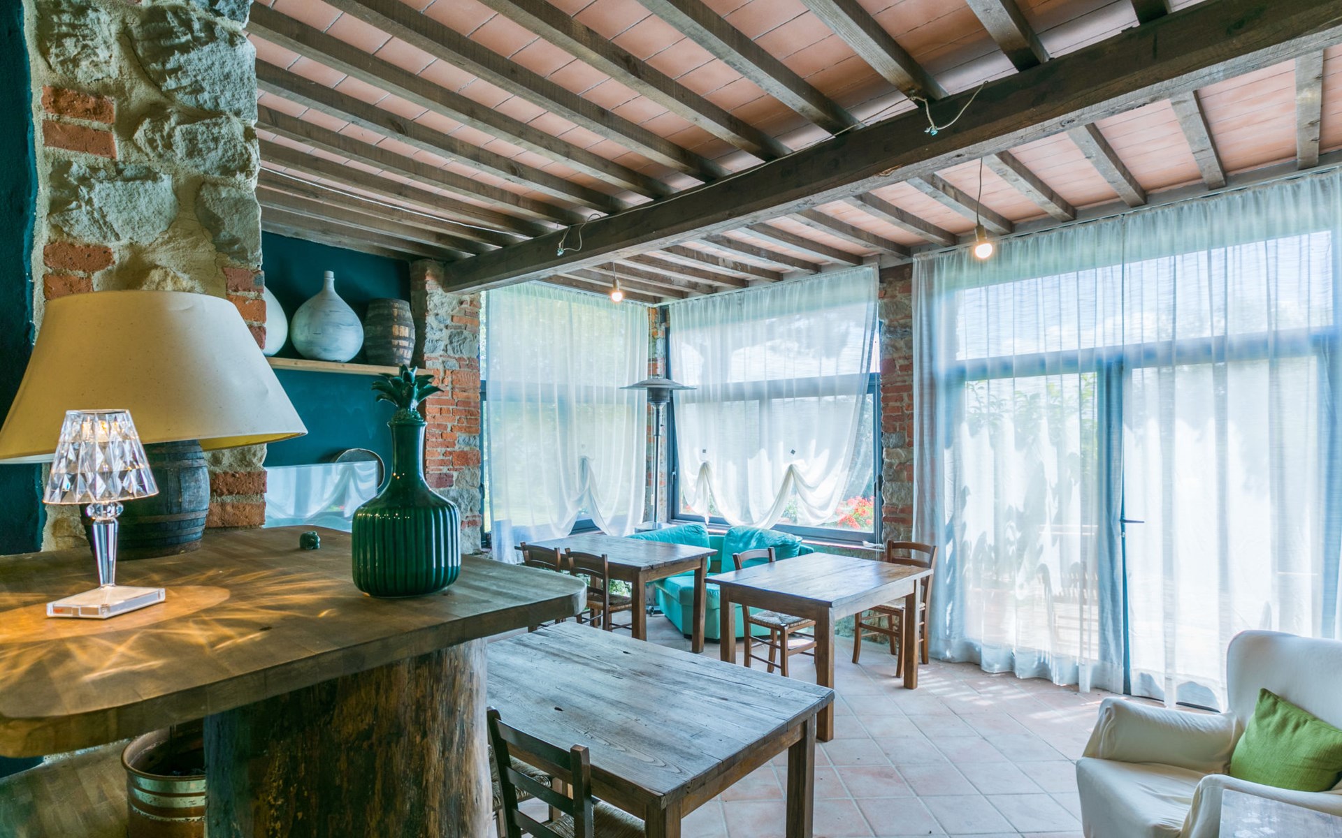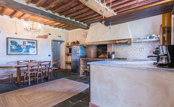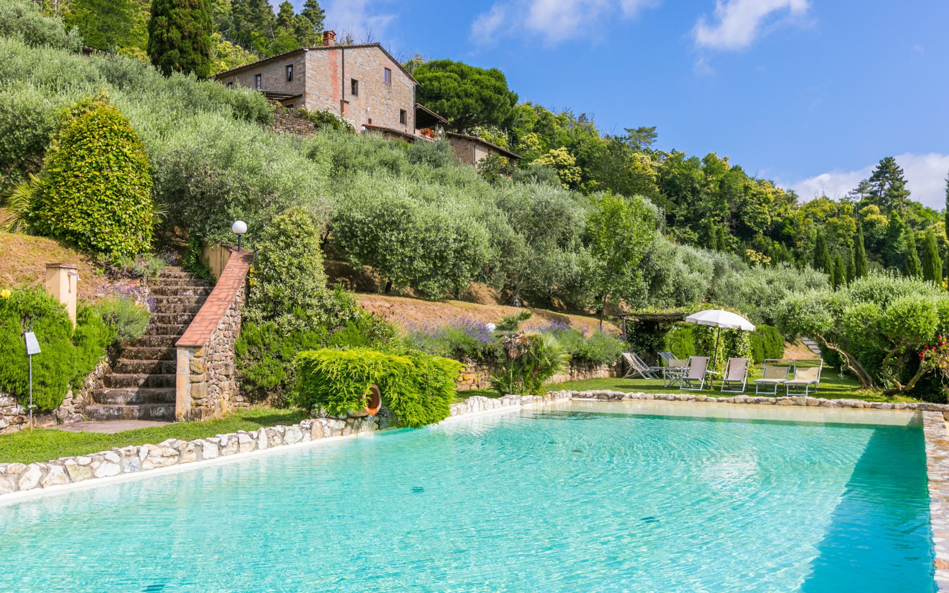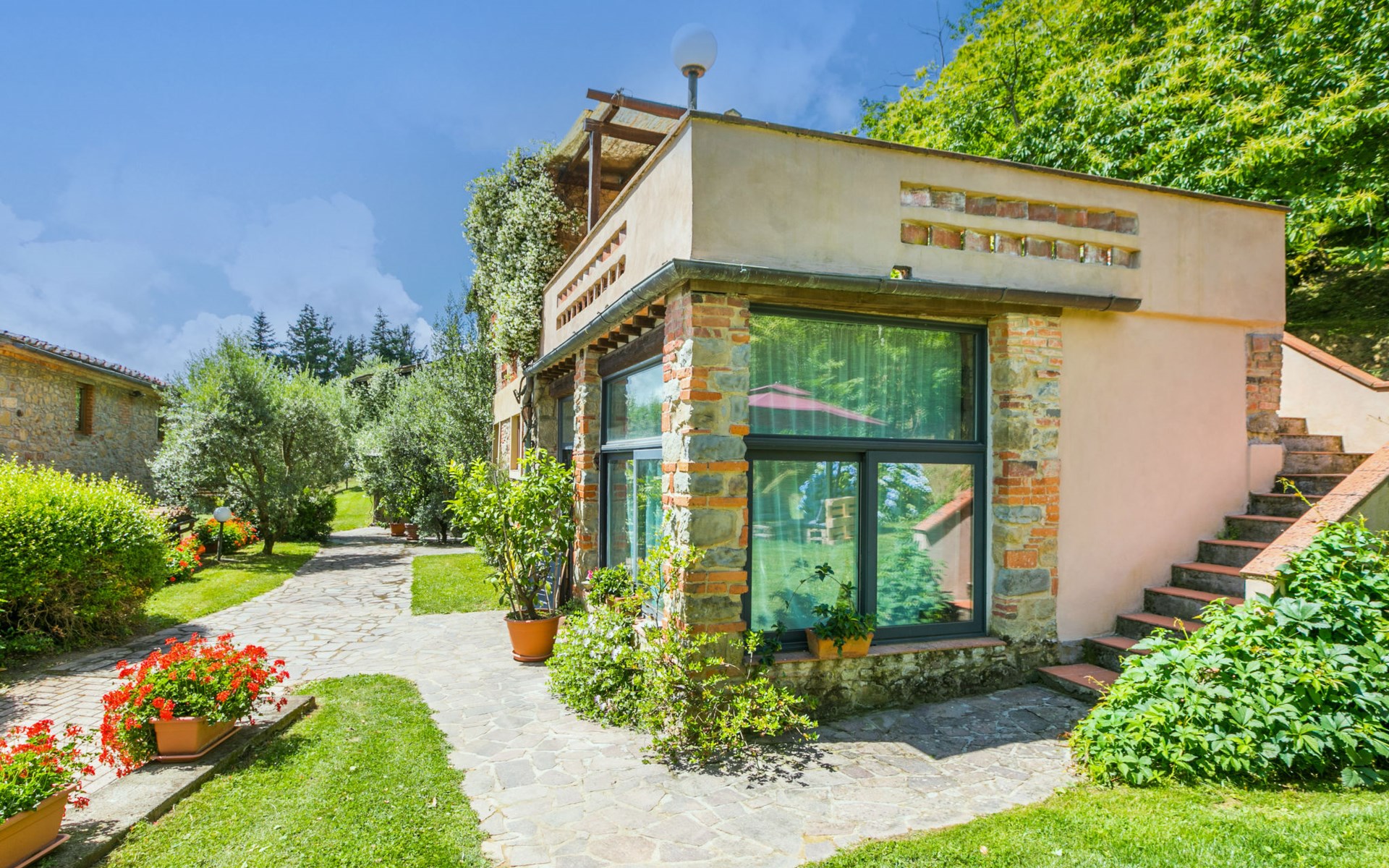 Agriturismo "La Cupola", 500 m a.s.l., surrounded by trees and vineyards. 3 houses in the residence. 4 apartments in the residence. 5.5 km from the centre of Pescia, 20 km from the centre of Lucca, 45 km from the centre of Pisa, in a secluded position on a slope, 57 km from the sea, in the countryside. For shared use: property 40'000 m2, terraced garden (not fenced) with plants, meadow, swimming pool (19 x 8 m, depth 120 - 160 cm, seasonal availability: 26.Apr. - 27.Sep.). Children's pool, pergola, garden furniture, barbecue. In the house: WiFi, central heating system, washing machine (for shared use), heating to be paid on the spot, heating available only from 01.Nov. - 30.Mar.. 600 m long steep motor access (via unmade road). Parking on the premises. E-charging station. Supermarket 5.5 km, bus stop 3 km, sandy beach "Viareggio" 57 km. Golf course (18 hole) 14 km. Nearby attractions: Collodi 9 km, Montecarlo 11 km, Montecatini Terme 13 km, Vinci, Pistoia 32 km, San Miniato 38 km. Residence with electric gates.