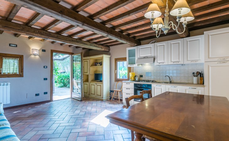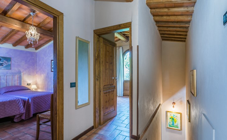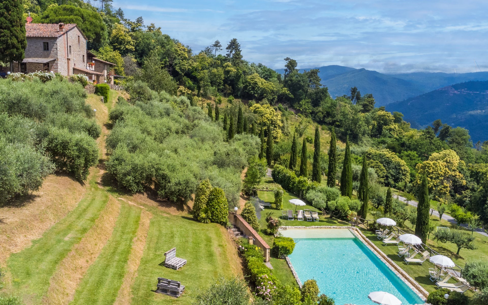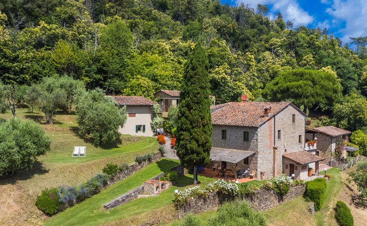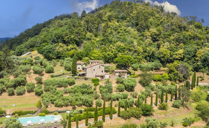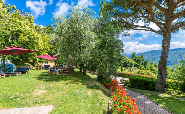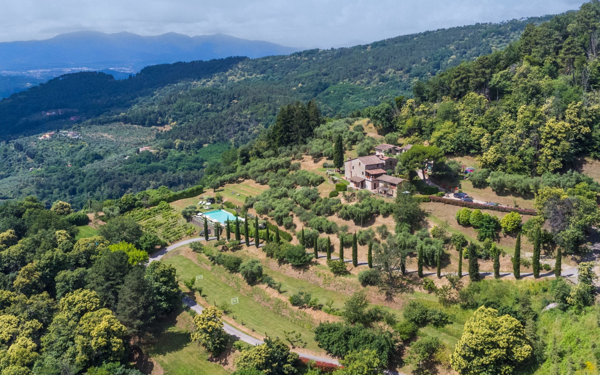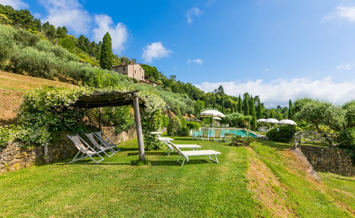 Agriturismo "La Cupola", 500 m a.s.l., surrounded by trees and vineyards. 3 houses in the residence. 4 apartments in the residence. 5.5 km from the centre of Pescia, 20 km from the centre of Lucca, 45 km from the centre of Pisa, in a secluded position on a slope, 57 km from the sea, in the countryside. For shared use: property 40'000 m2, terraced garden (not fenced) with plants, meadow, swimming pool (19 x 8 m, depth 120 - 160 cm, seasonal availability: 26.Apr. - 27.Sep.). Children's pool, pergola, garden furniture, barbecue. In the house: WiFi, central heating system, washing machine (for shared use), heating to be paid on the spot, heating available only from 01.Nov. - 30.Mar.. 600 m long steep motor access (via unmade road). Parking on the premises. E-charging station. Supermarket 5.5 km, bus stop 3 km, sandy beach "Viareggio" 57 km. Golf course (18 hole) 14 km. Nearby attractions: Collodi 9 km, Montecarlo 11 km, Montecatini Terme 13 km, Vinci, Pistoia 32 km, San Miniato 38 km. Residence with electric gates.