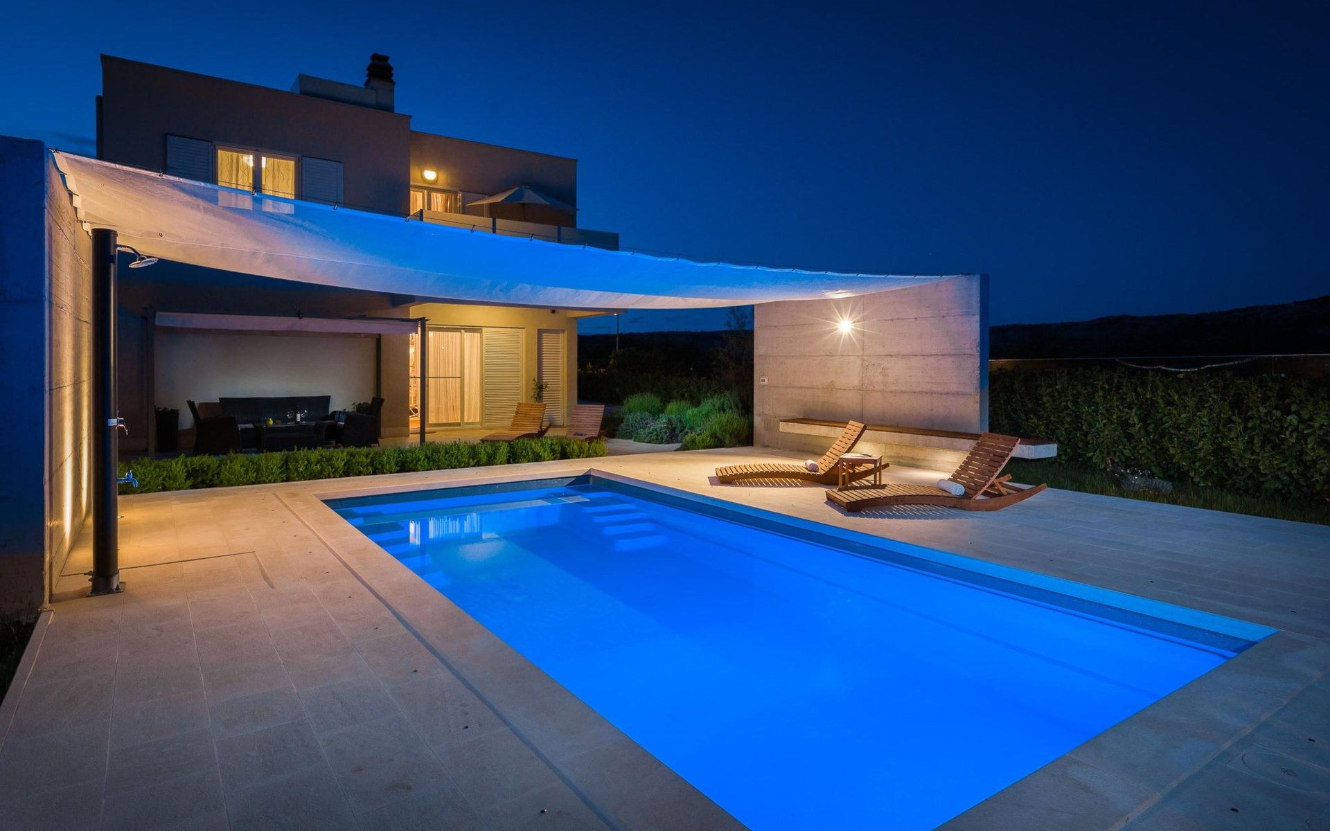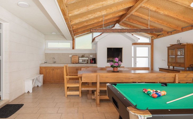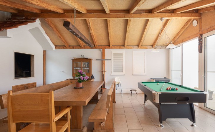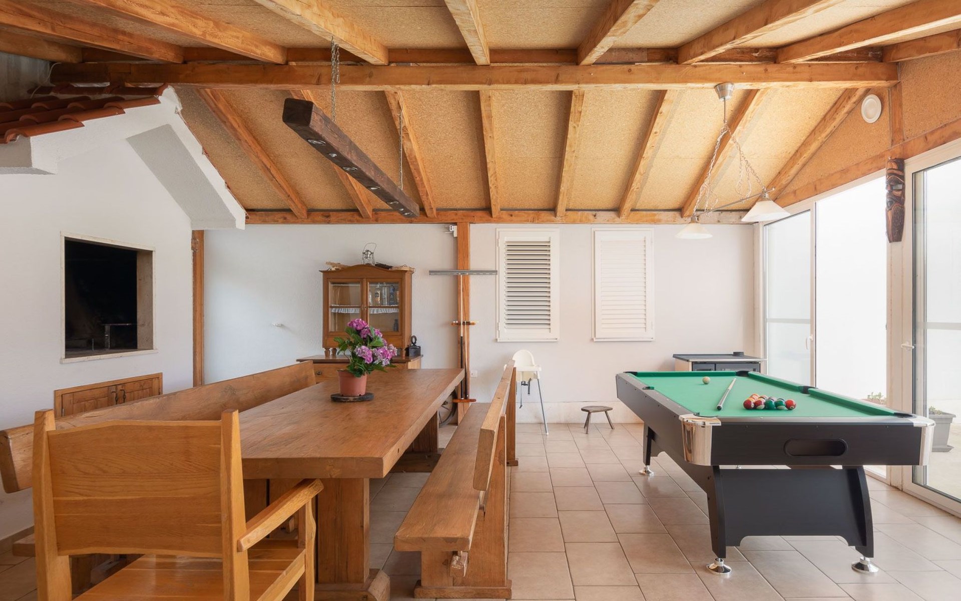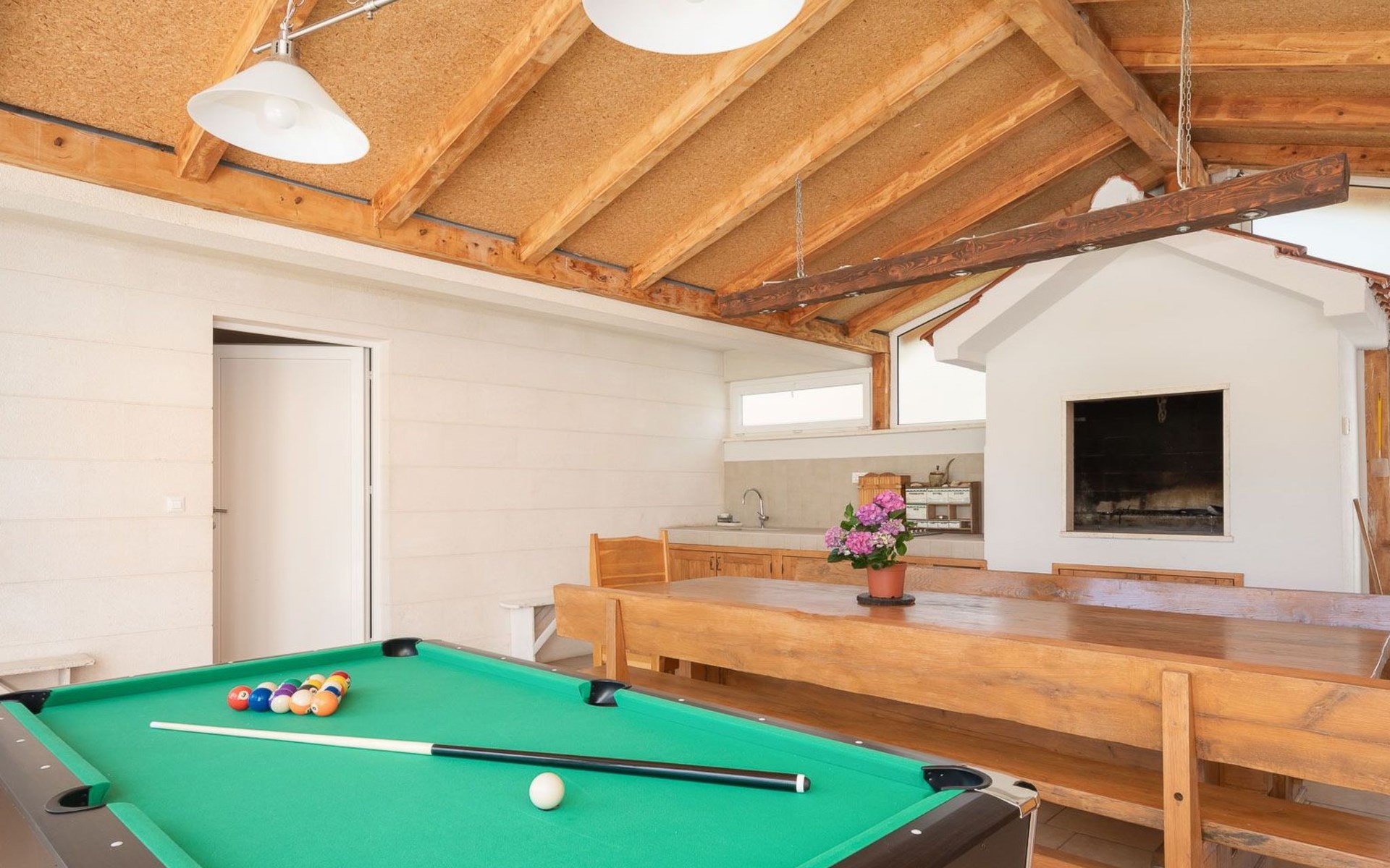 The Villa itself has two wings separated by a summer kitchen, each wing is completely independent, fully air- conditioned, completely equipped with all amenities you might need during your holiday, all together can accommodate 11 people. The summer kitchen is ideal for BBQ dinners „Al fresco“ and large familiy gatherings. The right villa wing on the ground floor has a bathroom, kitchen-dining-living area with direct acces to the terrace by the pool with lounge furniture. On the first floor there are two double bedrooms, each one with balcony and one bedroom for three persons. The left wing on the ground floor has a kitchen, living area with double sofa bed, one bathroom and one double „en suite“ bedroom, ideal for disabled people. On the first floor there is a two single bed bedroom, and a playroom with amusement games (PlayStation).