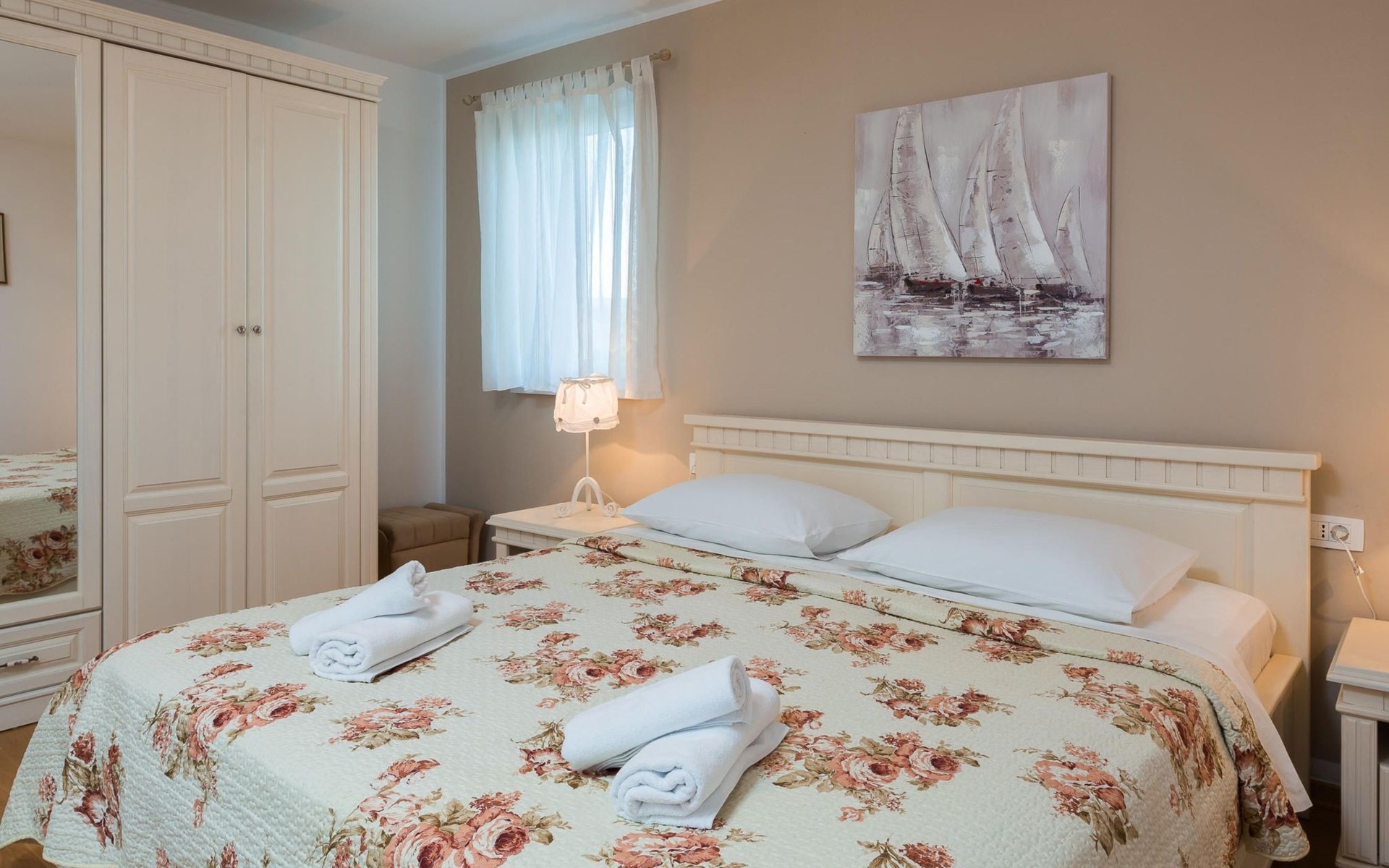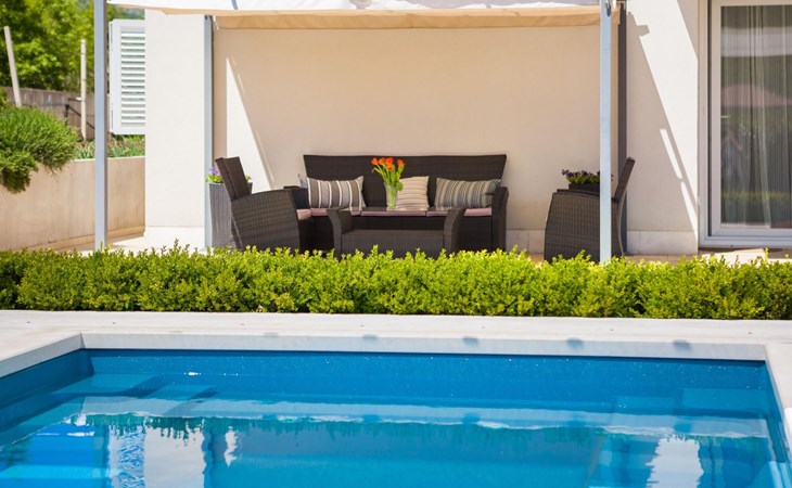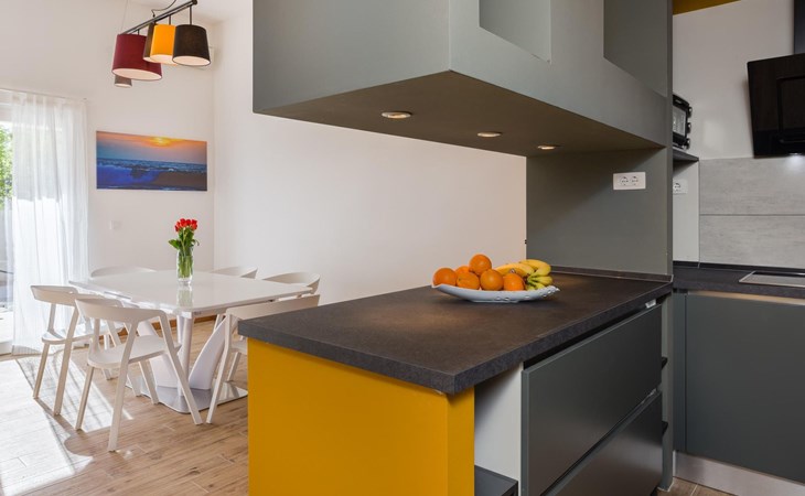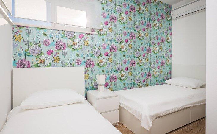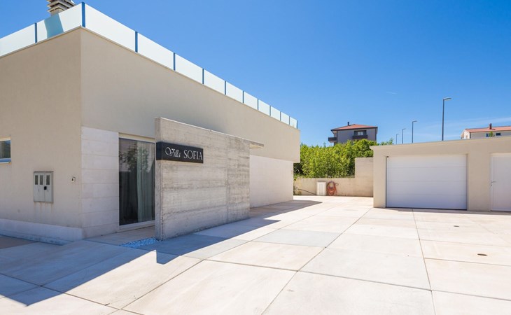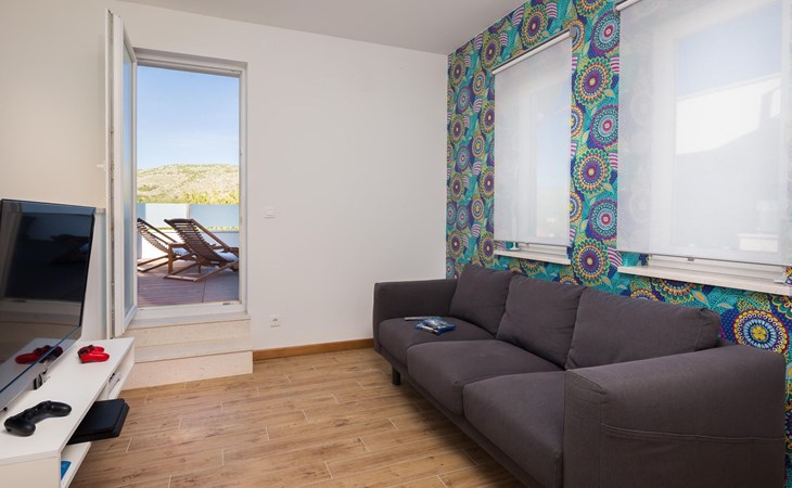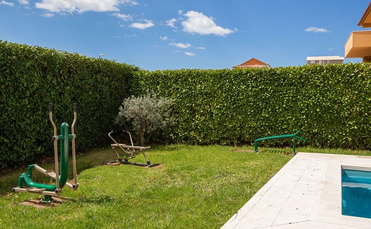 The Villa itself has two wings separated by a summer kitchen, each wing is completely independent, fully air- conditioned, completely equipped with all amenities you might need during your holiday, all together can accommodate 11 people. The summer kitchen is ideal for BBQ dinners „Al fresco“ and large familiy gatherings. The right villa wing on the ground floor has a bathroom, kitchen-dining-living area with direct acces to the terrace by the pool with lounge furniture. On the first floor there are two double bedrooms, each one with balcony and one bedroom for three persons. The left wing on the ground floor has a kitchen, living area with double sofa bed, one bathroom and one double „en suite“ bedroom, ideal for disabled people. On the first floor there is a two single bed bedroom, and a playroom with amusement games (PlayStation).