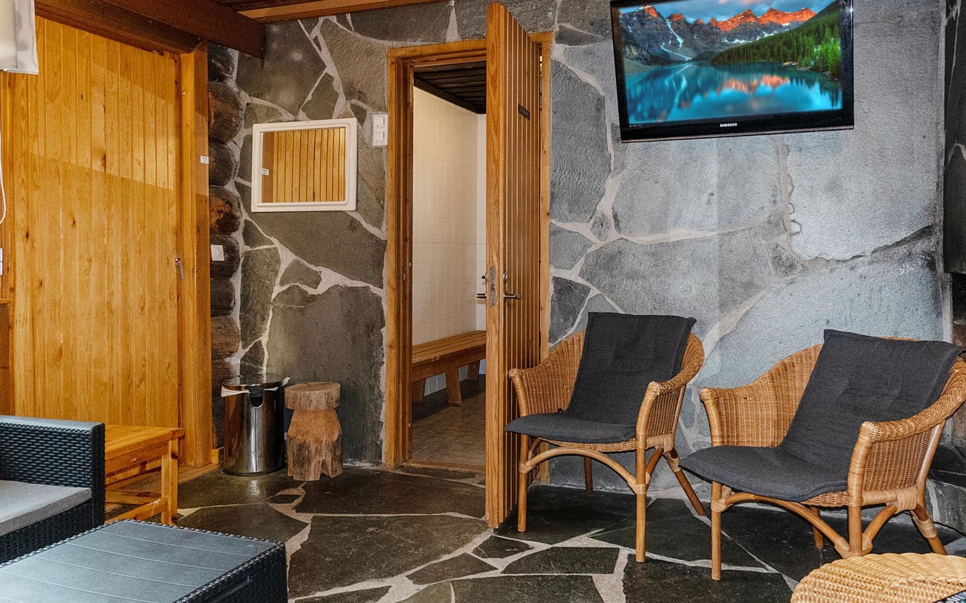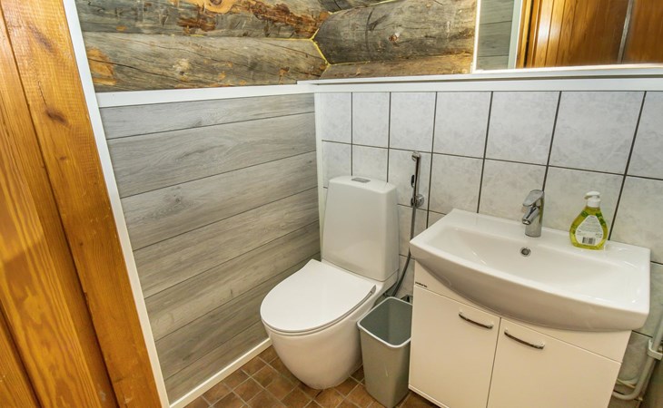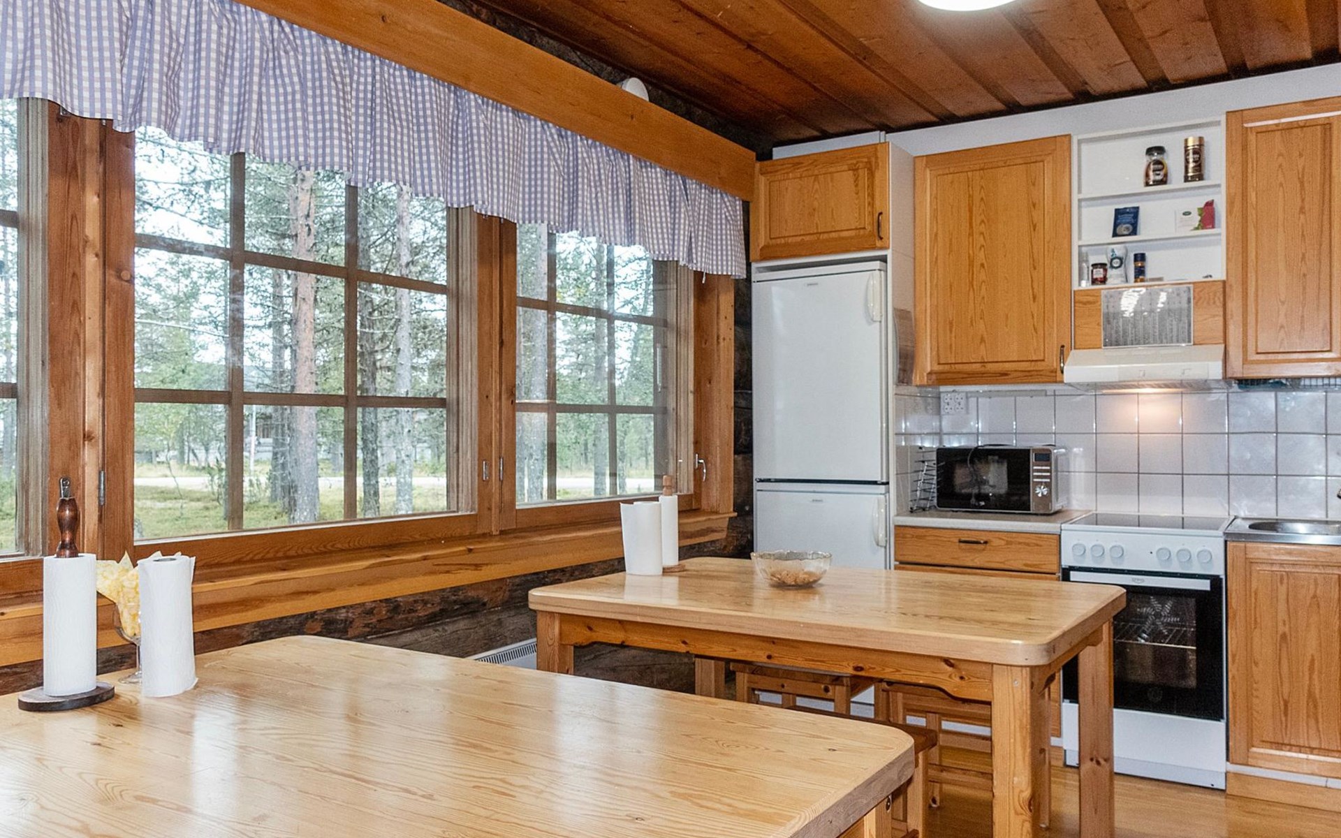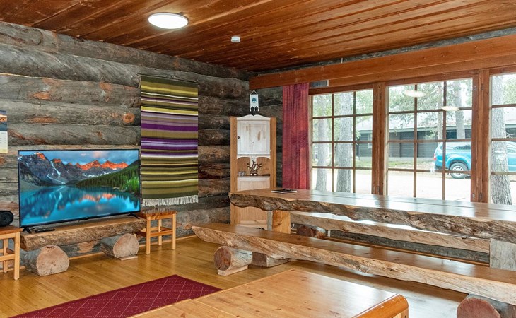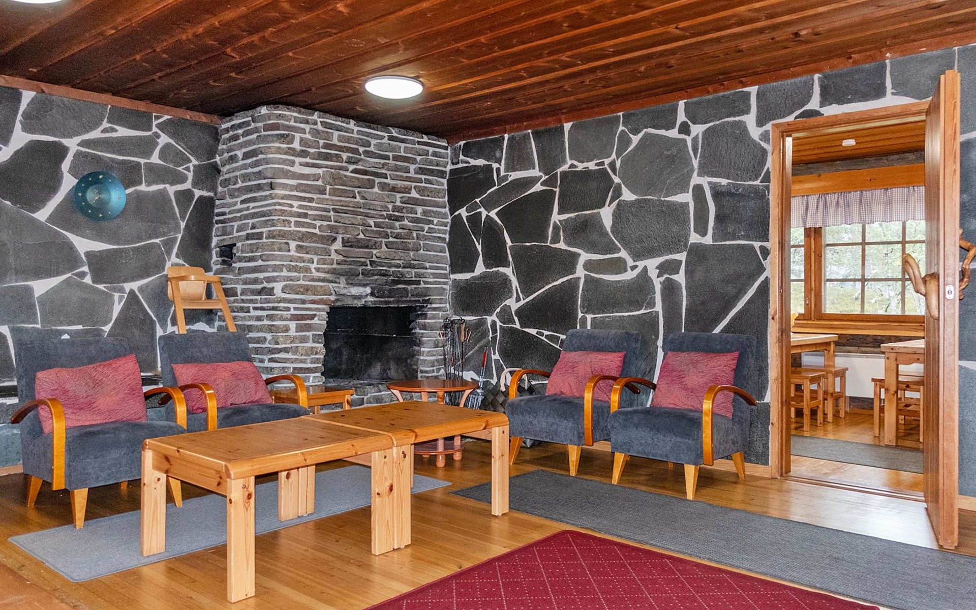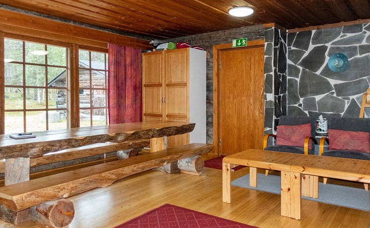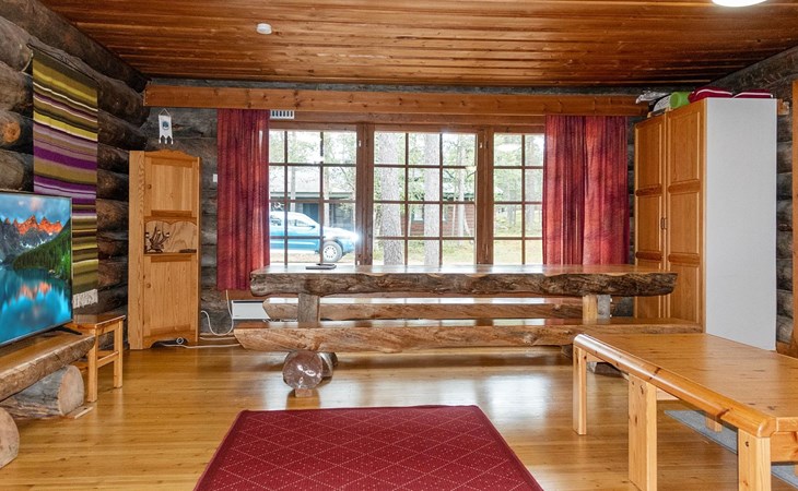 The cabin offers excellent kitchen, dining, and cold storage facilities. There are separate living and fireplace rooms, each with own fireplace and TV. Spacious sauna area with timer-controlled electric sauna stove is also available. Four WCs, one includes a shower cubicle. Technical room with two electric drying cabinets, drying rack, washing machine, and tumble dryer.