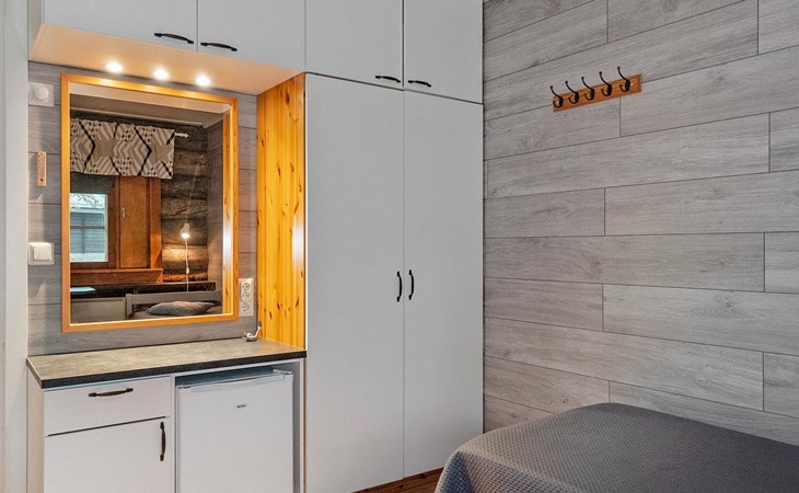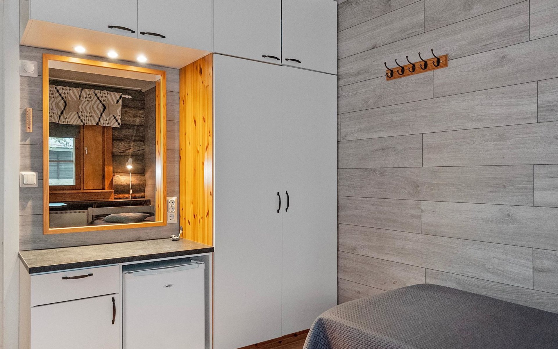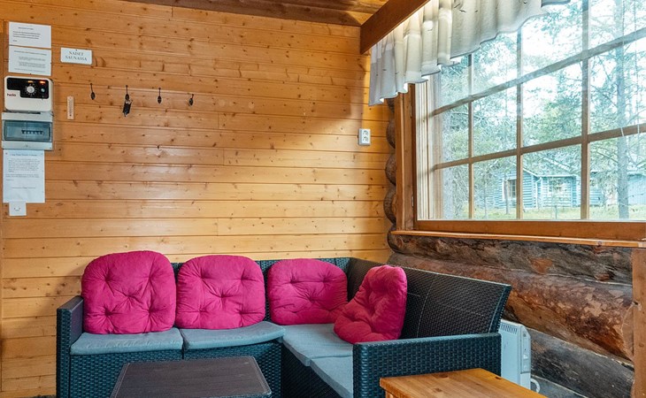 Outside, there is an outbuilding with a ski maintenance space and firewood storage. The parking places with wall outlets are also outside near the cabin.
