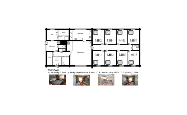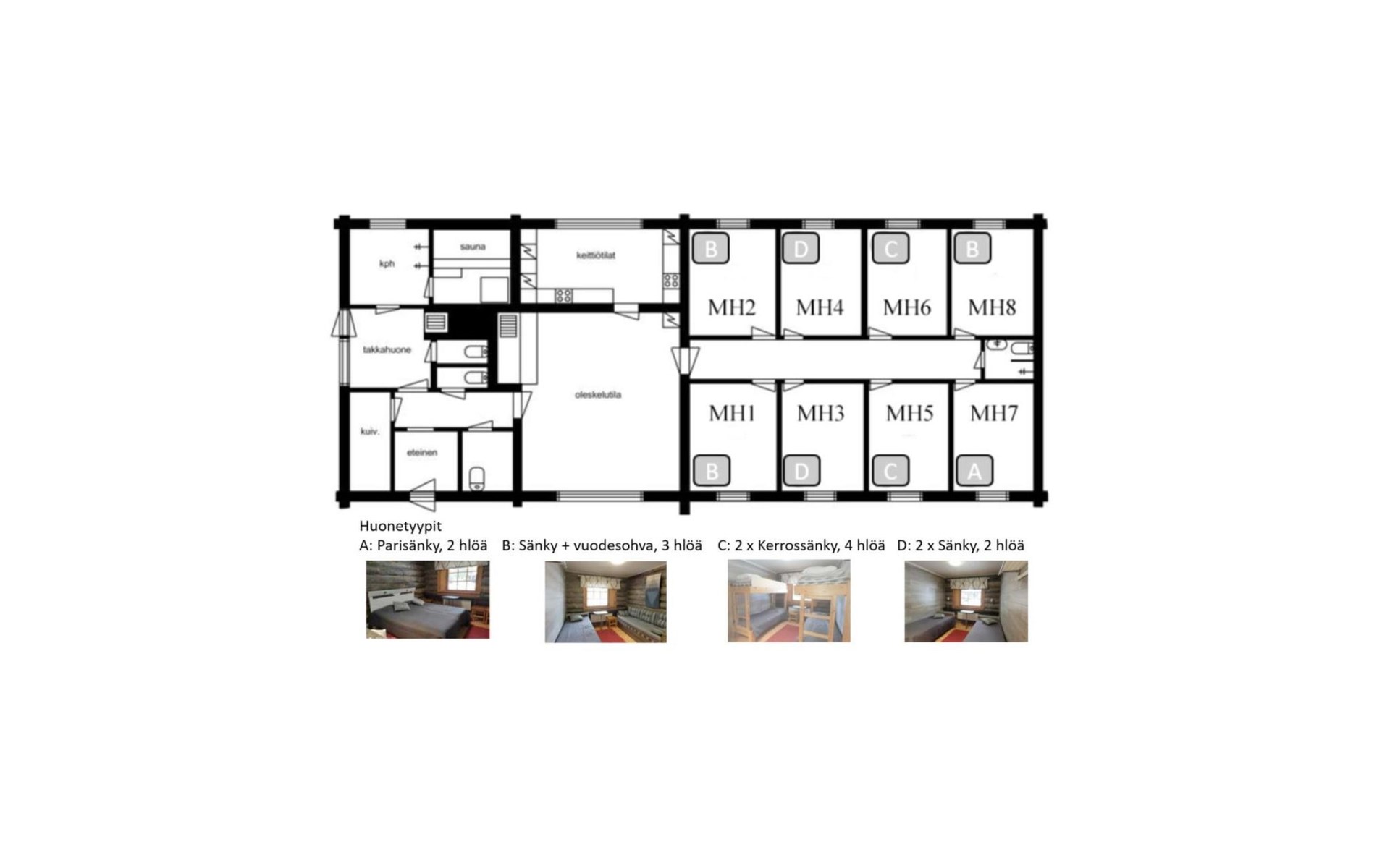 It offers space for up to 22 people and provides sleeping places and tableware for all. There are 8 bedrooms available, ranging in capacity from 1 to 4 people. Three of them have sofa beds and normal beds, two have two single beds, two have bunk beds, and one has a double bed. Each bedroom is equipped with a small refrigerator.