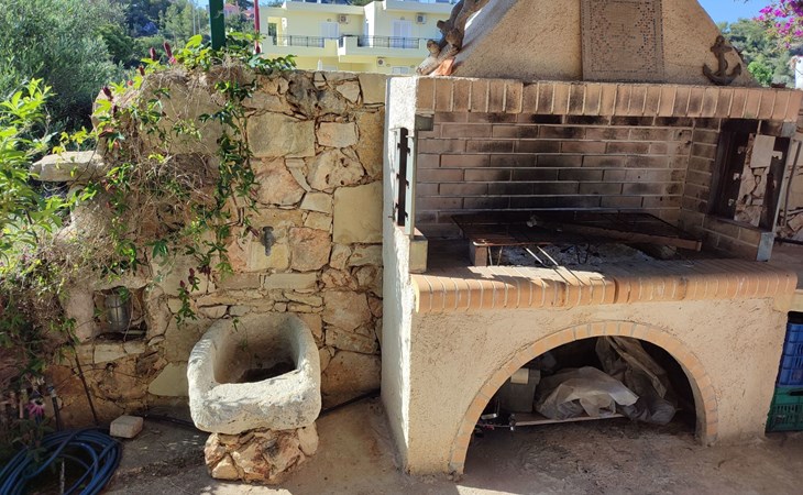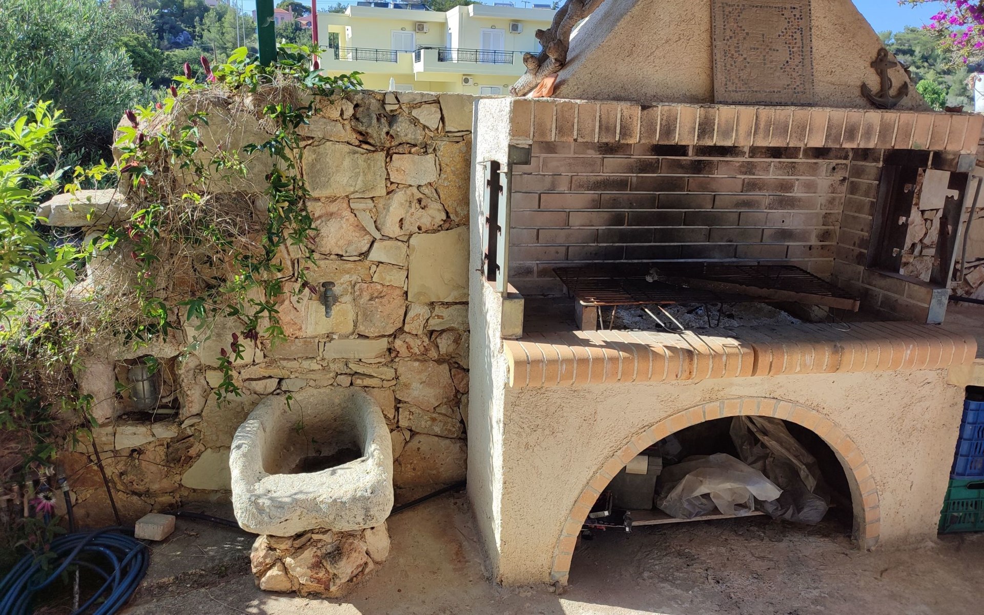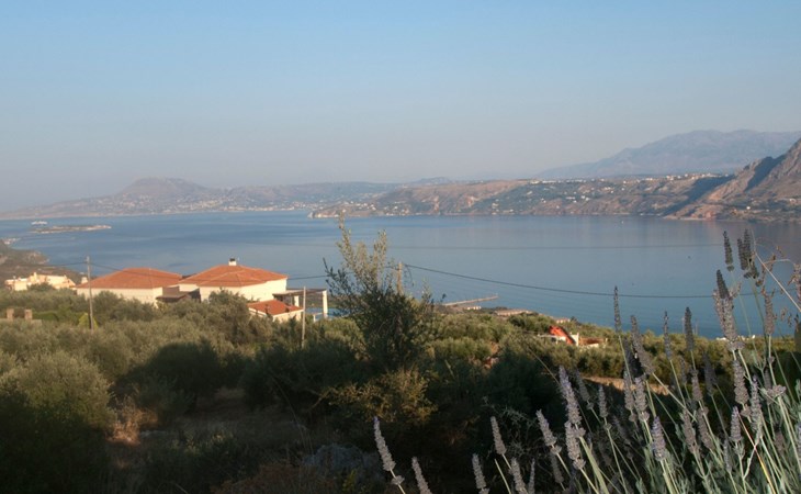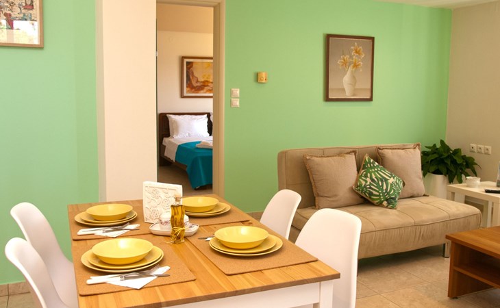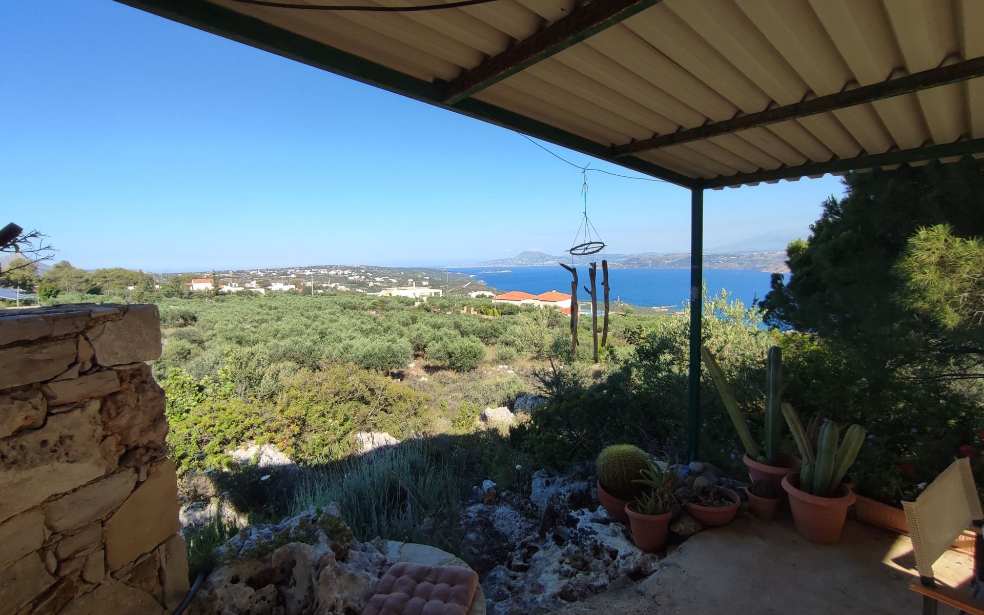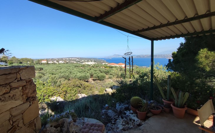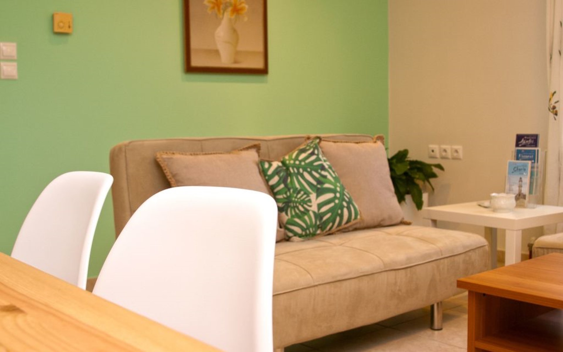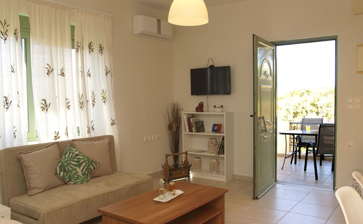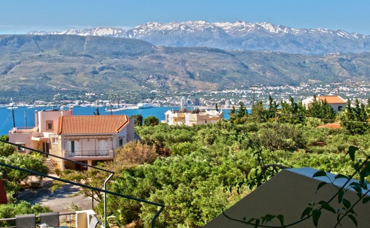The building is on top of a rock, and the apartment is right under the house where our family lives, in a private area of 4 acres full of trees, shrubs, herbs and wildflowers of the local flora. It's placed on a sloping hillside rock, facing Souda Bay. A small private street,70 meters long,leads to a spacious parking lot, and at its side there is a small staircase, wich leads to the balcony and the front door of the appartment.There is one bedroom, a living room, a well equiped cuisine and one bathroom. The bedroom has a double bed, and the living room consists of two sofa-beds.The house is equipped with everything including a full household as well as what you may need for your personal care. It's suitable for children.