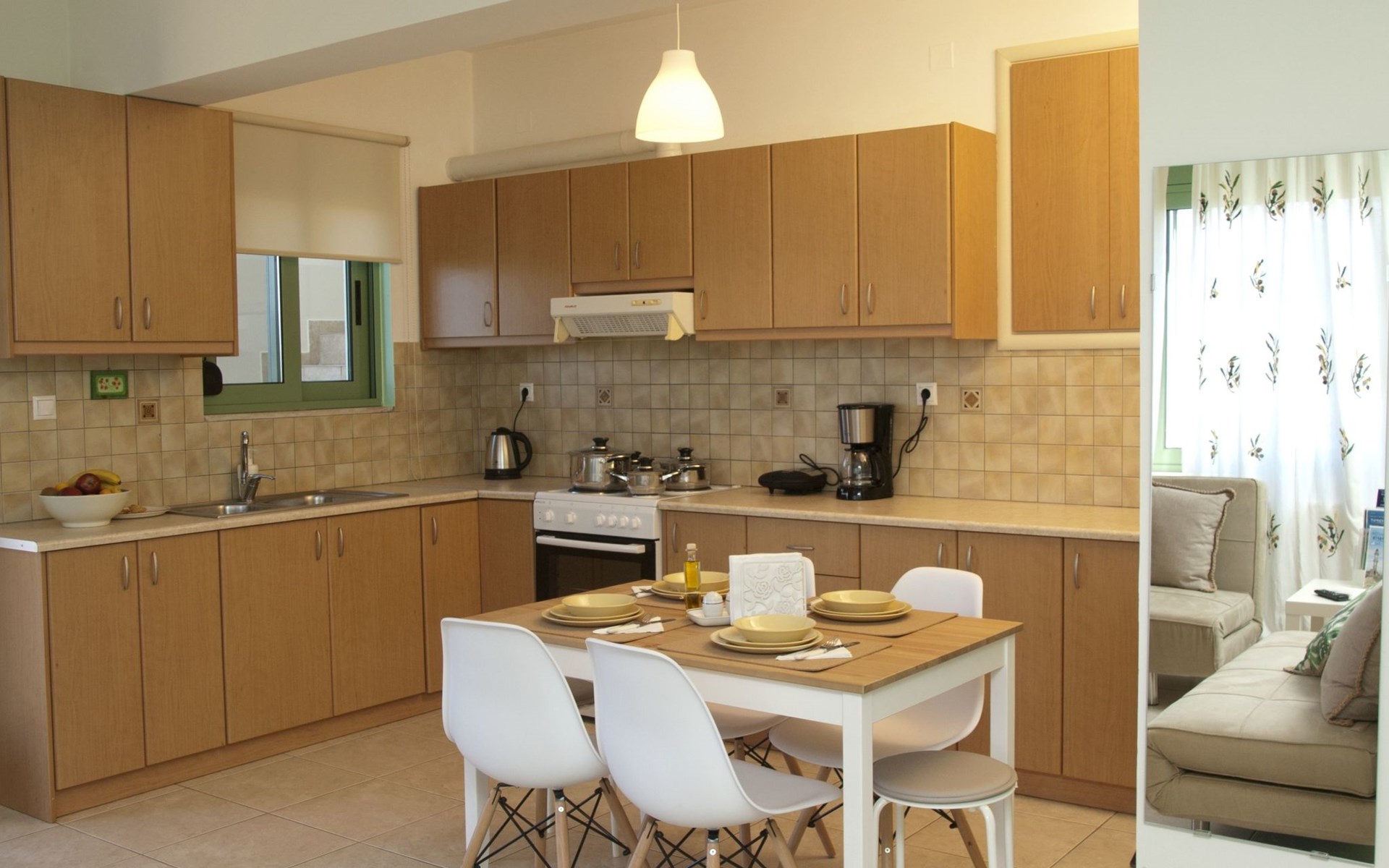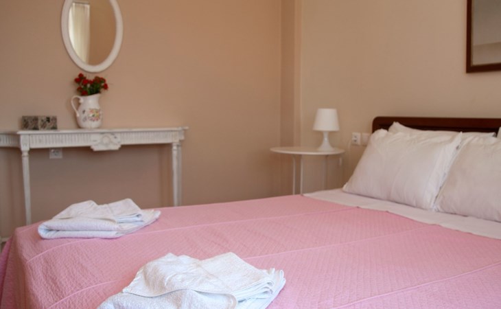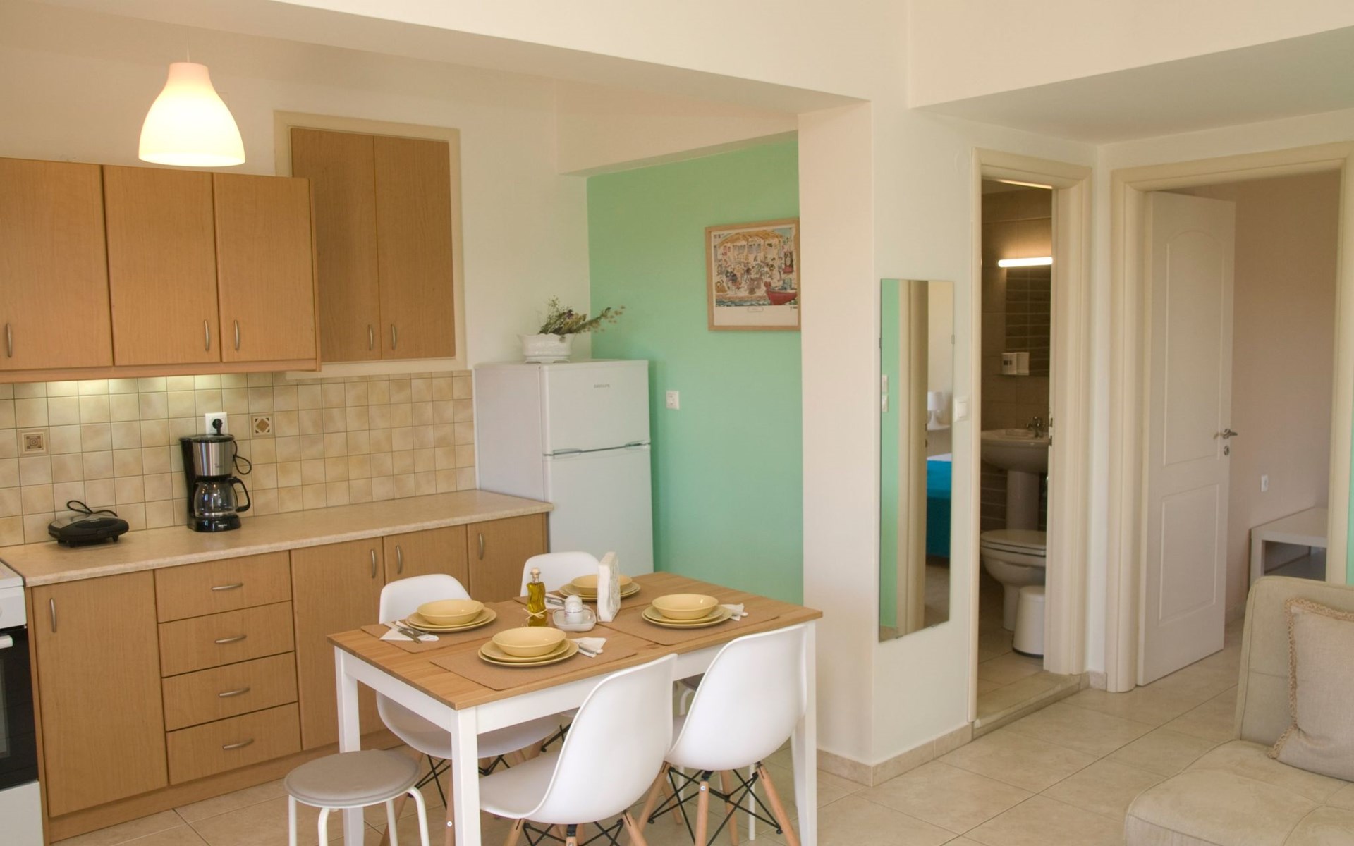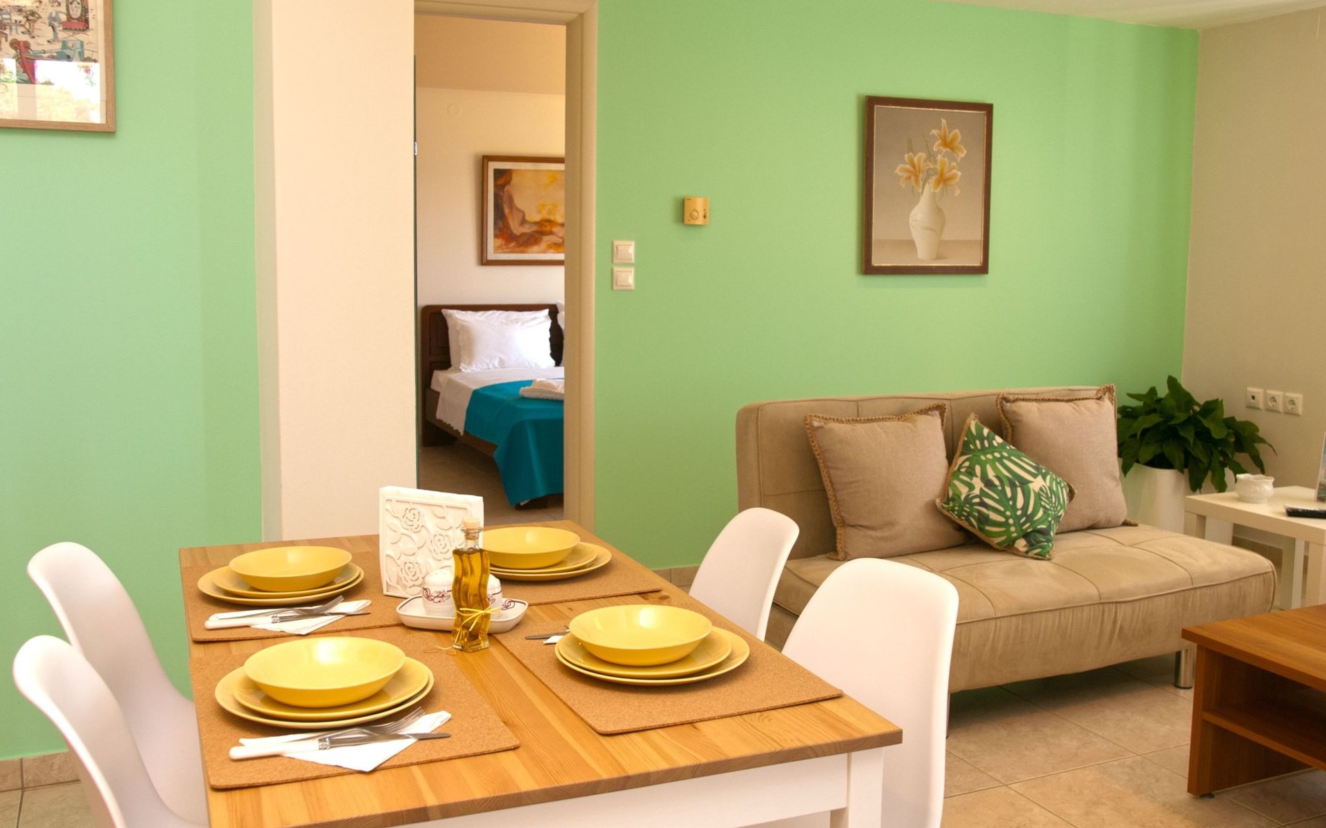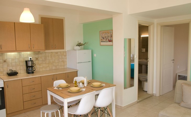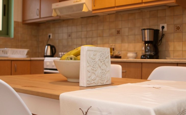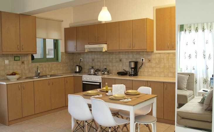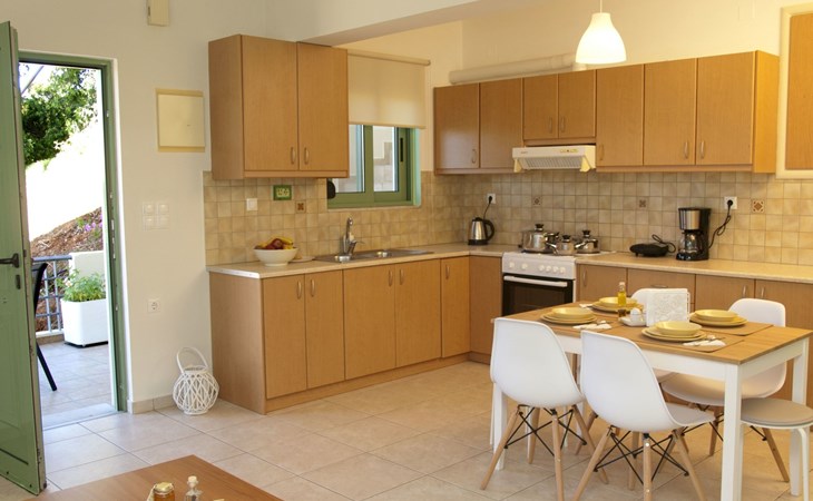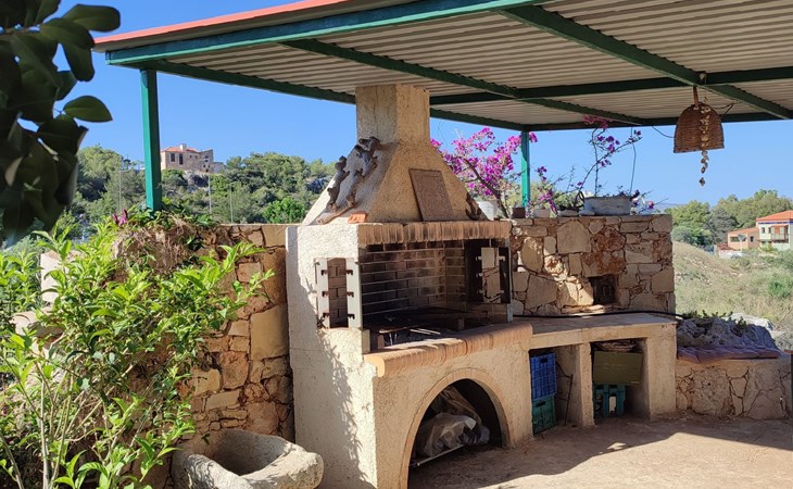 The building is on top of a rock, and the apartment is right under the house where our family lives, in a private area of 4 acres full of trees, shrubs, herbs and wildflowers of the local flora. It's placed on a sloping hillside rock, facing Souda Bay. A small private street,70 meters long,leads to a spacious parking lot, and at its side there is a small staircase, wich leads to the balcony and the front door of the appartment.There is one bedroom, a living room, a well equiped cuisine and one bathroom. The bedroom has a double bed, and the living room consists of two sofa-beds.The house is equipped with everything including a full household as well as what you may need for your personal care. It's suitable for children.