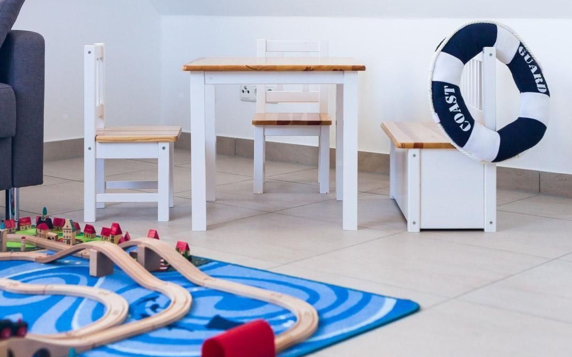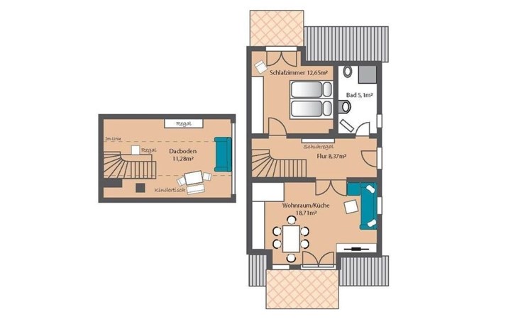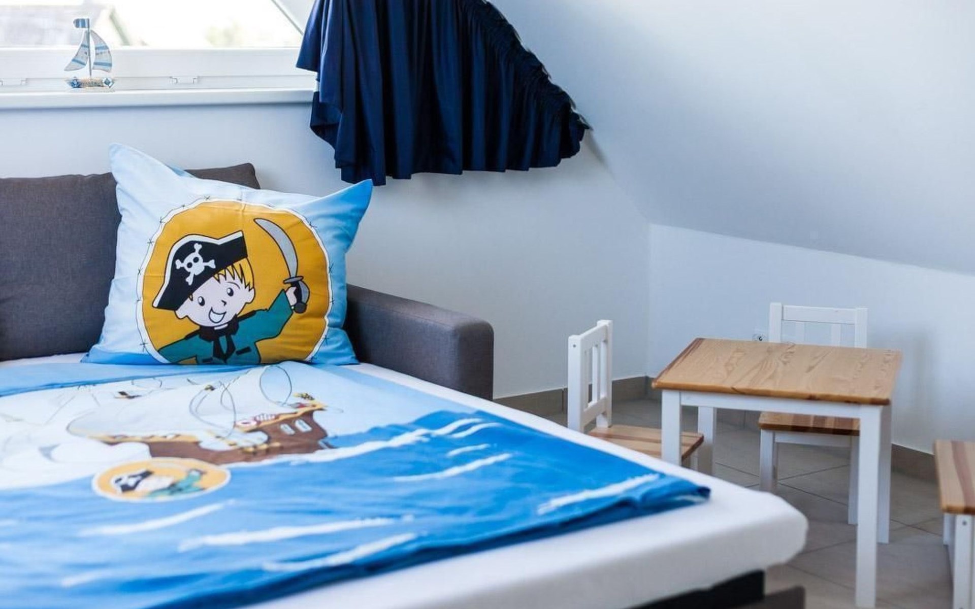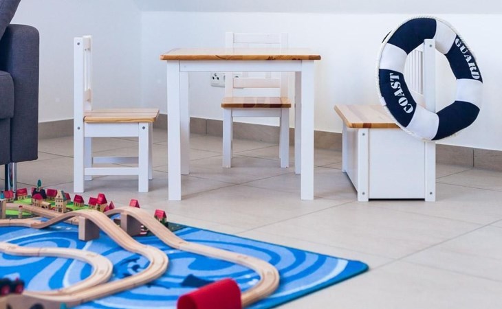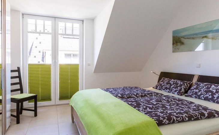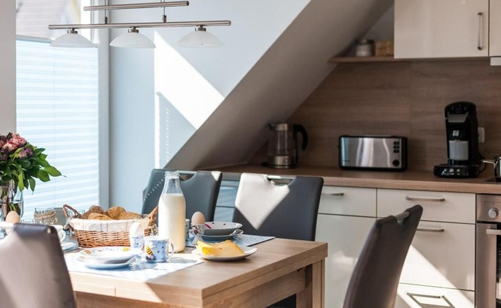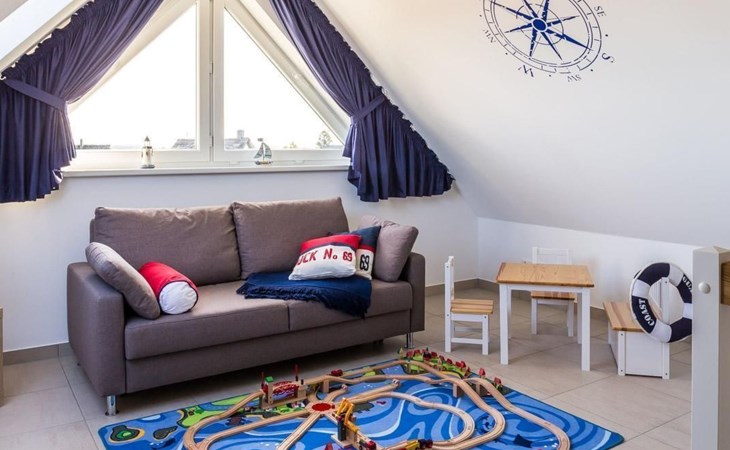 The maisonette with under-floor heating can accommodate up to four people. It has a separate bedroom with a double bed (180 x 200cm). The modern, open living and dining room is also on the first floor. The living room provides a sofa bed with a sprung mattress and a flatscreen TV. This floor also has a bathroom with a walk-in shower and a towel radiator. Stairs in the hallway lead up to the generous, open sleeping gallery on the second floor suitable for children. It also has a pull-out sofa. Children have also been taken into consideration and a travel cot, highchair and bottle warmer are available free of charge. The second floor can be secured by a gate. The apartment has been classified as three-star by the DTV.