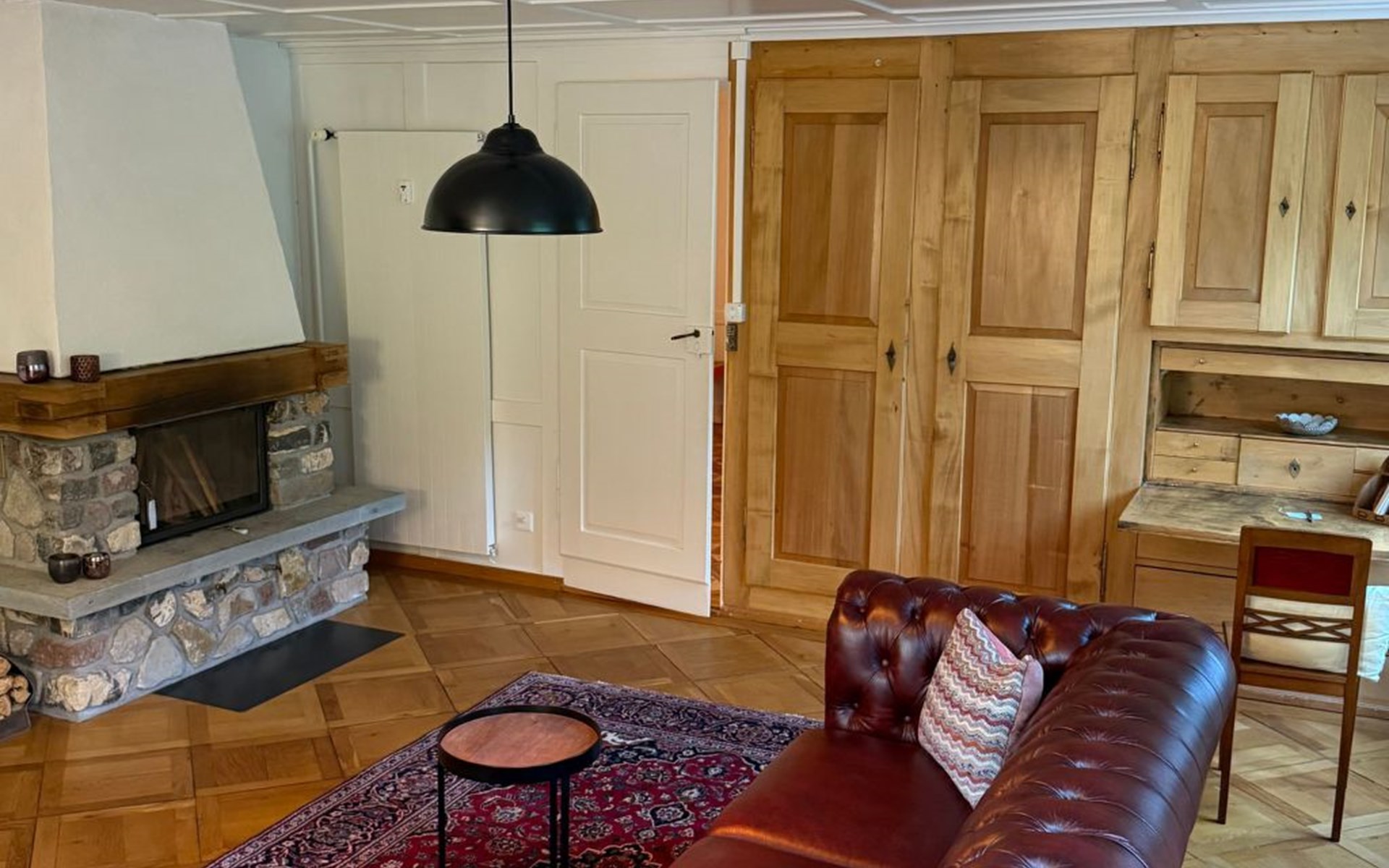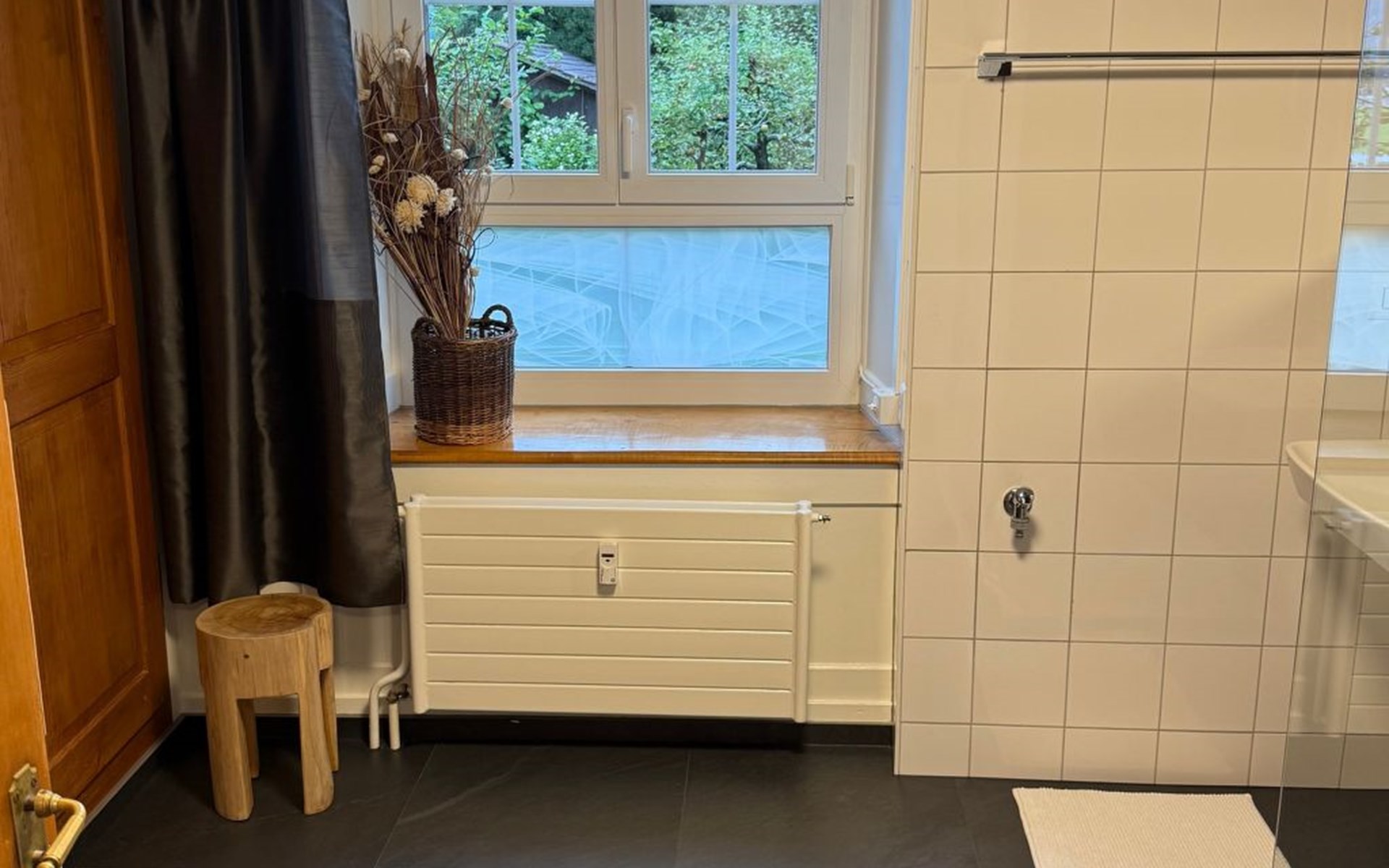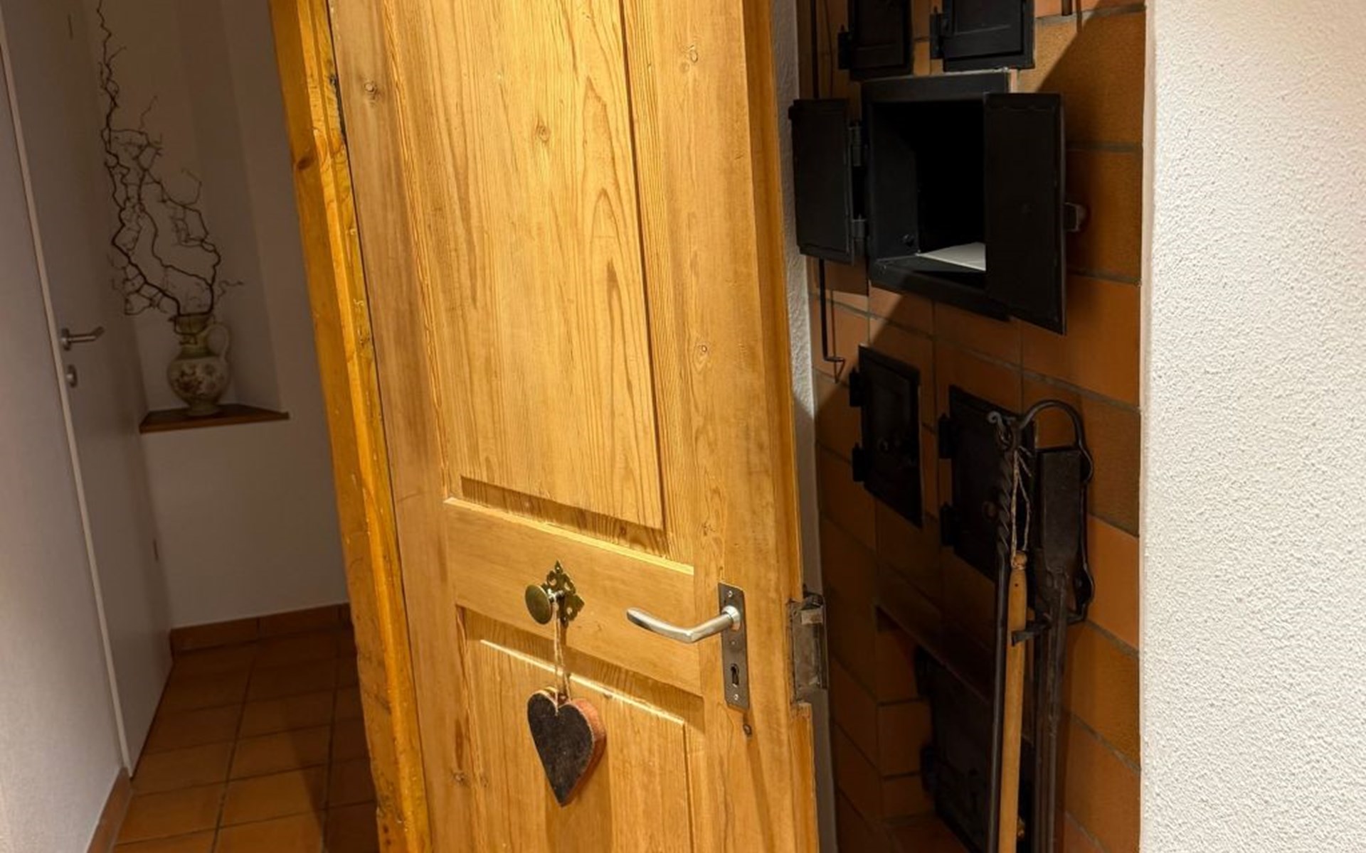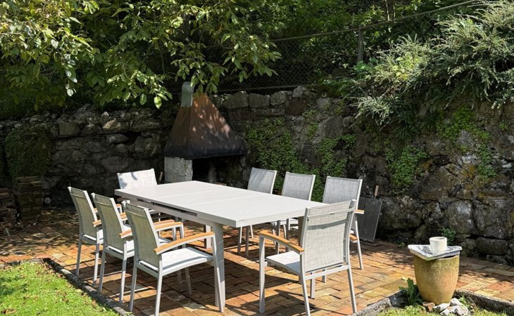 Outdoors, the private garden is a highlight for both children and adults. Apple trees, a swing, and climbable trees invite little adventurers to play, while grown-ups can enjoy relaxed evenings at the beautiful outdoor fireplace and grill. Though the house lies along a street, the garden feels sheltered and calm, with views of the surrounding mountains and quick access to the mountain forest.