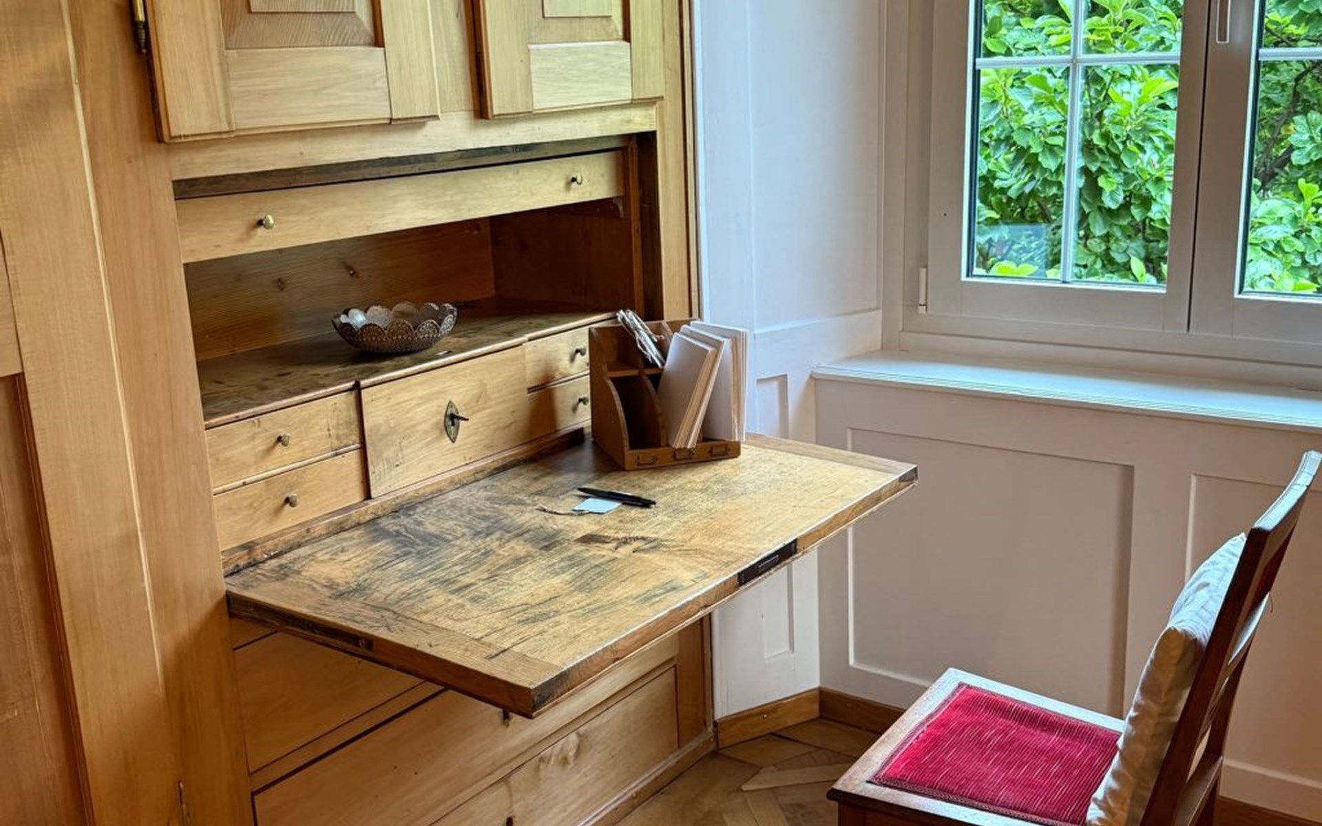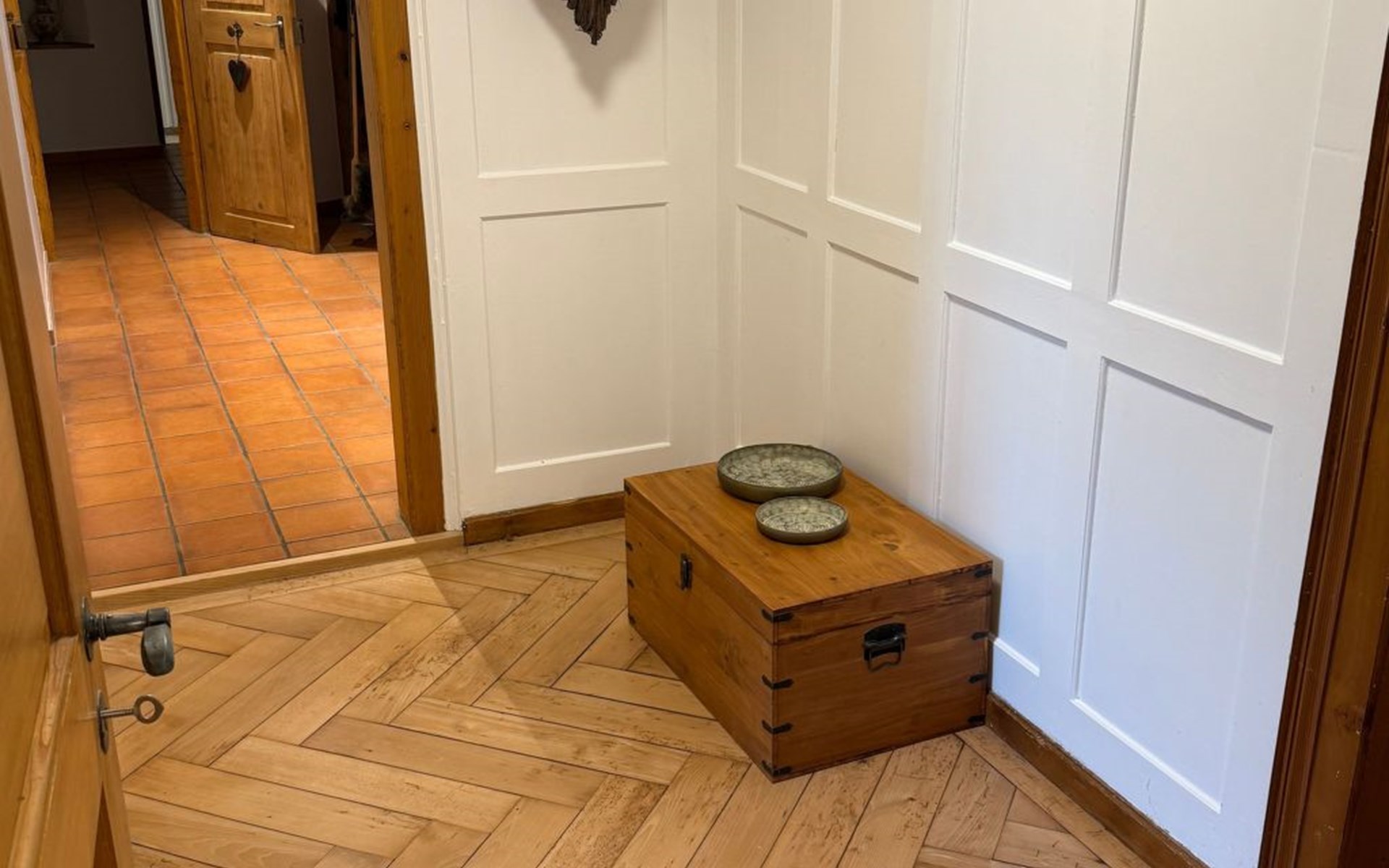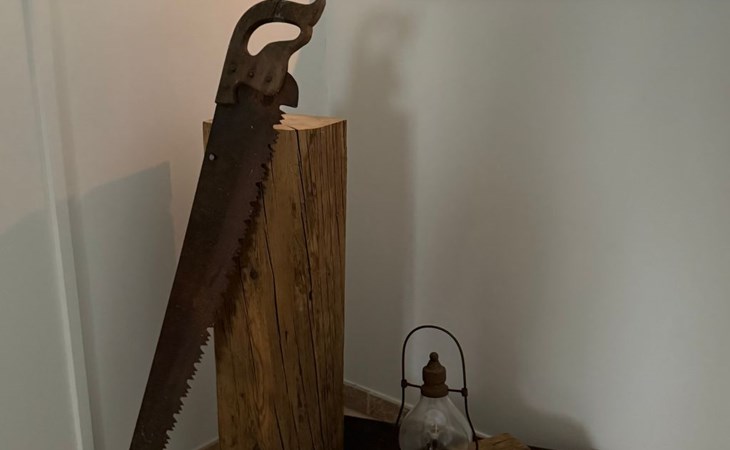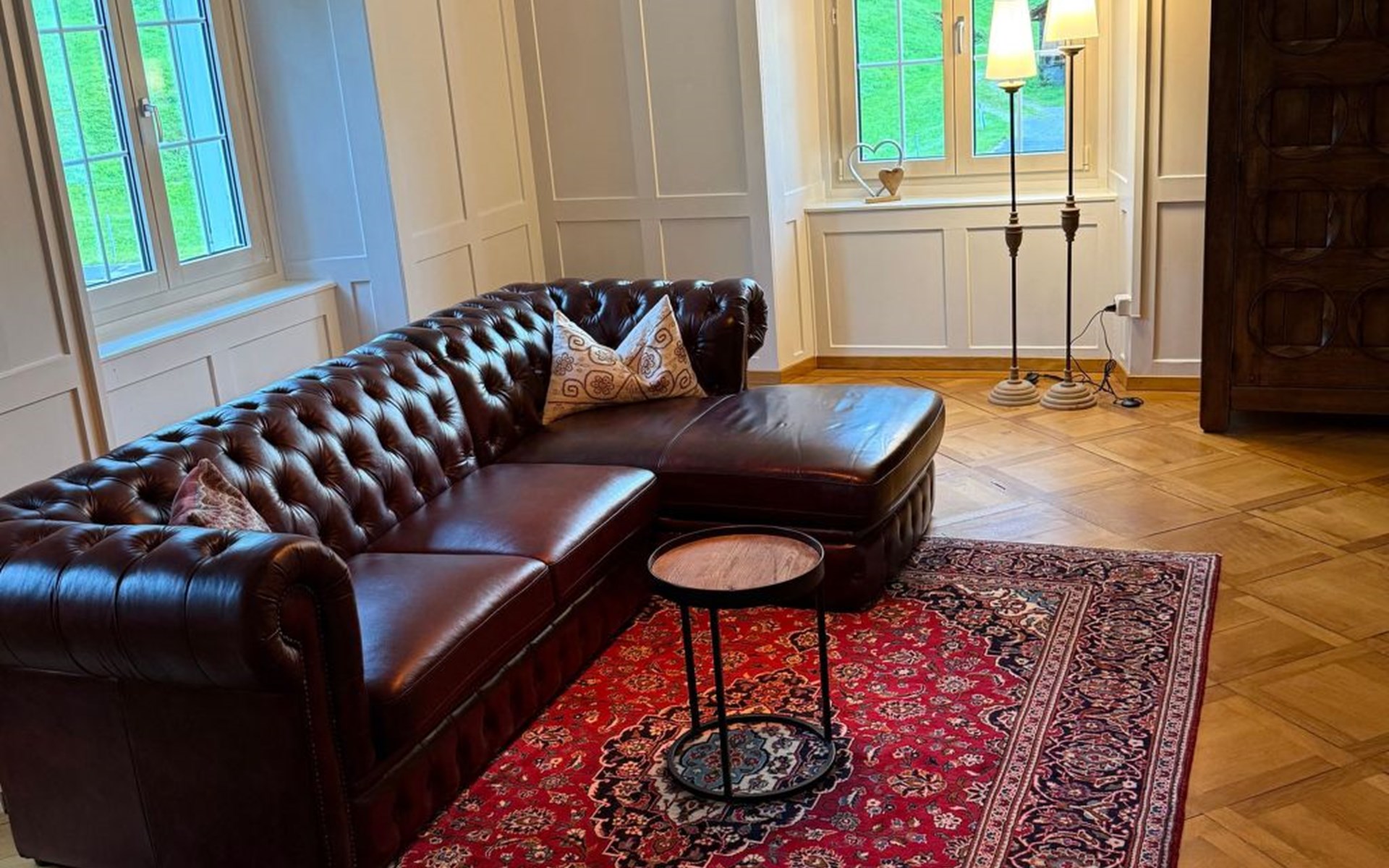 Outdoors, the private garden is a highlight for both children and adults. Apple trees, a swing, and climbable trees invite little adventurers to play, while grown-ups can enjoy relaxed evenings at the beautiful outdoor fireplace and grill. Though the house lies along a street, the garden feels sheltered and calm, with views of the surrounding mountains and quick access to the mountain forest.
