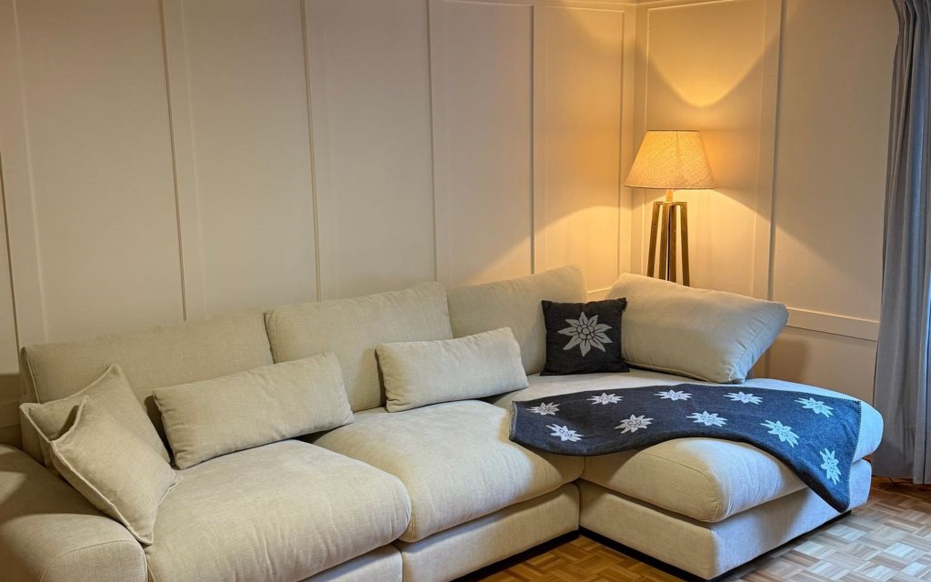 The apartment extends across the first floor on one side and flows into a private garden on the other. With three bedrooms and three toilets, the home offers plenty of room and privacy — ideal for families and groups traveling together. Two bathrooms, featuring both a walk-in shower and a bathtub, provide comfort after a day of activity. A fully equipped kitchen with induction hob, capsule coffee machine, and dishwasher makes cooking easy, while a traditional cheminée in the living room creates a cozy gathering place.