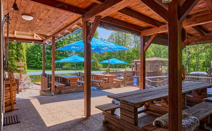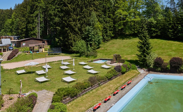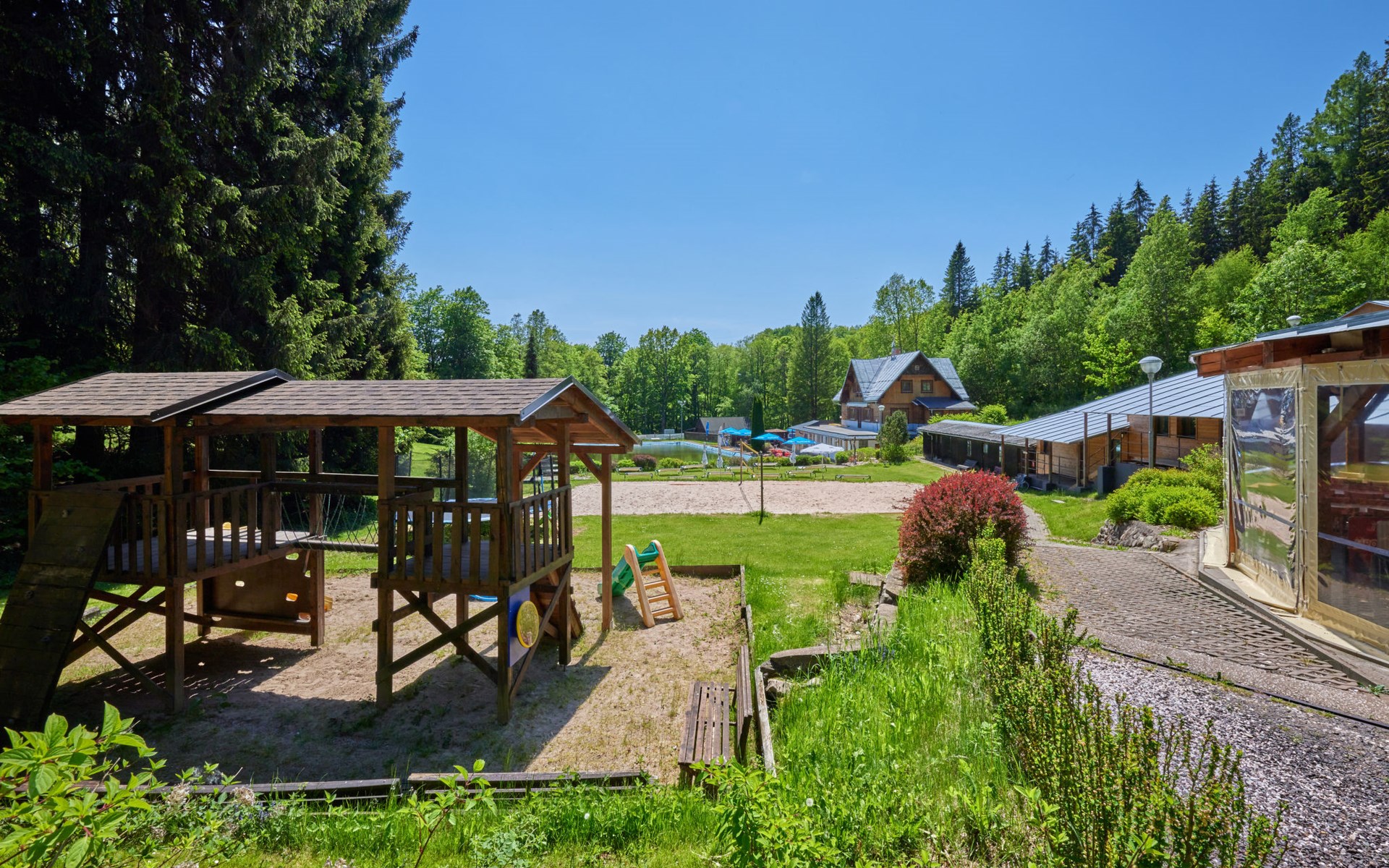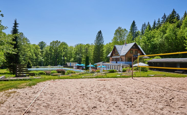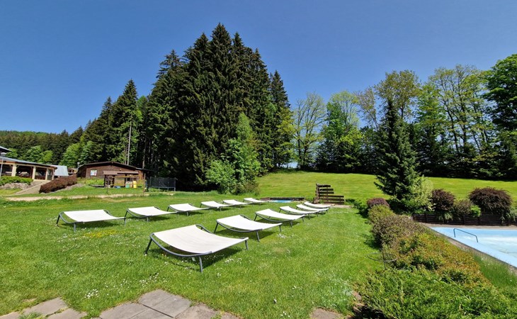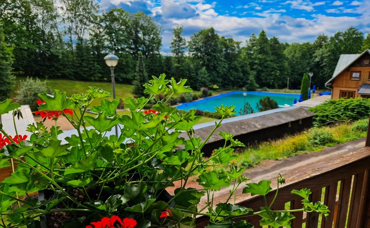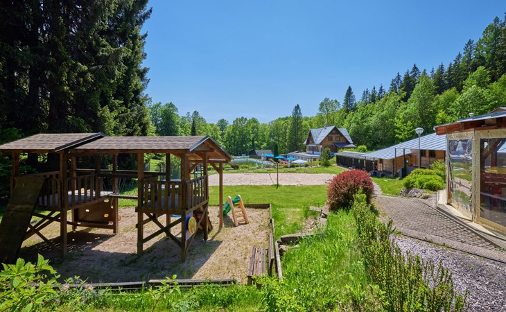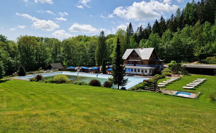 Comfortable house. 7 houses in the resort. Outside the resort, in a quiet, sunny position, 50 m from the edge of the forest, 2 km from the skiing area. For shared use: natural state property, lawn for sunbathing, swimming pool (seasonal availability: 26.Jun. - 03.Sep.). Shower/WC in the pool area, table tennis, boccia, badminton, beach volleyball, barbecue, fireplace. Private: patio. In the house: storage room for bicycles, sun terrace. Parking at the house. Grocery 1.5 km, shopping centre 6 km, restaurant 5.5 km, bus stop "Mladé Buky" 1.5 km, railway station "Mladé Buky" 1.5 km, indoor swimming pool 10 km. Golf course (18 hole) 4 km, riding stable 3.5 km, walking paths from the house, cycle lane 50 m, ski rental 2.5 km, ski bus stop 50 m, ski school 2.5 km, children's ski school 2.5 km, sled run 2 km, cross country ski track 500 m, children's playground 50 m. Nearby attractions: zábavní park Baldův svět, 2.5 km, Rozhledna Eliška, tvrz Stachelberg 9 km, Stezka Korunami stromů Janské Lázně 10 km, Lanovka na Sněžku, Pec pod Sněžkou 18 km, Zoo Dvůr Králové, Adršpach 28 km, Vyhlídkové lety Vrchlabí, Kuks 30 km. Well-known ski regions can easily be reached: Mladé Buky 2 km, Janské Lázně 9 km, Černý Důl, Pec-Černá hora 15 km. Hiking paths: Krkonošský národní park. Please note: the photograph shows a typical example.