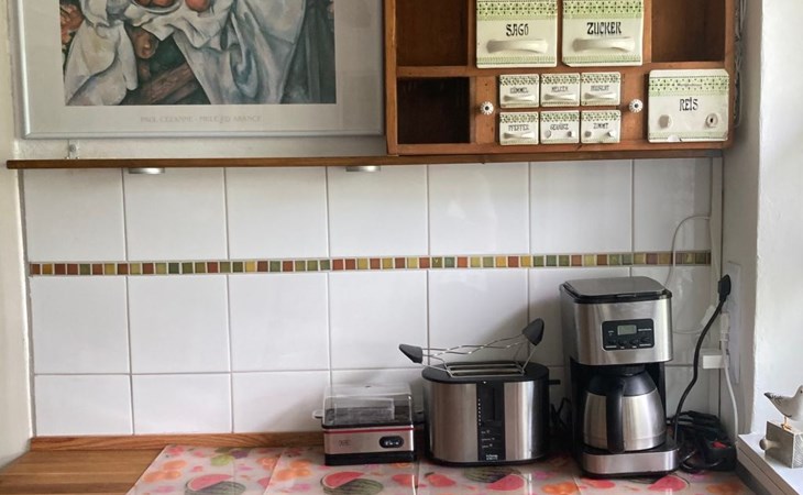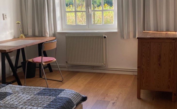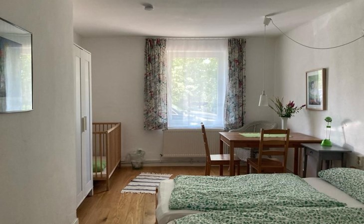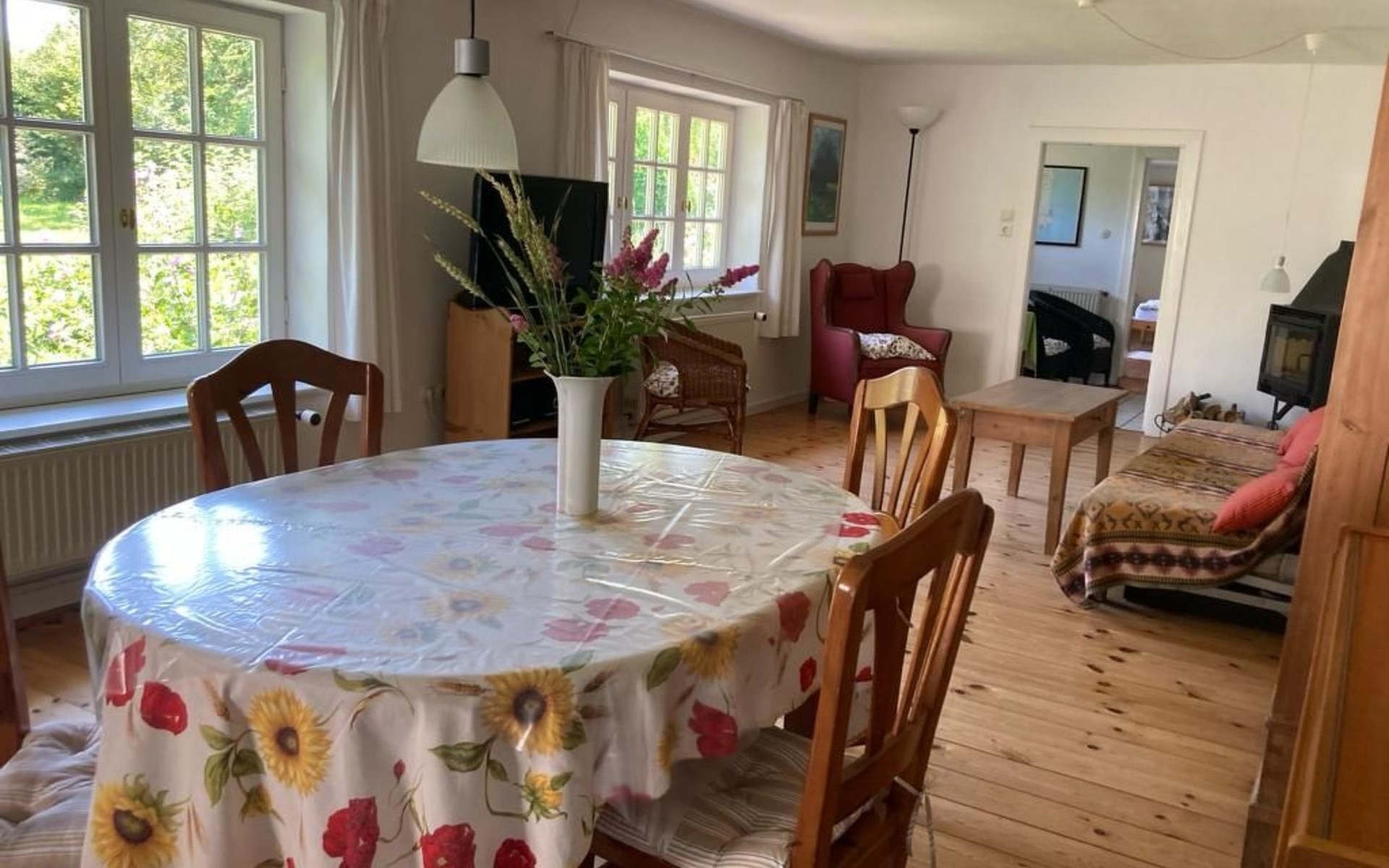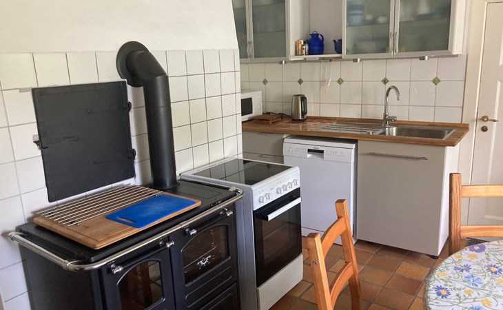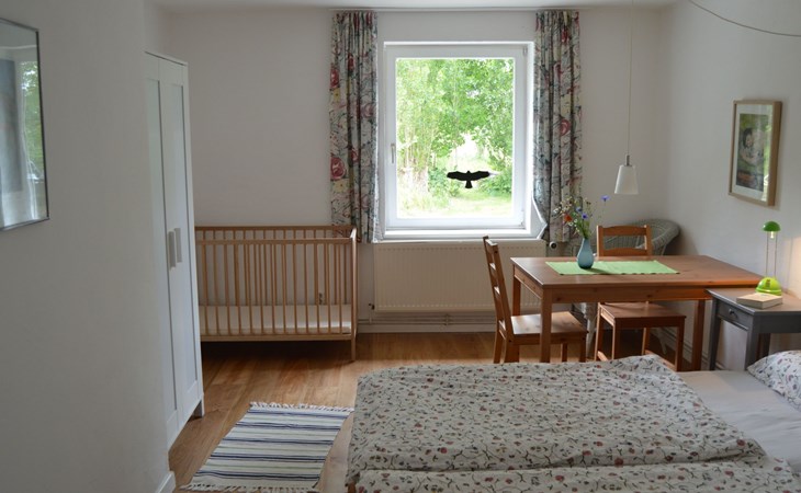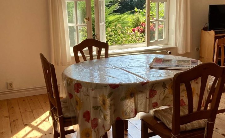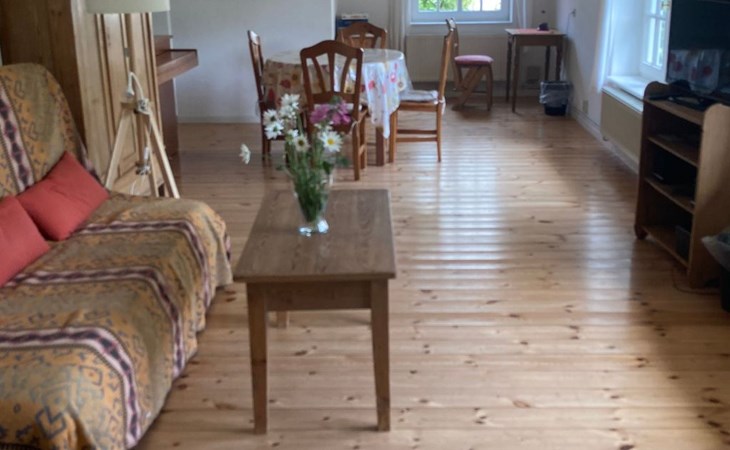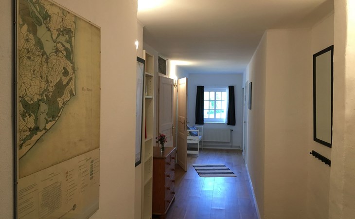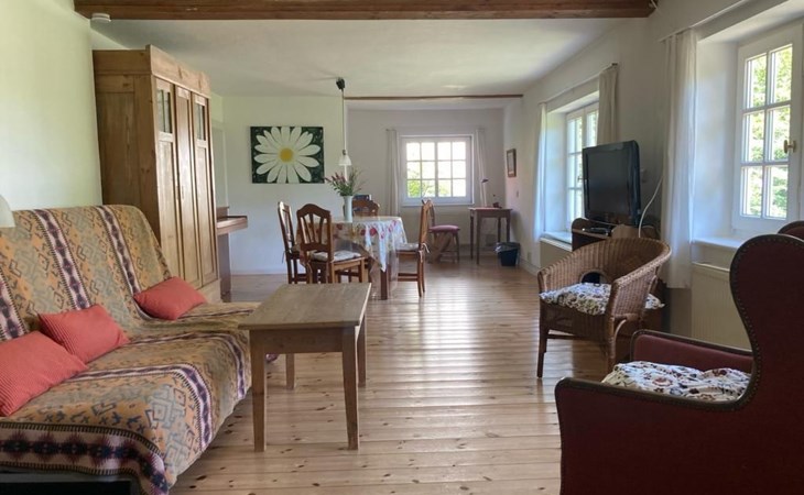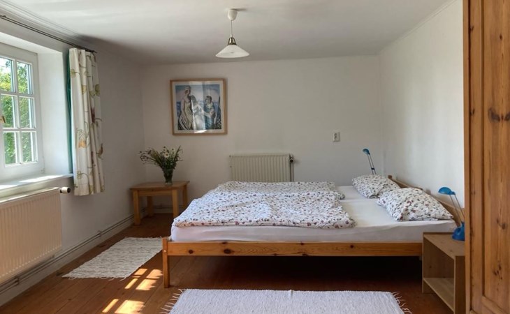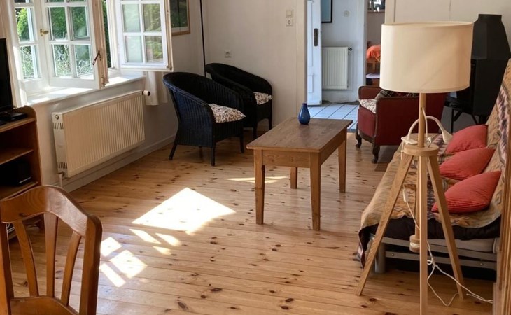 a 34 square metre living room. The rooms are tasteful, functional and partly furnished with antique furniture. A new fine oak parquet floor complements the existing pine floorboards. The bedrooms have double beds made up of single beds, the children's rooms have single beds. Two additional cots are available for small children. The layout of the house is also suitable for 2 families with children or for a family with grandparents. The bathroom is equipped with a bathtub, washbasin and WC, and there is another WC with washbasin in a separate room. There is also a new bathroom with shower and washbasin. Internet access (fibre optic) is available throughout the house and garden and is free of charge.
