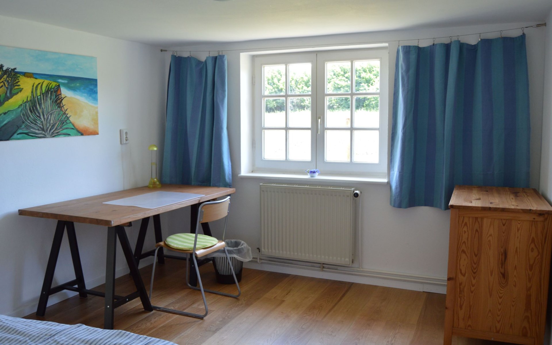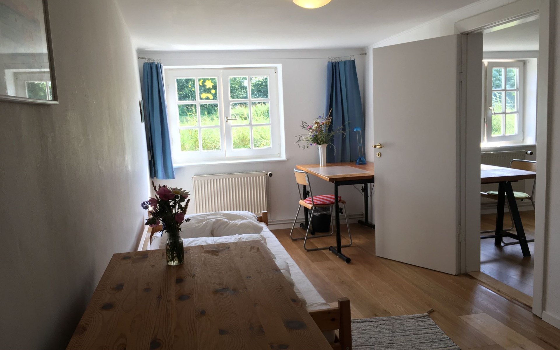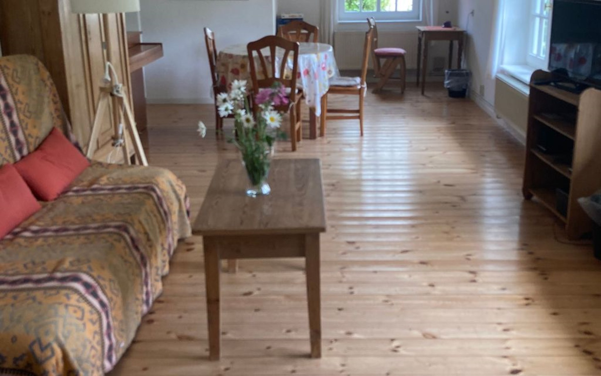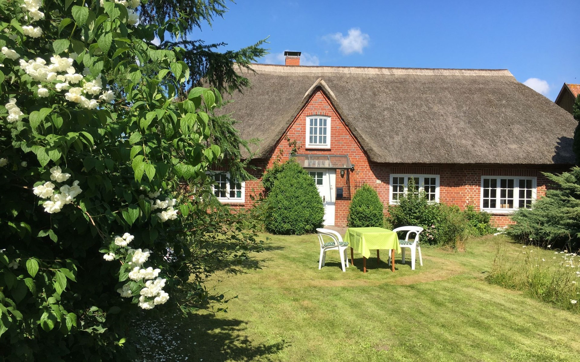 a 34 square metre living room. The rooms are tasteful, functional and partly furnished with antique furniture. A new fine oak parquet floor complements the existing pine floorboards. The bedrooms have double beds made up of single beds, the children's rooms have single beds. Two additional cots are available for small children. The layout of the house is also suitable for 2 families with children or for a family with grandparents. The bathroom is equipped with a bathtub, washbasin and WC, and there is another WC with washbasin in a separate room. There is also a new bathroom with shower and washbasin. Internet access (fibre optic) is available throughout the house and garden and is free of charge.