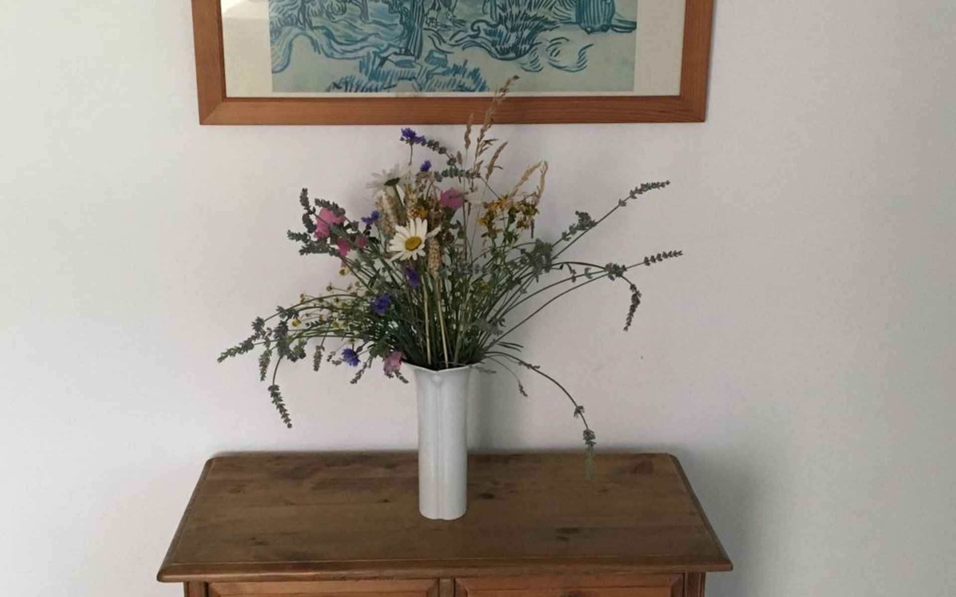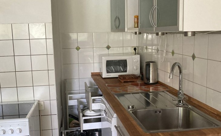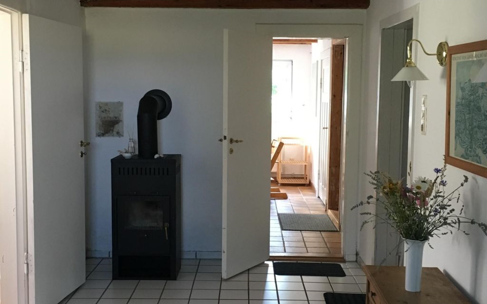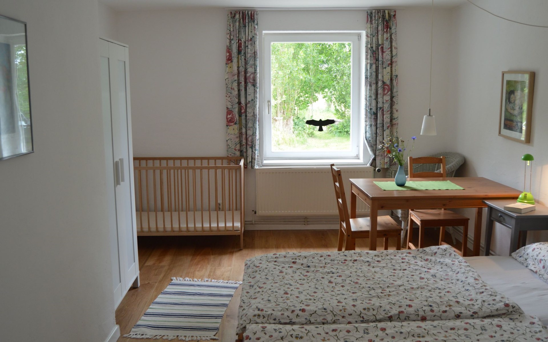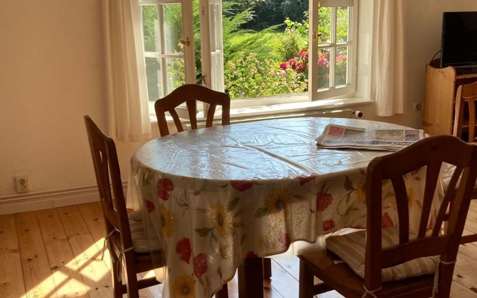 a 34 square metre living room. The rooms are tasteful, functional and partly furnished with antique furniture. A new fine oak parquet floor complements the existing pine floorboards. The bedrooms have double beds made up of single beds, the children's rooms have single beds. Two additional cots are available for small children. The layout of the house is also suitable for 2 families with children or for a family with grandparents. The bathroom is equipped with a bathtub, washbasin and WC, and there is another WC with washbasin in a separate room. There is also a new bathroom with shower and washbasin. Internet access (fibre optic) is available throughout the house and garden and is free of charge.