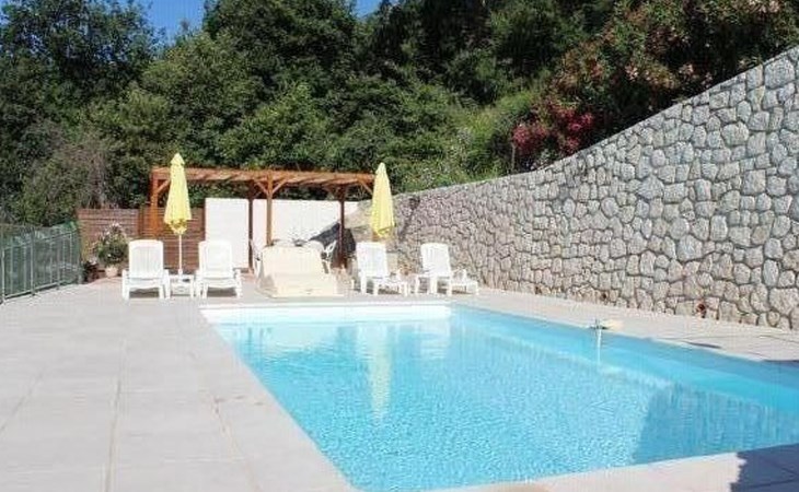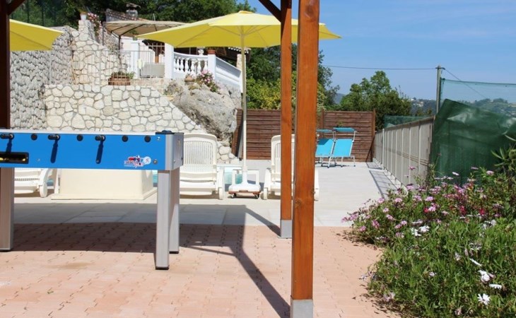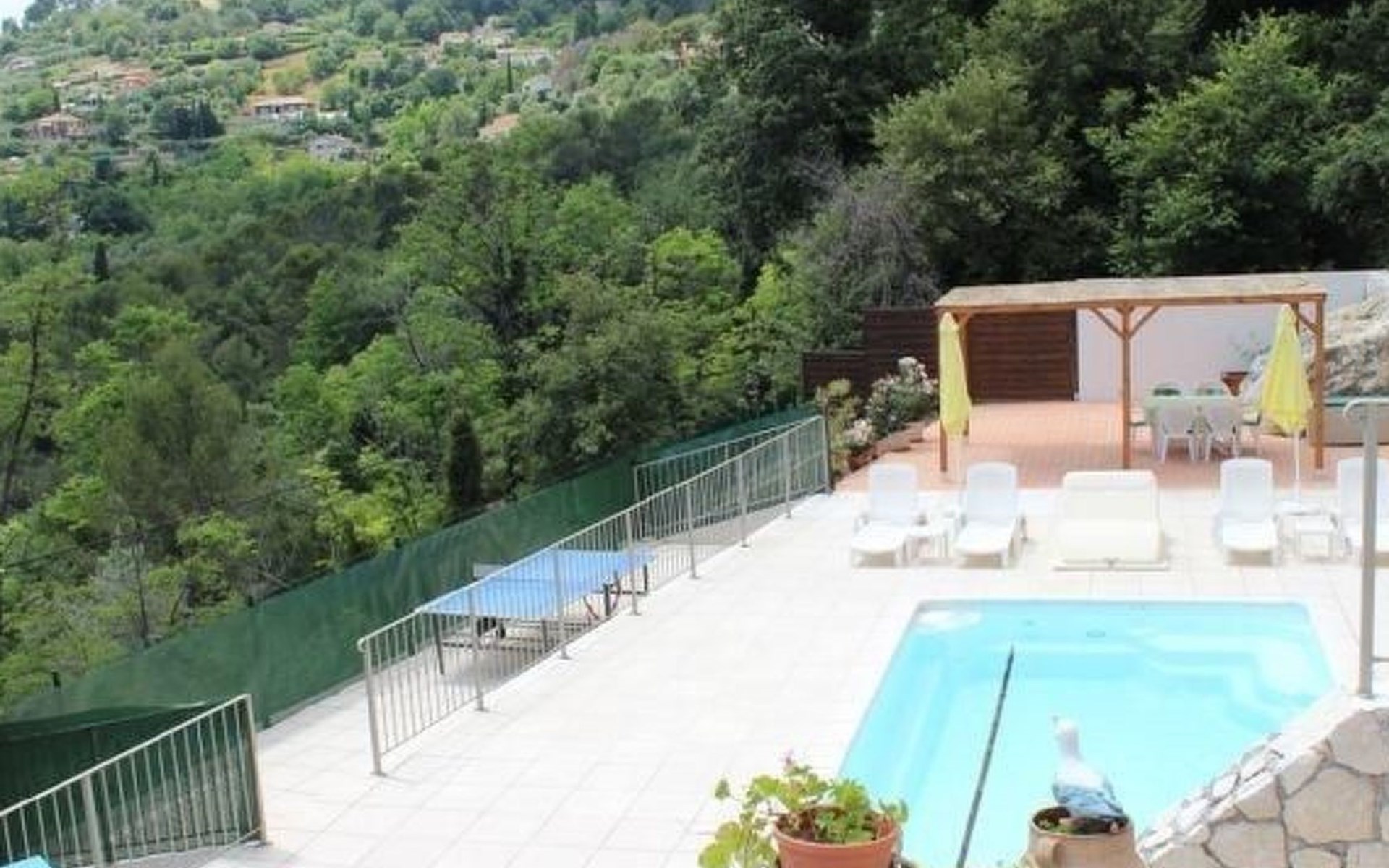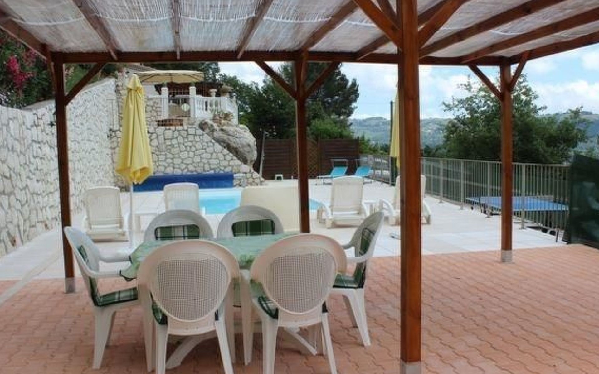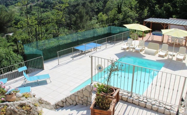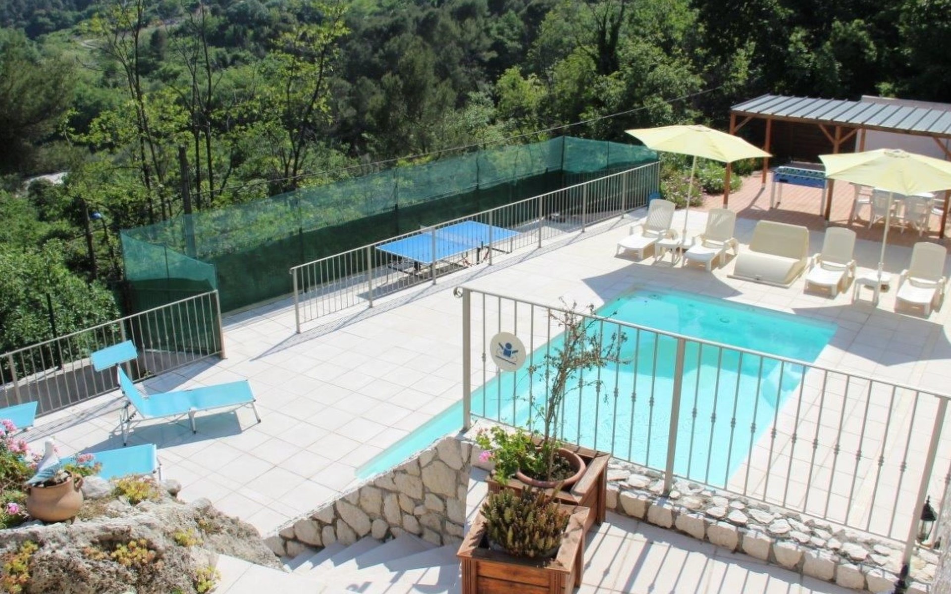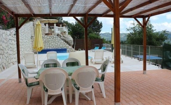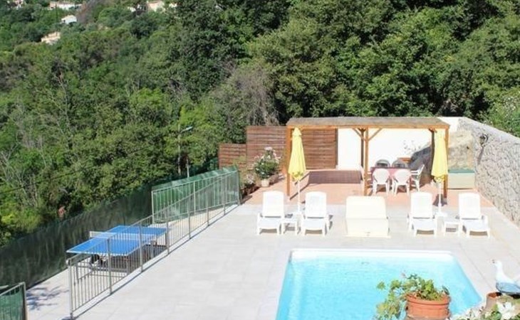 The 80 m² terrace, enclosed and protected from the sun, communicates with the living room. Here you can enjoy absolute peace and quiet. Parents can relax while the children play. The terrace has an arbour (5 x 3 m) and a pergola (3.5 x 3.5 m), a barbecue, a wall-mounted pizza oven, garden furniture, a table and chairs and sun loungers. This means you can spend plenty of time outside enjoying the barbecue, eating, relaxing and lounging. From the terrace, you can access your own private swimming pool (8 x 4 m, 1 m to 1.70 m deep), filled with chlorine-treated water and situated just below. Thanks to its sunny location, it's already a pleasant temperature early on. The 200 m² paved area around the pool is furnished with six sun loungers, two parasols and a solar shower. It enjoys all-day sunshine and magnificent sea views. Enjoy the peace and quiet as you listen to the birds and cicadas. For those who like to be a little more active, a table tennis table and table football are available. The property has an automatic entrance gate, automatic lighting and two parking spaces.