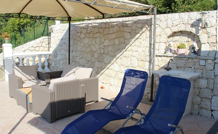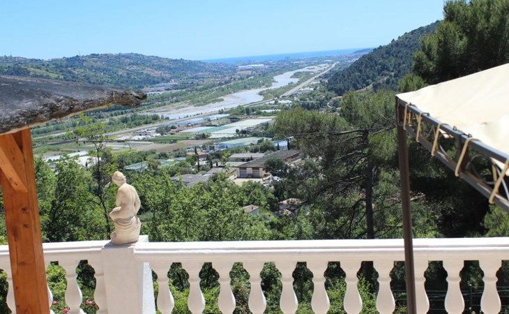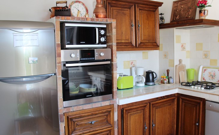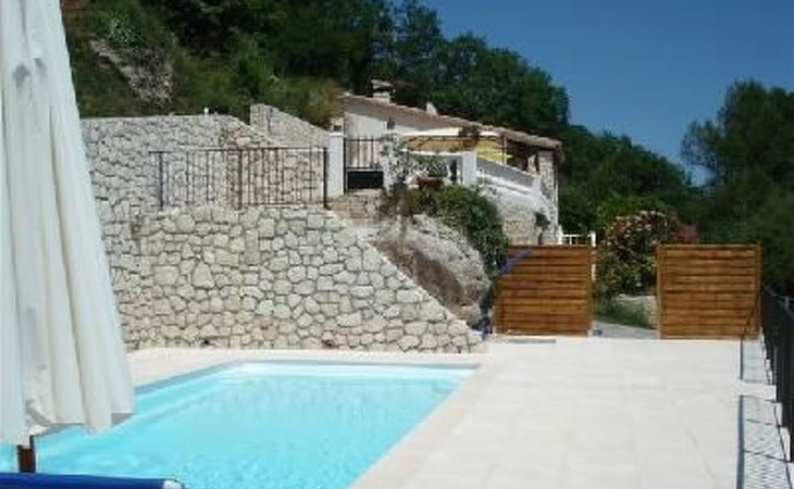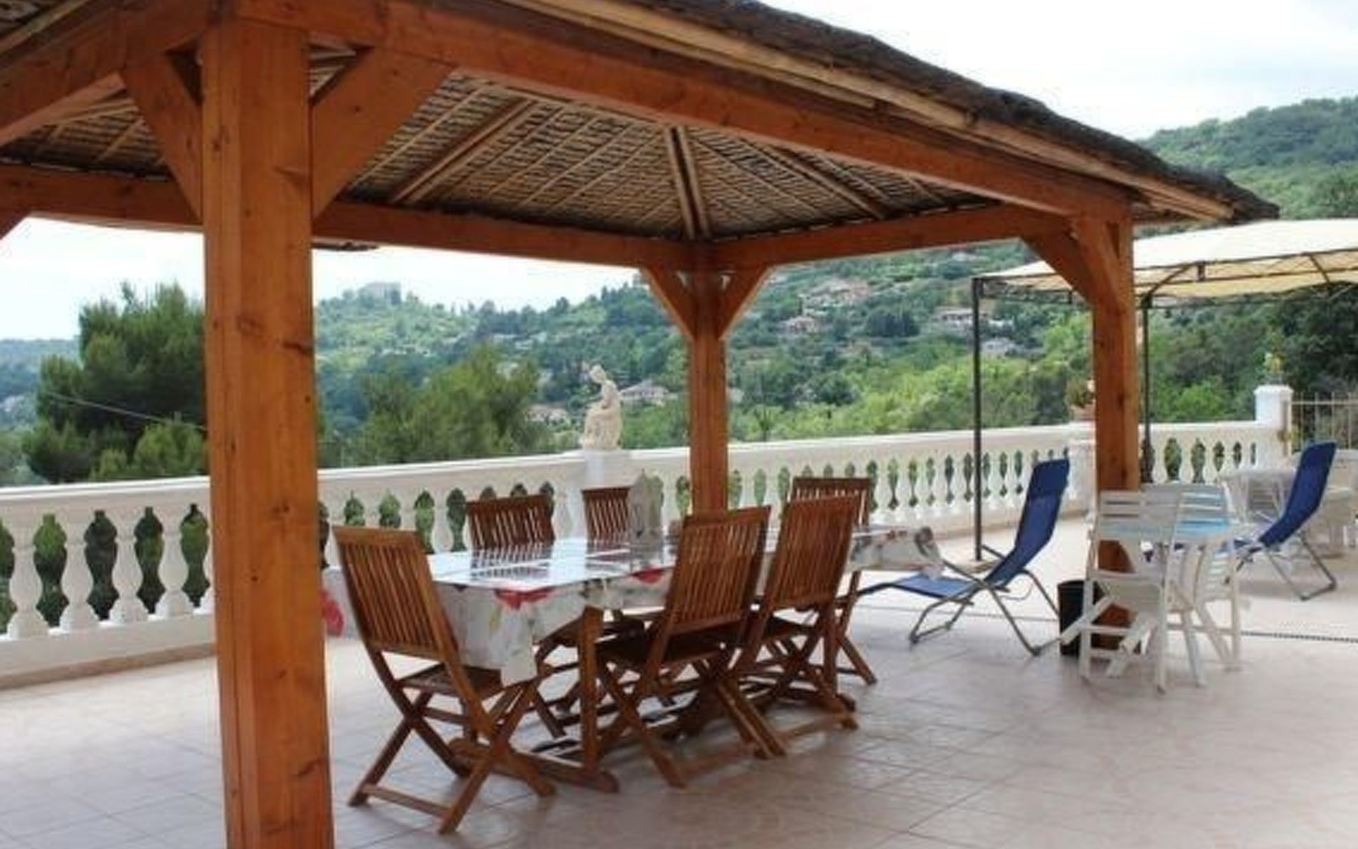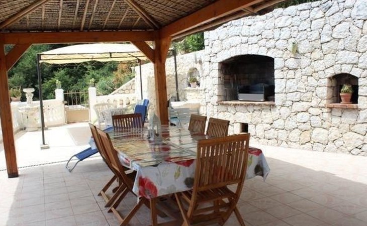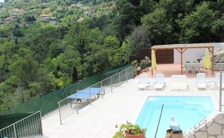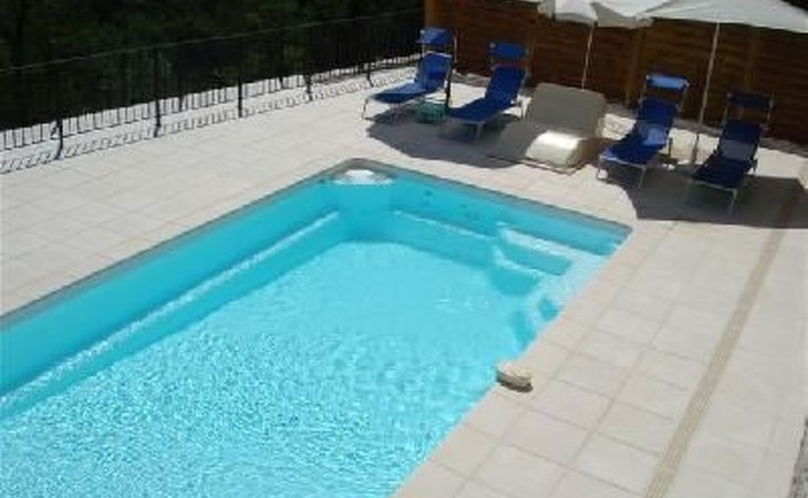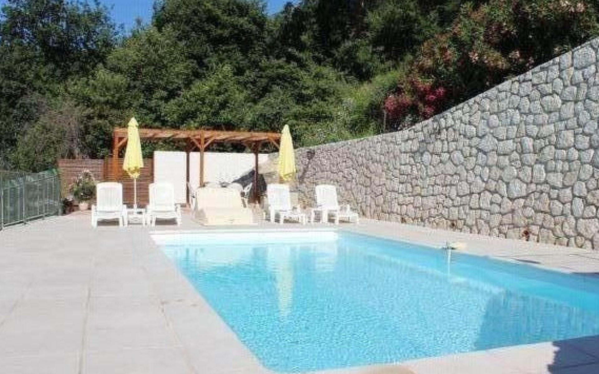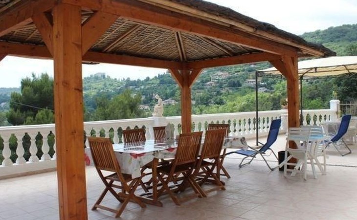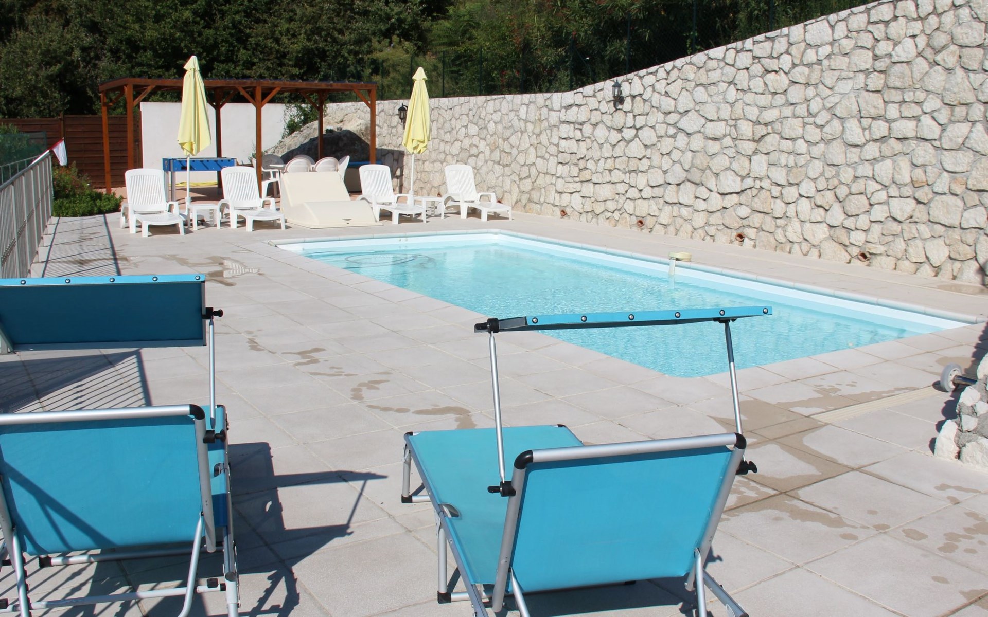 The 80 m² terrace, enclosed and protected from the sun, communicates with the living room. Here you can enjoy absolute peace and quiet. Parents can relax while the children play. The terrace has an arbour (5 x 3 m) and a pergola (3.5 x 3.5 m), a barbecue, a wall-mounted pizza oven, garden furniture, a table and chairs and sun loungers. This means you can spend plenty of time outside enjoying the barbecue, eating, relaxing and lounging. From the terrace, you can access your own private swimming pool (8 x 4 m, 1 m to 1.70 m deep), filled with chlorine-treated water and situated just below. Thanks to its sunny location, it's already a pleasant temperature early on. The 200 m² paved area around the pool is furnished with six sun loungers, two parasols and a solar shower. It enjoys all-day sunshine and magnificent sea views. Enjoy the peace and quiet as you listen to the birds and cicadas. For those who like to be a little more active, a table tennis table and table football are available. The property has an automatic entrance gate, automatic lighting and two parking spaces.