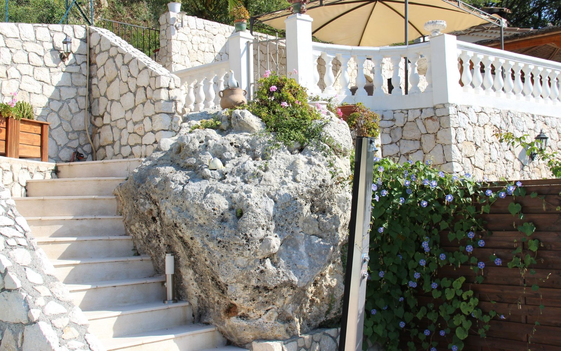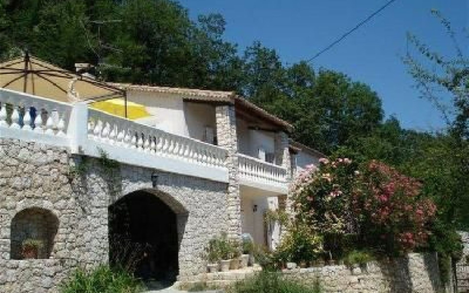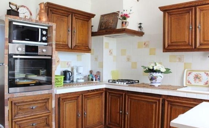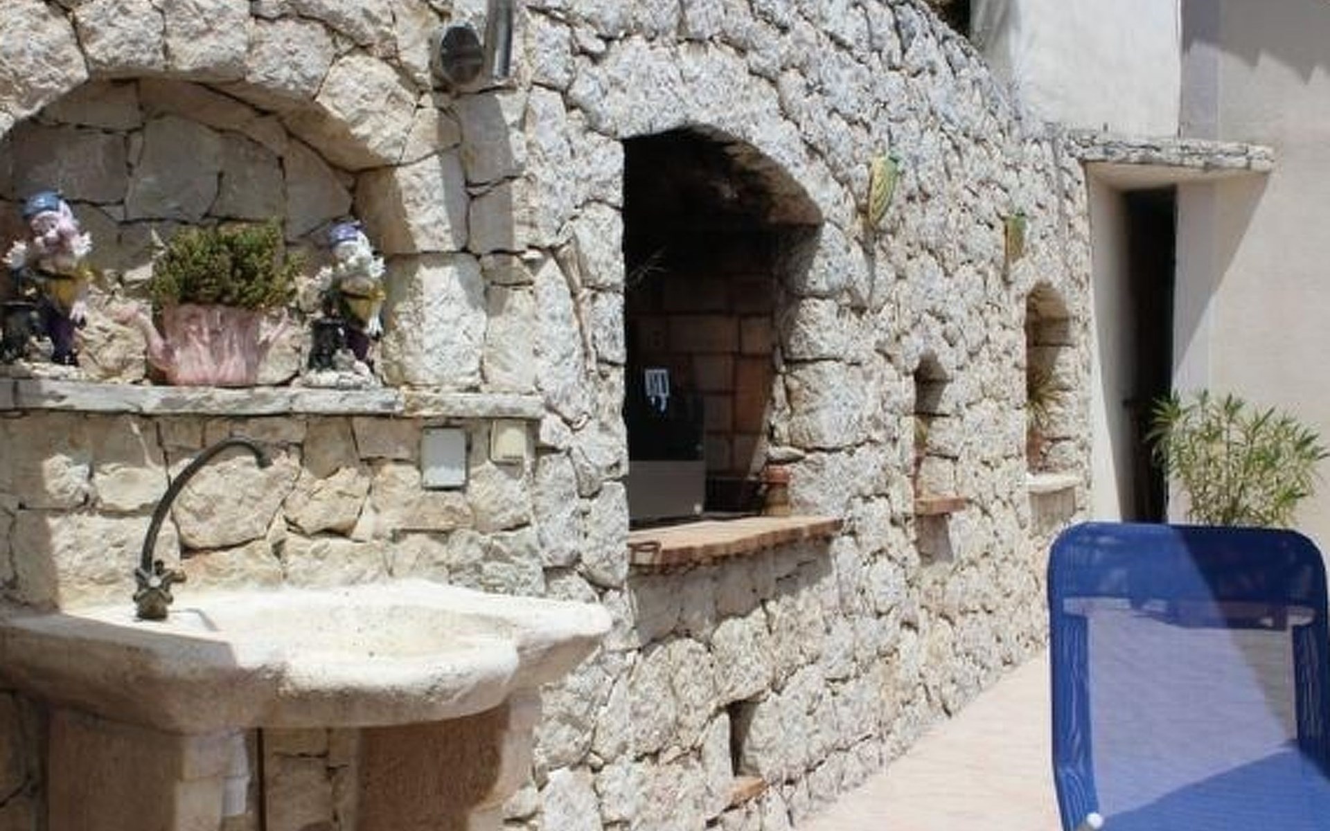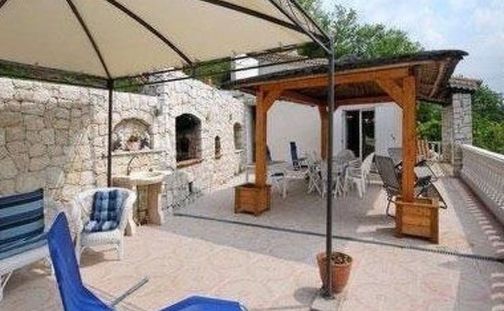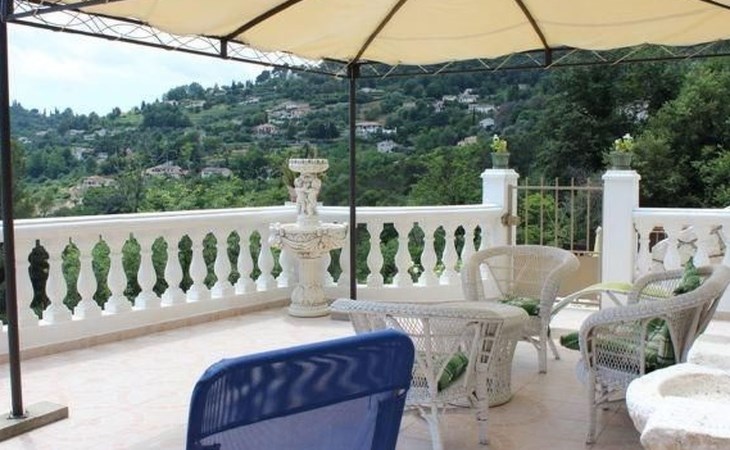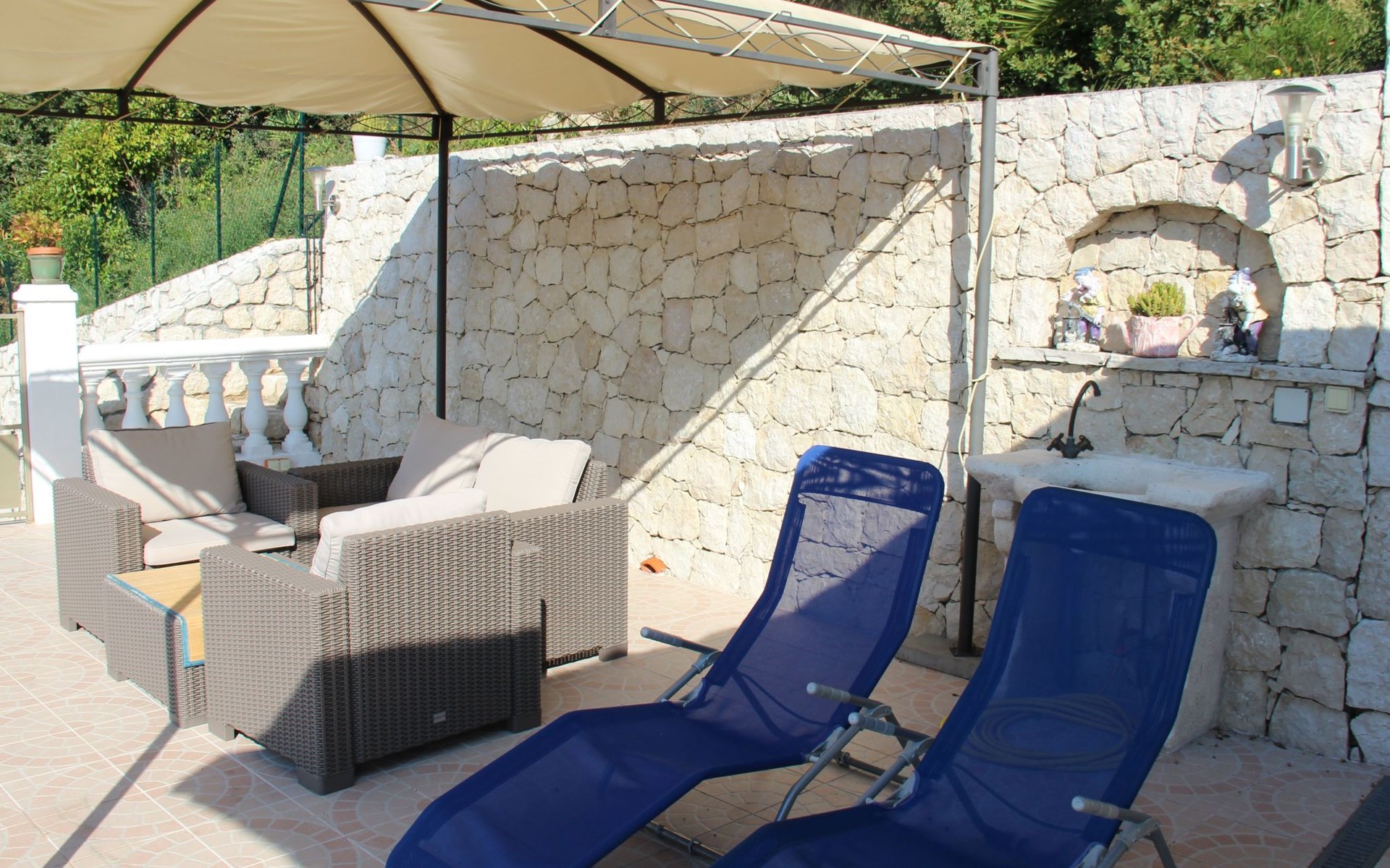 The 80 m² terrace, enclosed and protected from the sun, communicates with the living room. Here you can enjoy absolute peace and quiet. Parents can relax while the children play. The terrace has an arbour (5 x 3 m) and a pergola (3.5 x 3.5 m), a barbecue, a wall-mounted pizza oven, garden furniture, a table and chairs and sun loungers. This means you can spend plenty of time outside enjoying the barbecue, eating, relaxing and lounging. From the terrace, you can access your own private swimming pool (8 x 4 m, 1 m to 1.70 m deep), filled with chlorine-treated water and situated just below. Thanks to its sunny location, it's already a pleasant temperature early on. The 200 m² paved area around the pool is furnished with six sun loungers, two parasols and a solar shower. It enjoys all-day sunshine and magnificent sea views. Enjoy the peace and quiet as you listen to the birds and cicadas. For those who like to be a little more active, a table tennis table and table football are available. The property has an automatic entrance gate, automatic lighting and two parking spaces.