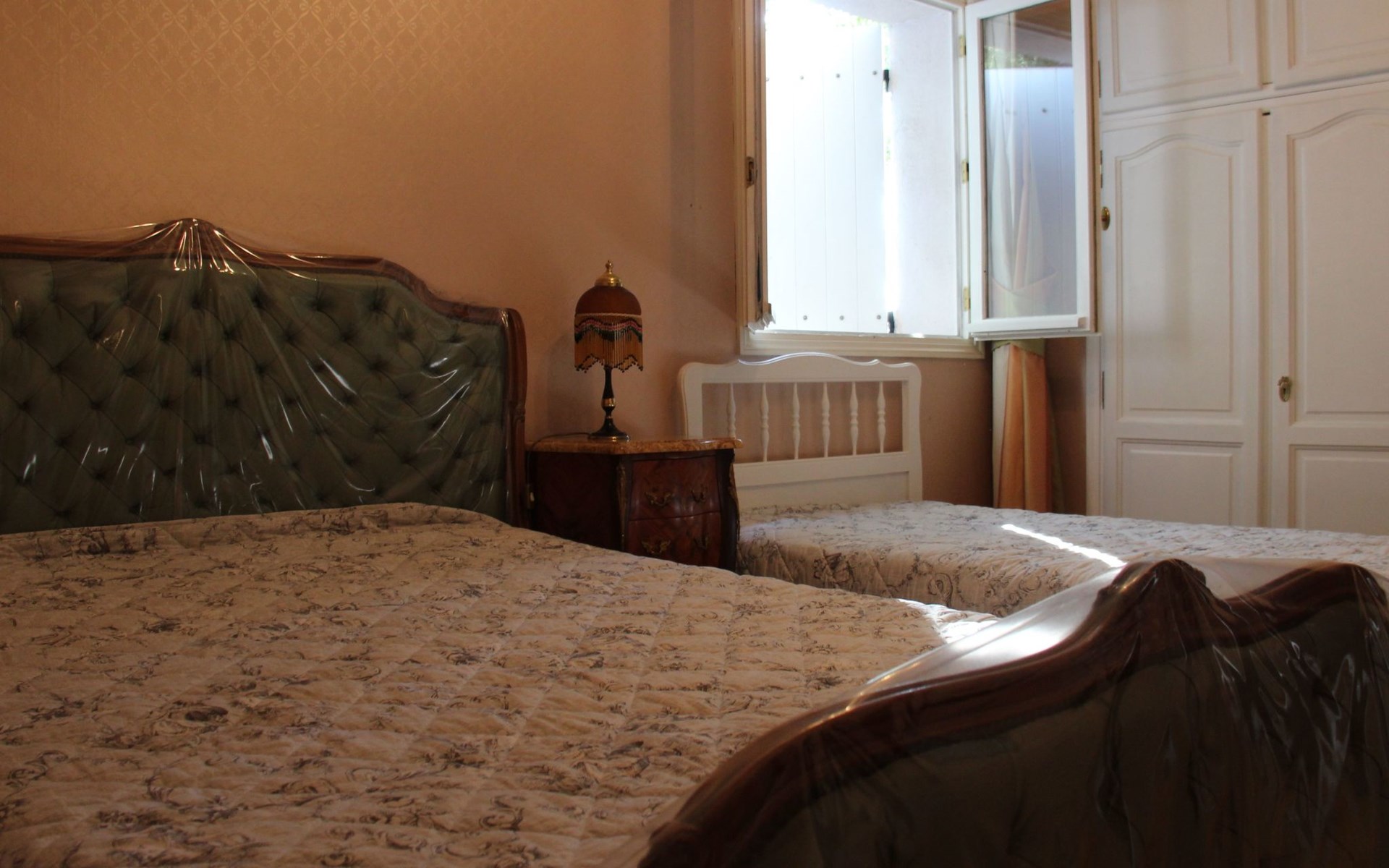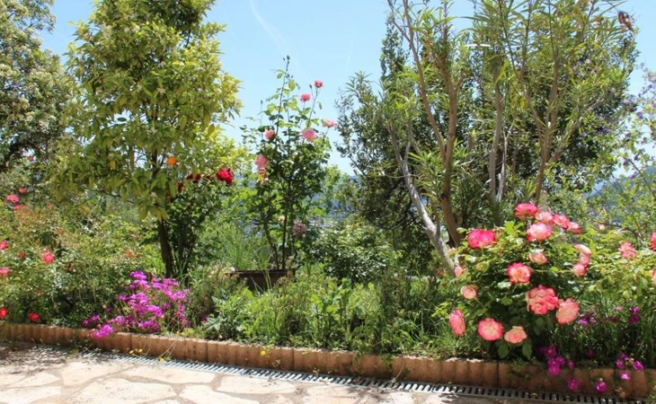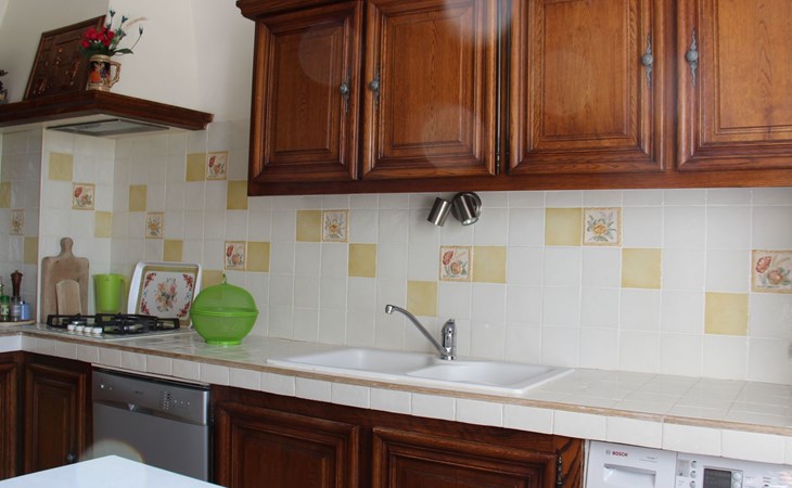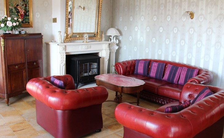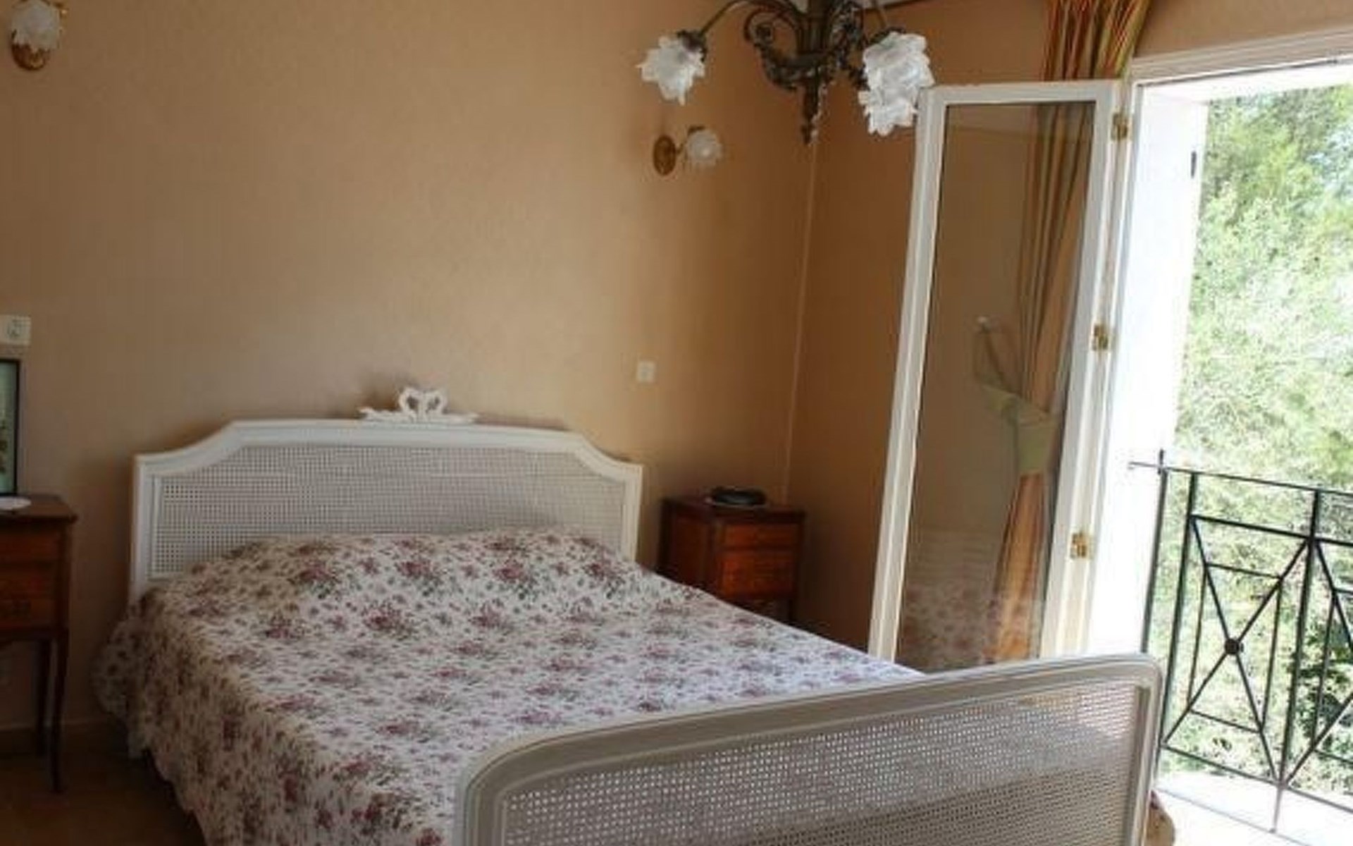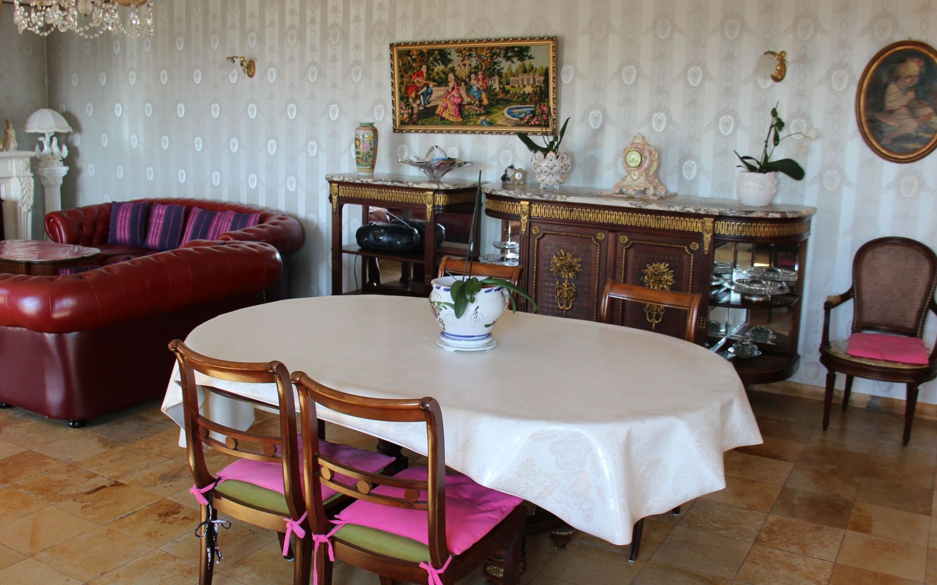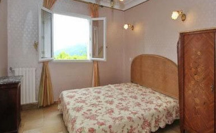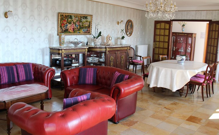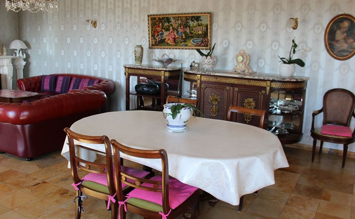 The 125 m² non-smoking flat offers plenty of space in its French-style rooms, as evidenced by the 60 m² living room. It consists of a comfortable lounge set in front of the fireplace with leather sofa and armchairs and a dining set. The spacious kitchen is fully equipped. There are three bedrooms in all, also furnished in an elegant, timeless style. Two of the bedrooms each have a double bed (160 x 200 cm), while the third has another double bed (140 x 190 cm), a single bed (90 x 190 cm) and a folding bed (80 x 180 cm). Each bedroom has its own fan. The spacious bathroom has a bath, shower, double washbasin and bidet. For safety and hygiene reasons, particular care is taken with the final cleaning of the accommodation, outside areas, terrace and swimming pool, making the rental area 600 square metres completely private.