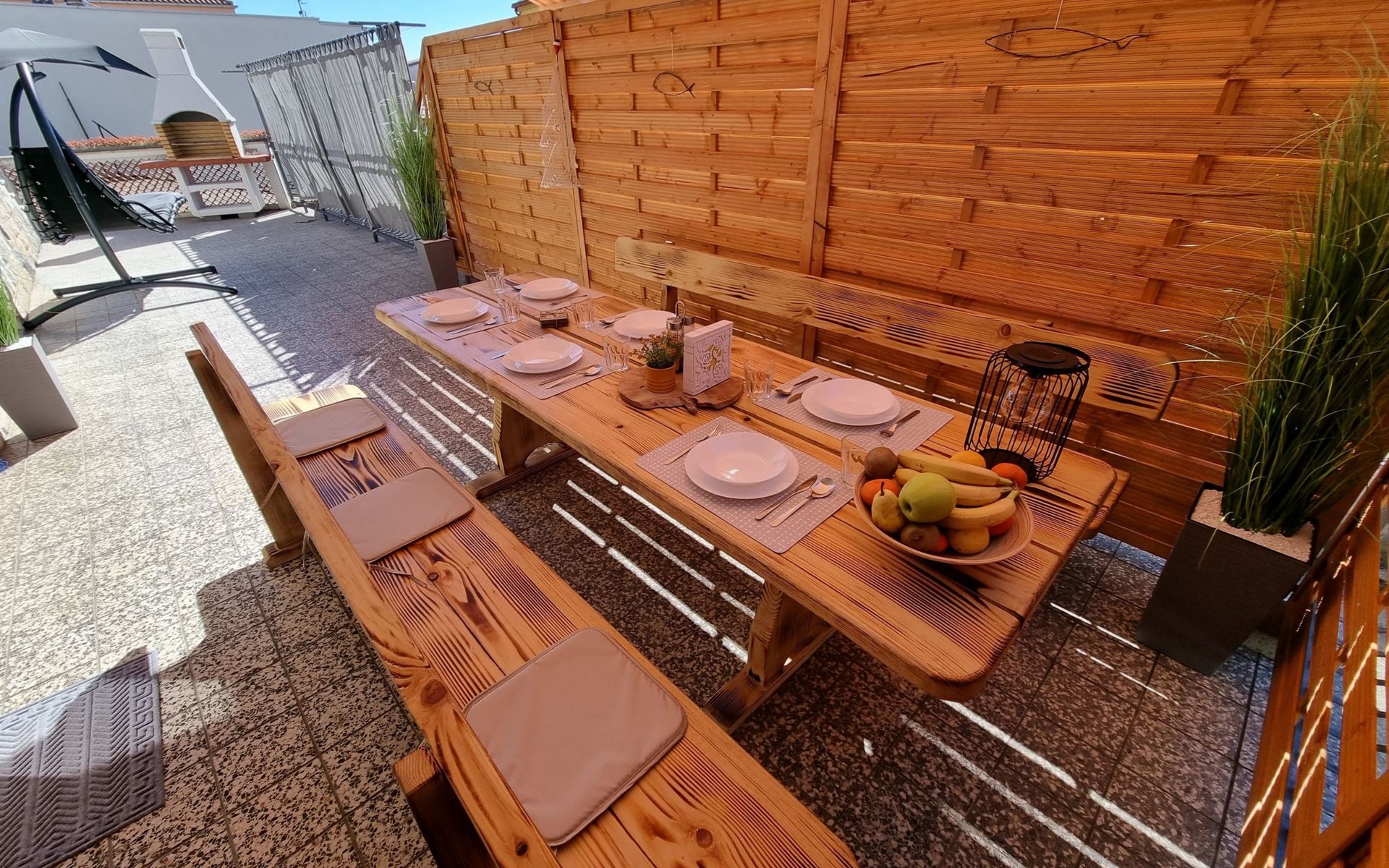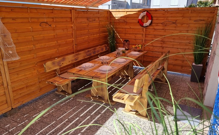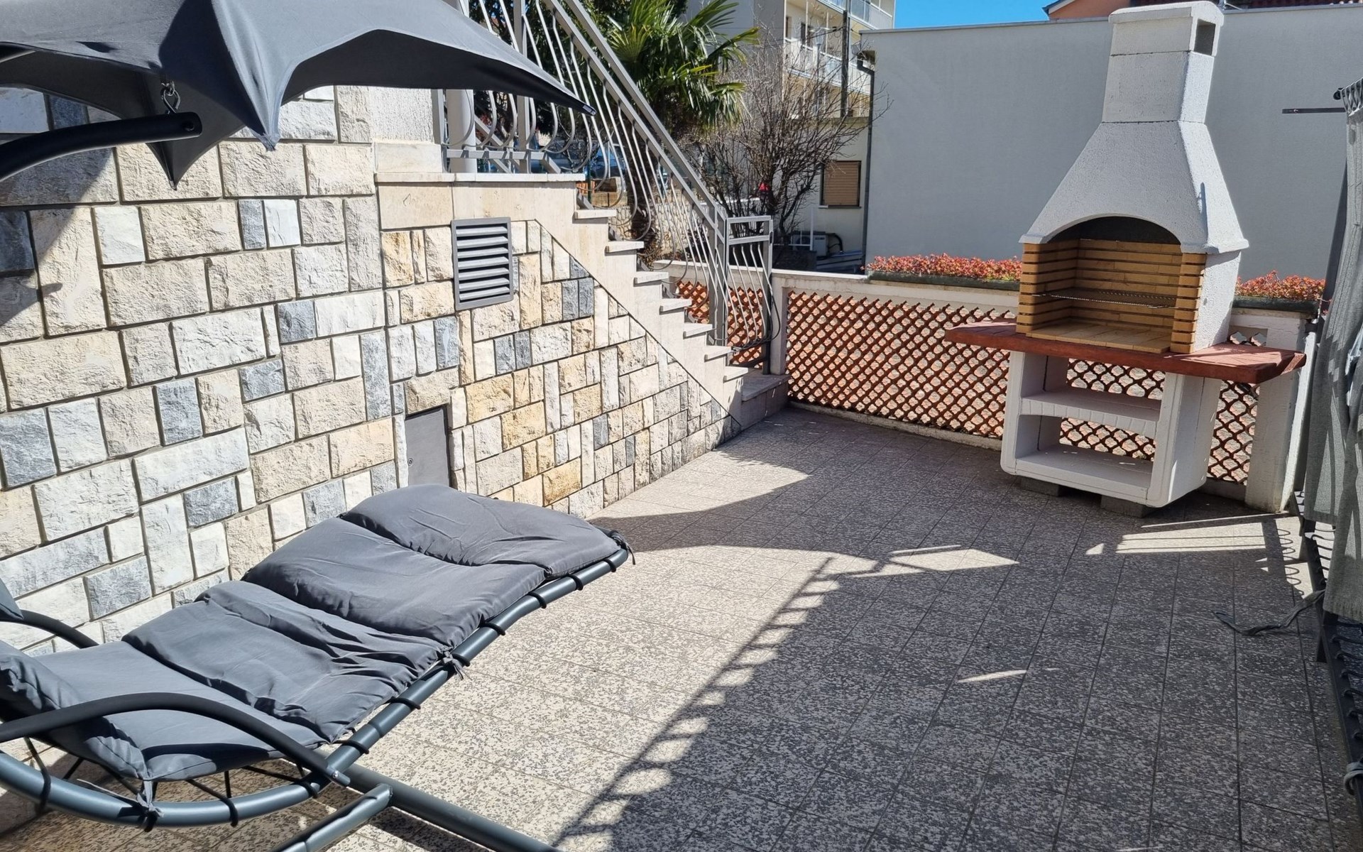 Step outside to uncover the apartment's spacious terrace, a delightful outdoor living space where you can unwind and indulge in al fresco dining. Here, a grill awaits, inviting you to enjoy wonderful barbecued meals in the company of loved ones. For those who arrive by car, the convenience of a parking space within the yard adds an extra layer of ease to your stay.
