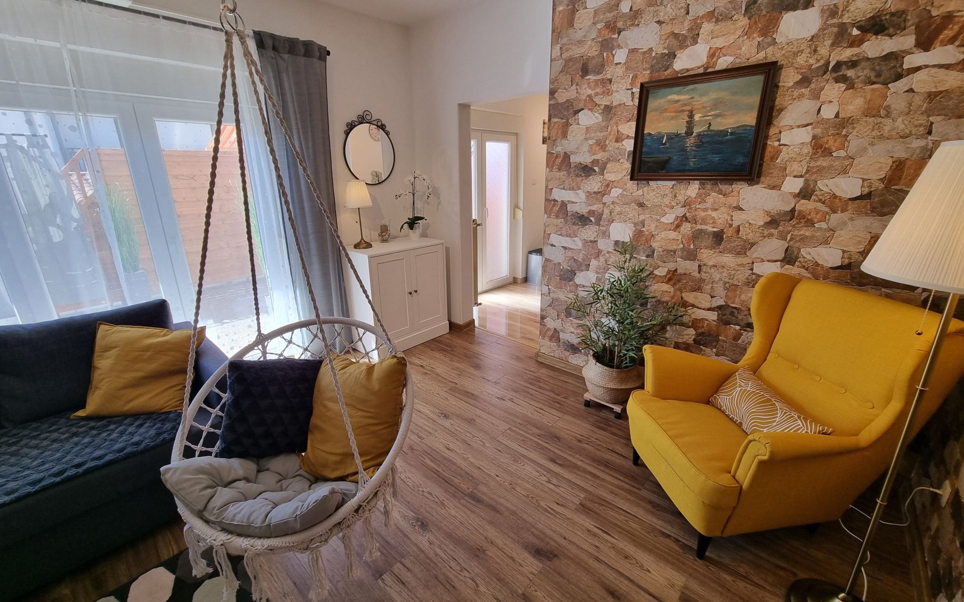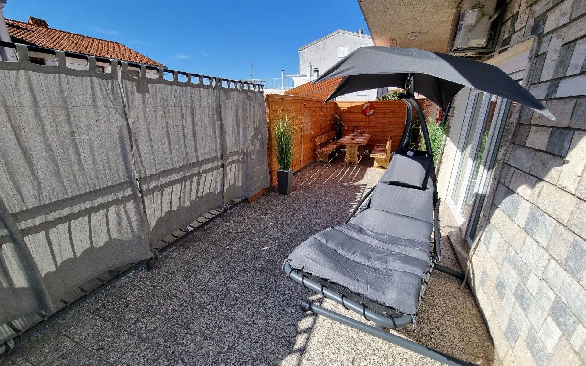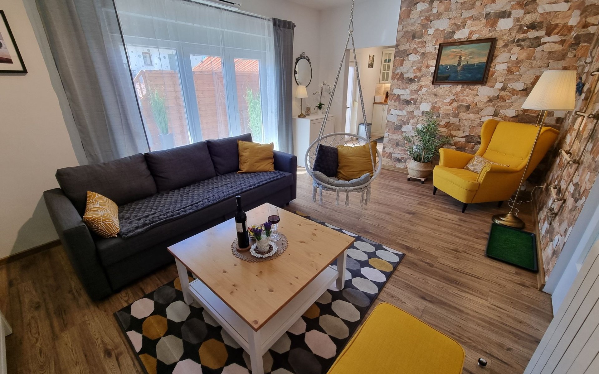 Step outside to uncover the apartment's spacious terrace, a delightful outdoor living space where you can unwind and indulge in al fresco dining. Here, a grill awaits, inviting you to enjoy wonderful barbecued meals in the company of loved ones. For those who arrive by car, the convenience of a parking space within the yard adds an extra layer of ease to your stay.