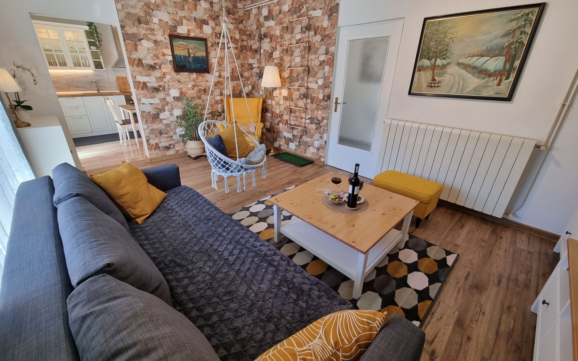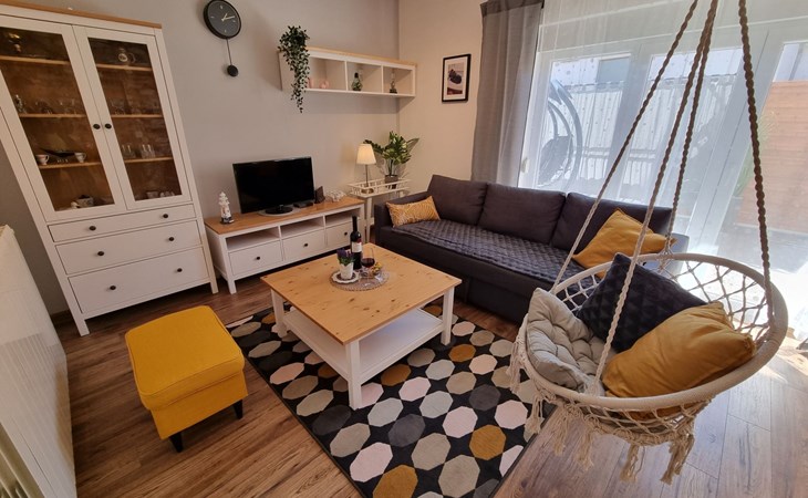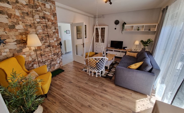 Inside, the apartment is thoughtfully equipped to ensure your stay is comfortable and convenient. The heart of the home, a well-appointed kitchen, comes complete with a gas cooker, filter coffee machine, dishwasher, and electric kettle, allowing you to effortlessly prepare meals during your stay. A comfortable living room, featuring a cozy sleeping couch for one, is designed for relaxation and entertainment with TV and Internet access provided. Two inviting bedrooms, each housing a double bed, ensure restful nights, while the inclusion of air conditioning units in the living room and each bedroom guarantees your comfort regardless of the season.