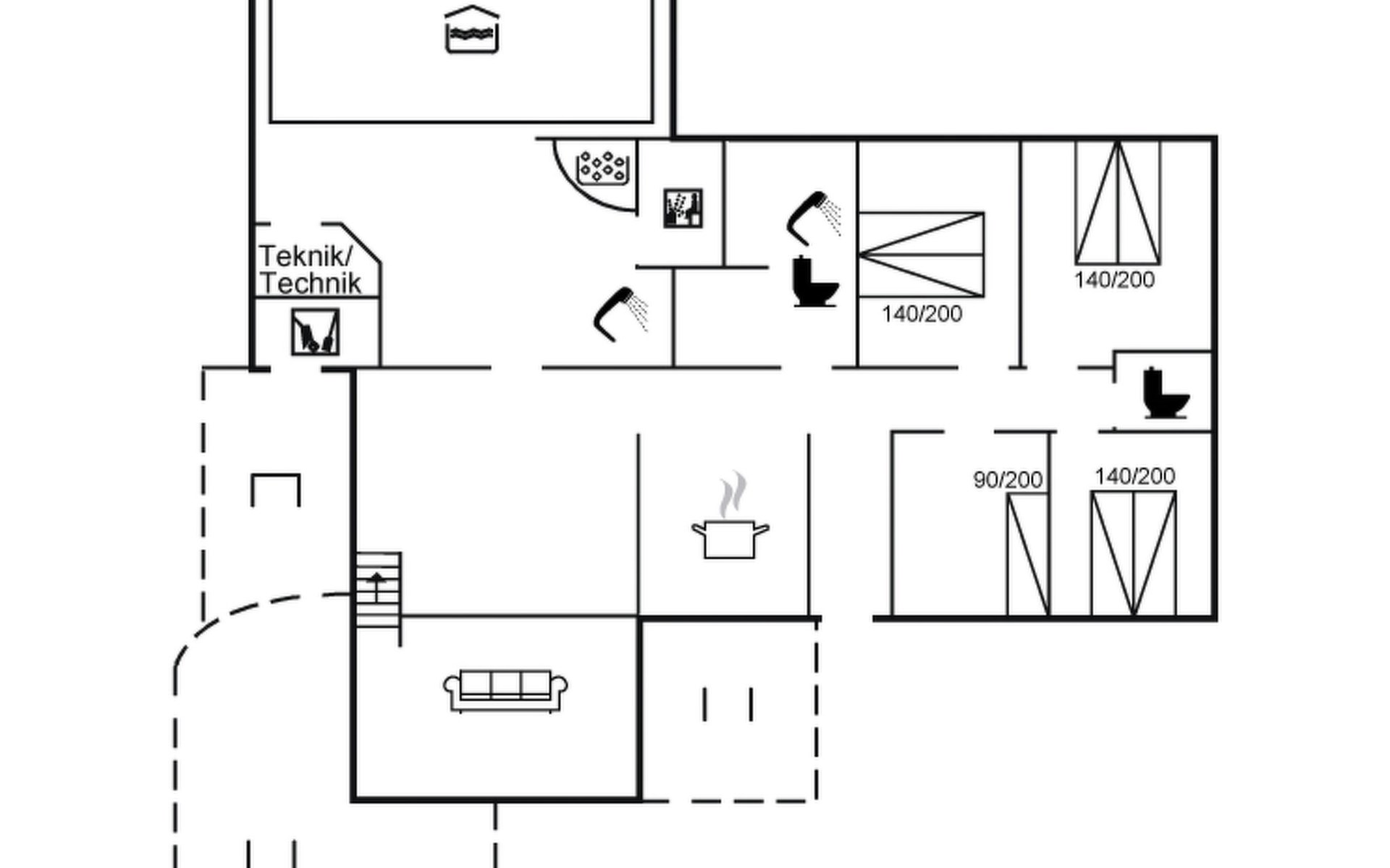 Single-family house, built in 1993. 1.3 km from the sea. Private: natural state property 2'002 m2, indoor pool (3 x 5 m, 1'7.6 m2, depth 120 - 120 cm). Terrace (47 m2), children's playground (swing). In the house: sauna, washing machine, tumble dryer. Parking at the house. Grocery 2.4 km. Golf course 500 m. The owner does not accept any youth groups.