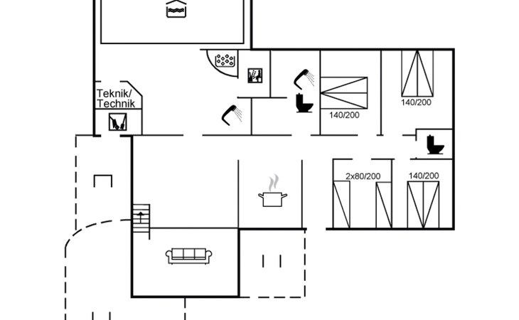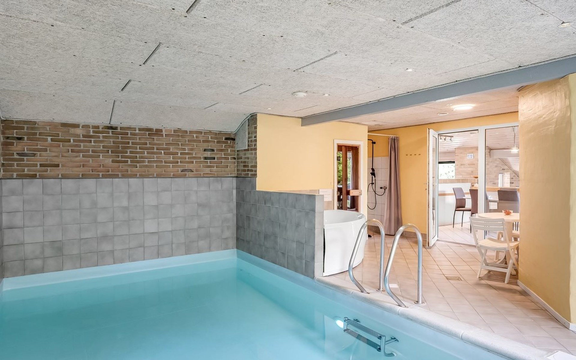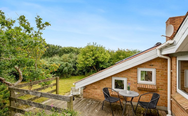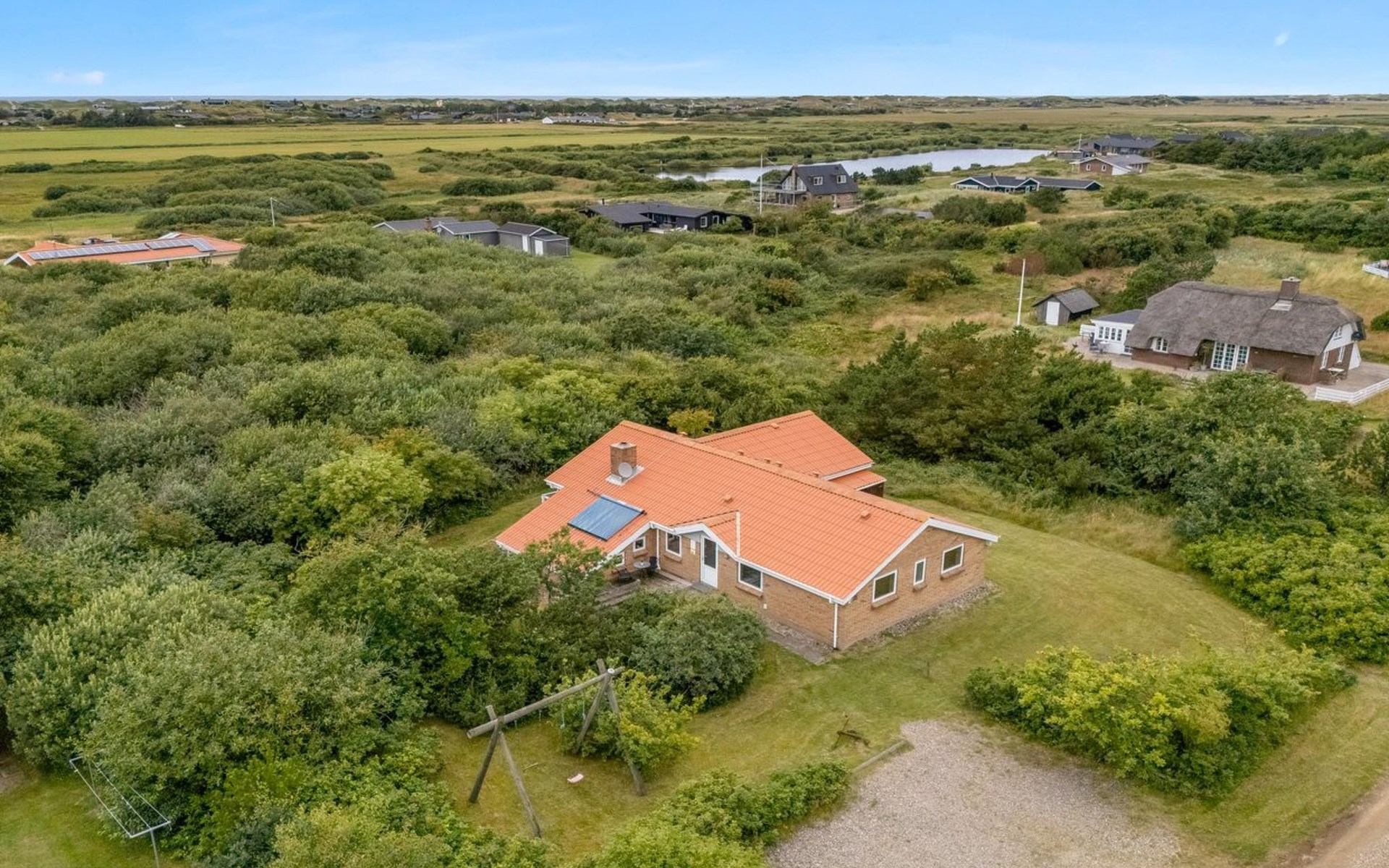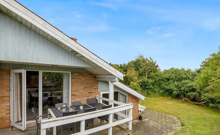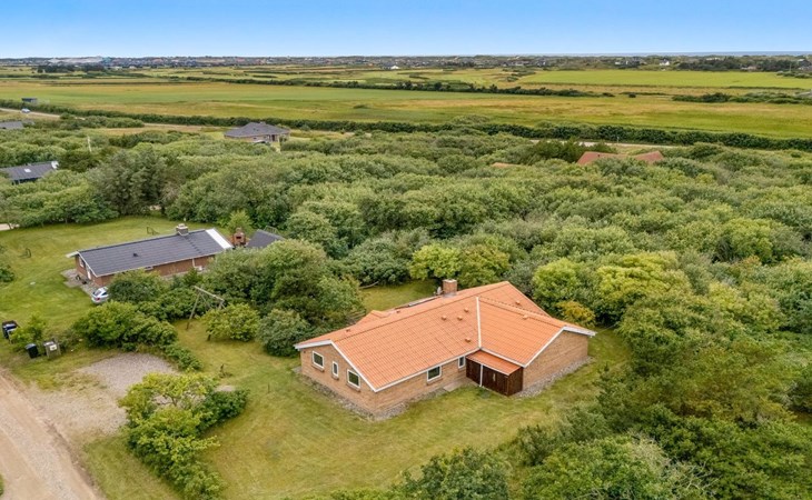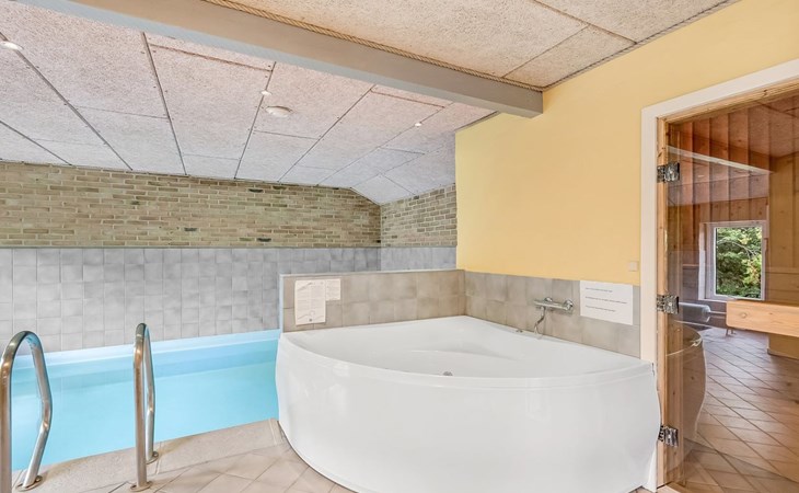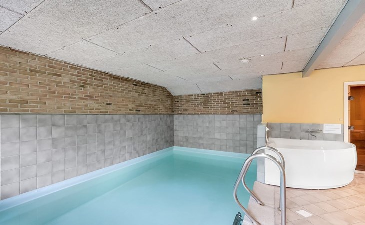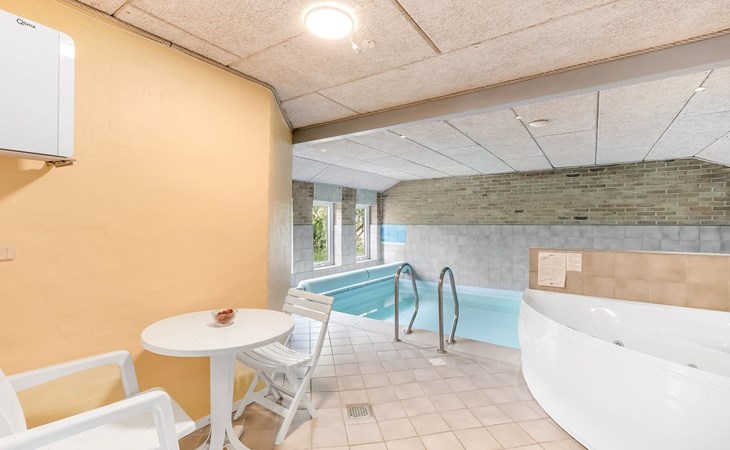 Single-family house, built in 1993. 1.3 km from the sea. Private: natural state property 2'002 m2, indoor pool (3 x 5 m, 1'7.6 m2, depth 120 - 120 cm). Terrace (47 m2), children's playground (swing). In the house: sauna, washing machine, tumble dryer. Parking at the house. Grocery 2.4 km. Golf course 500 m. The owner does not accept any youth groups.