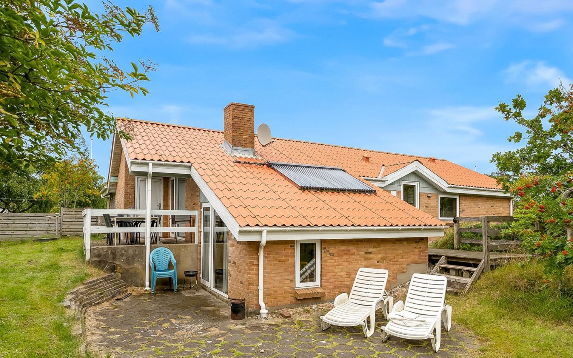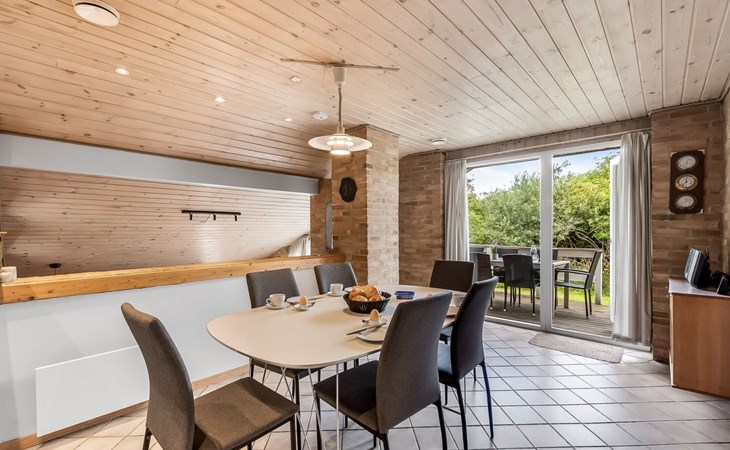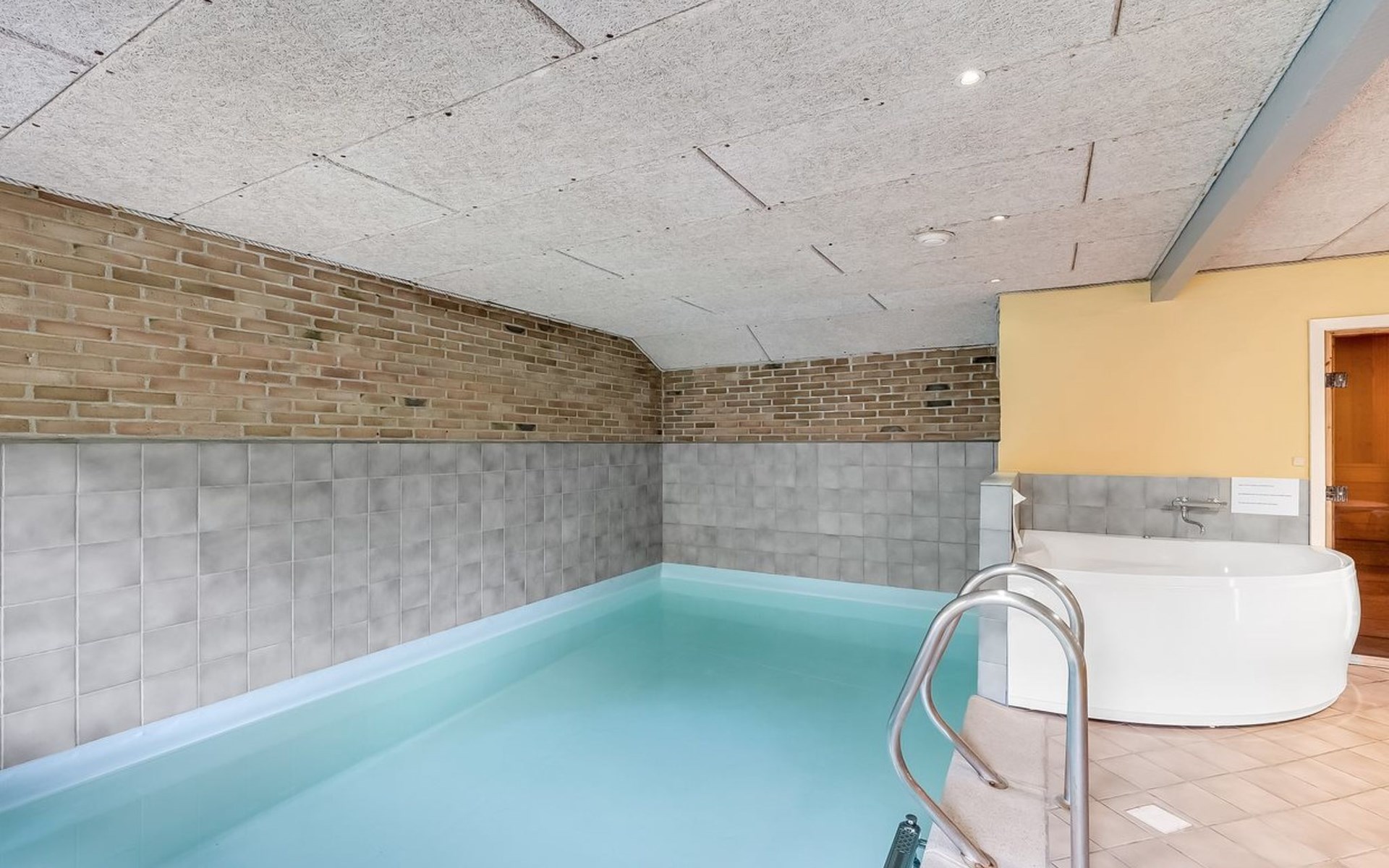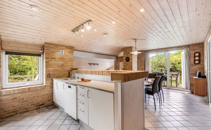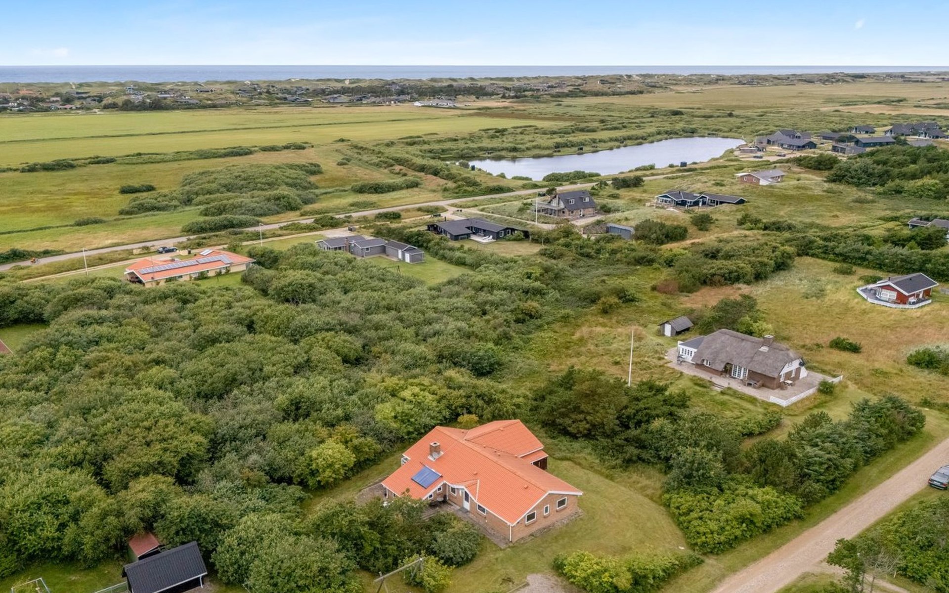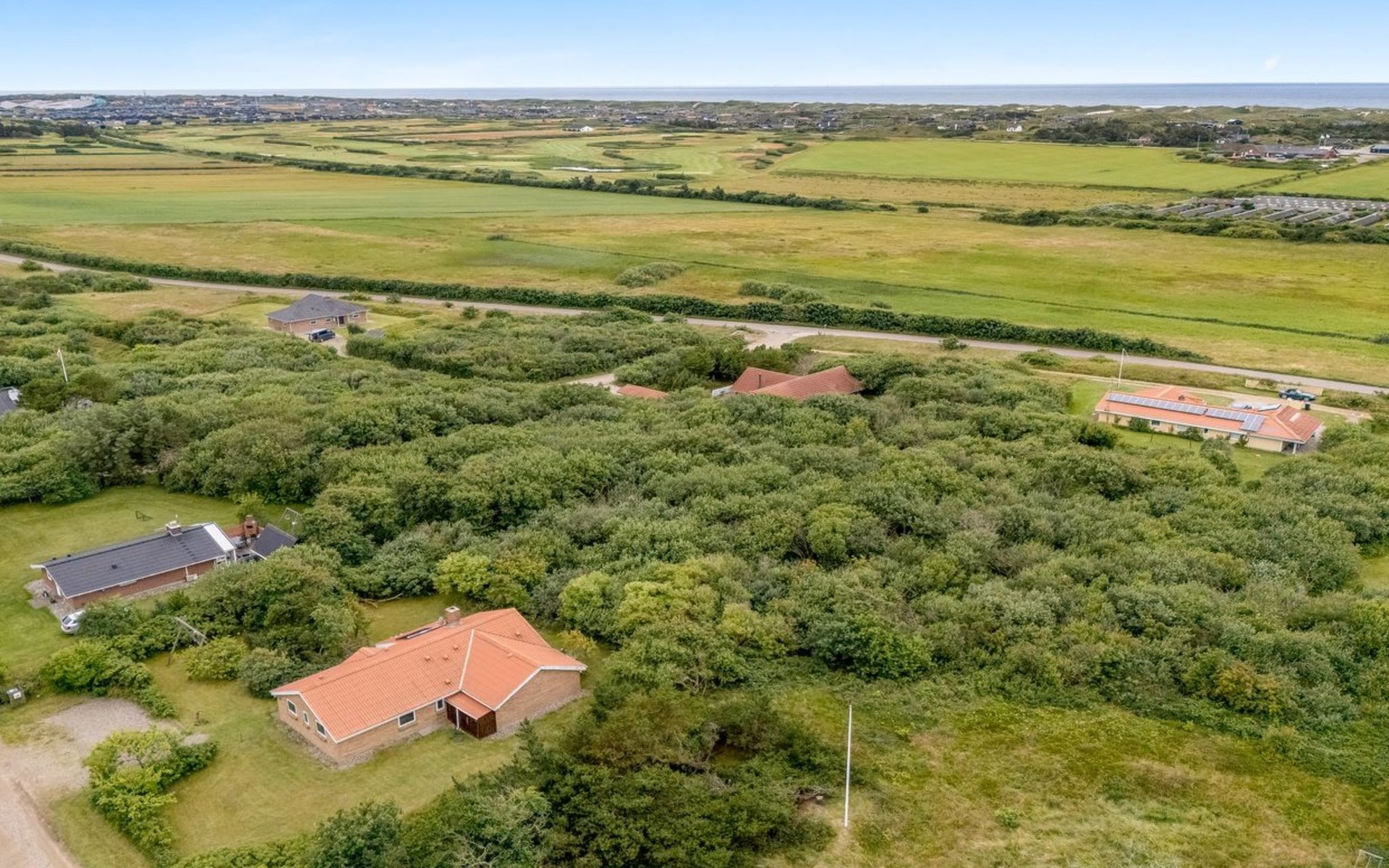 Single-family house, built in 1993. 1.3 km from the sea. Private: natural state property 2'002 m2, indoor pool (3 x 5 m, 1'7.6 m2, depth 120 - 120 cm). Terrace (47 m2), children's playground (swing). In the house: sauna, washing machine, tumble dryer. Parking at the house. Grocery 2.4 km. Golf course 500 m. The owner does not accept any youth groups.