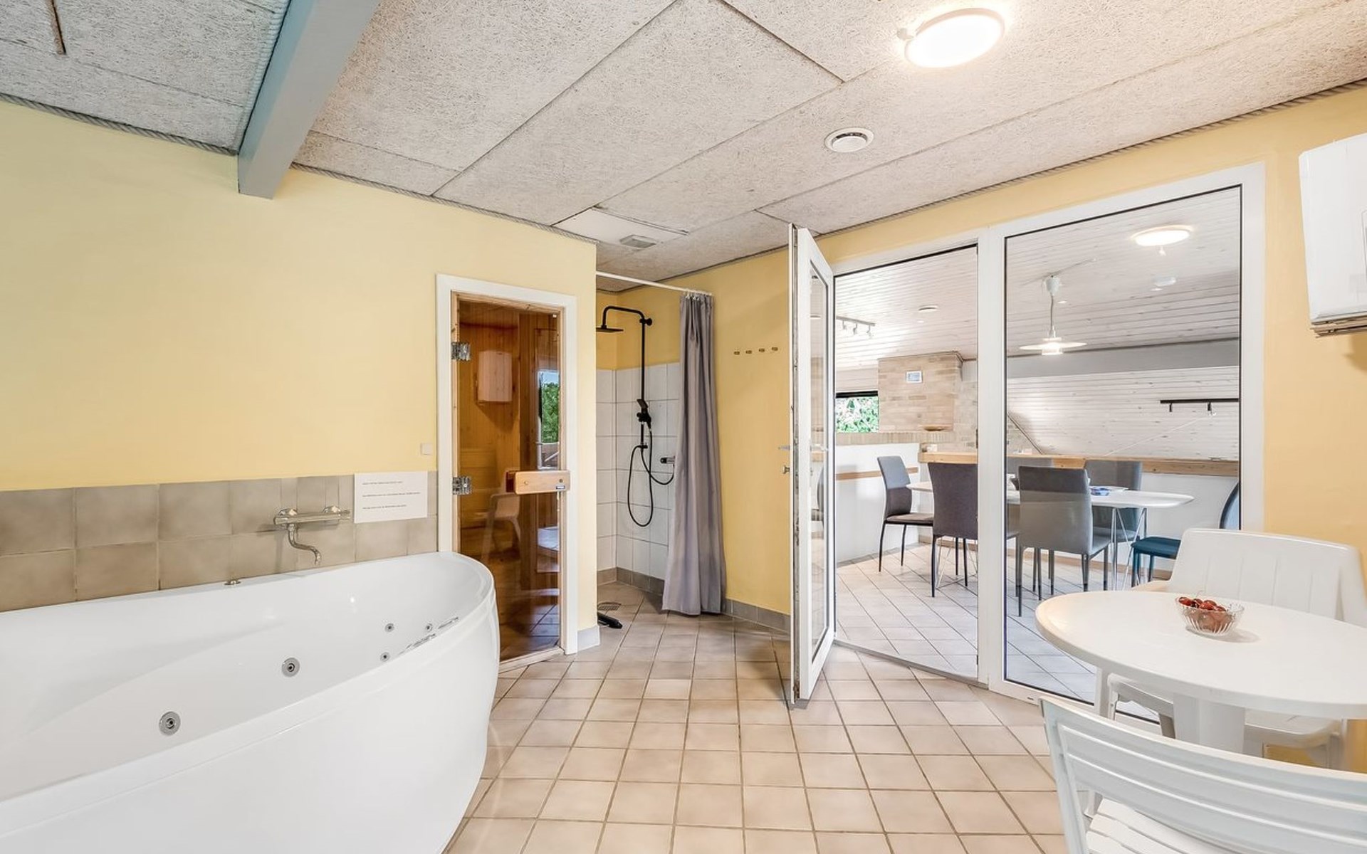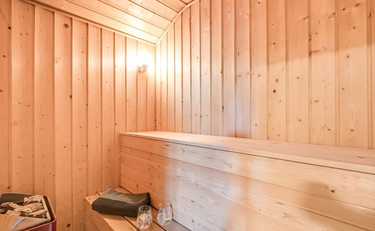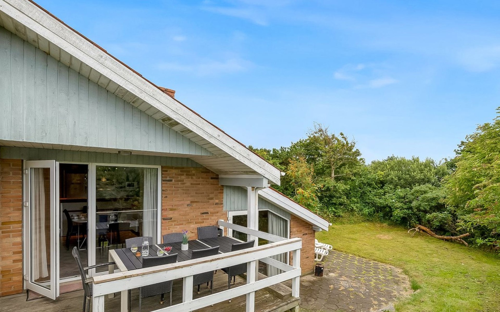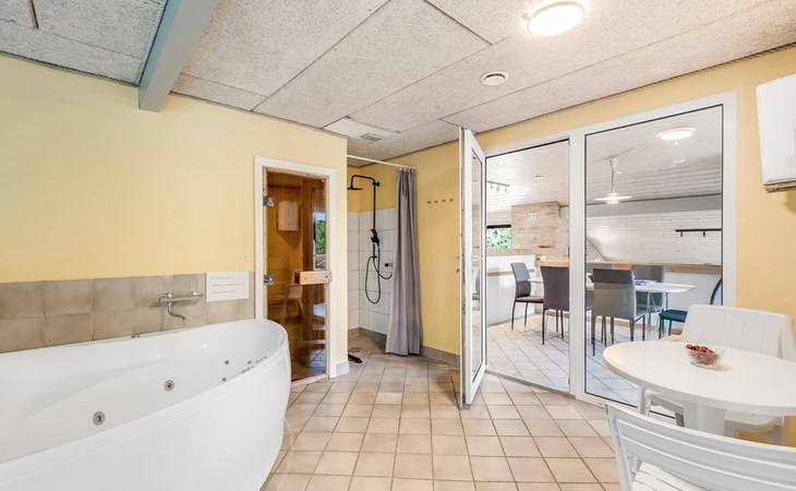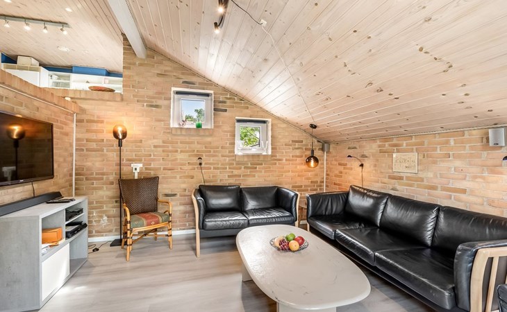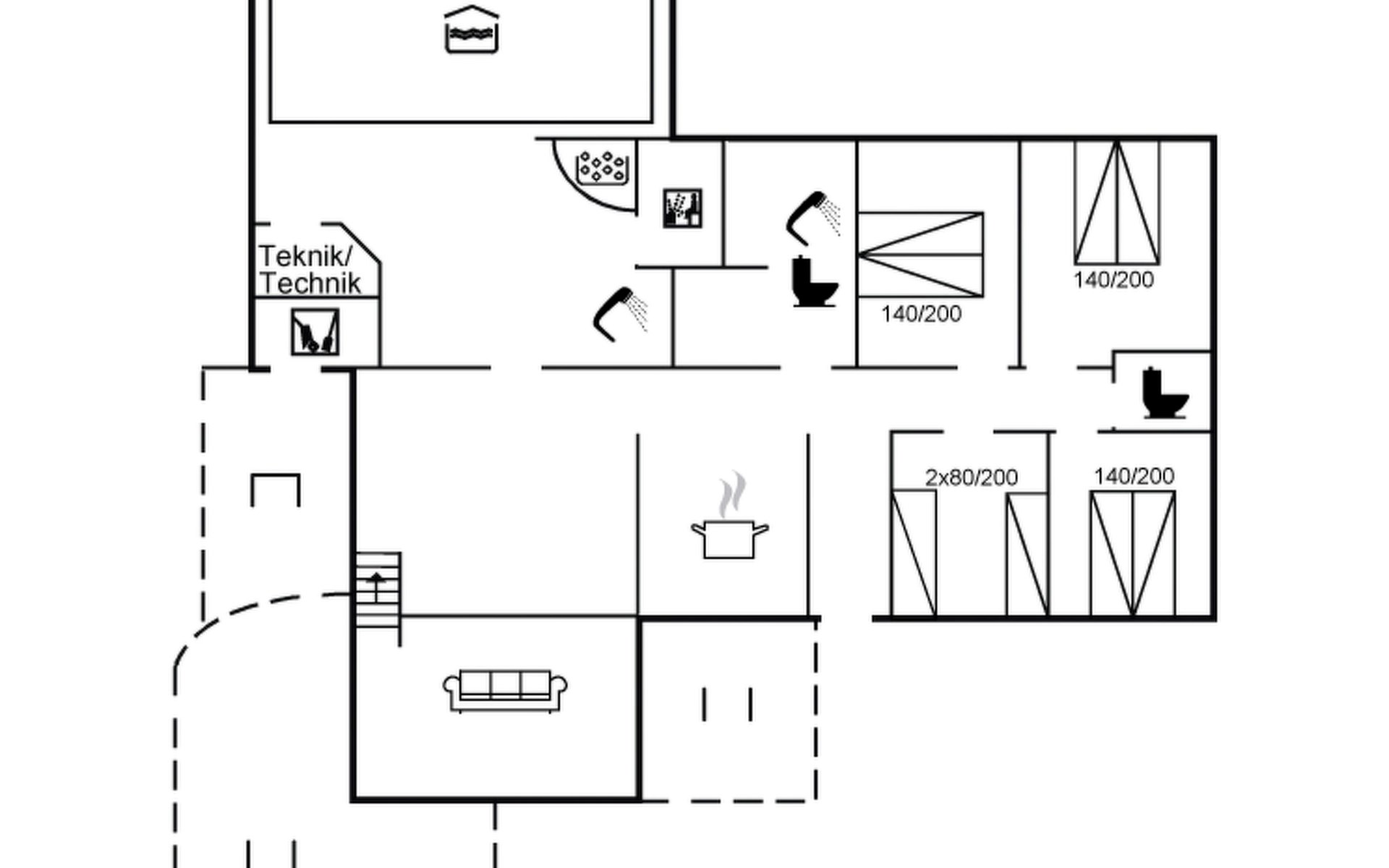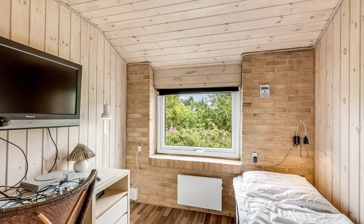 Single-family house, built in 1993. 1.3 km from the sea. Private: natural state property 2'002 m2, indoor pool (3 x 5 m, 1'7.6 m2, depth 120 - 120 cm). Terrace (47 m2), children's playground (swing). In the house: sauna, washing machine, tumble dryer. Parking at the house. Grocery 2.4 km. Golf course 500 m. The owner does not accept any youth groups.