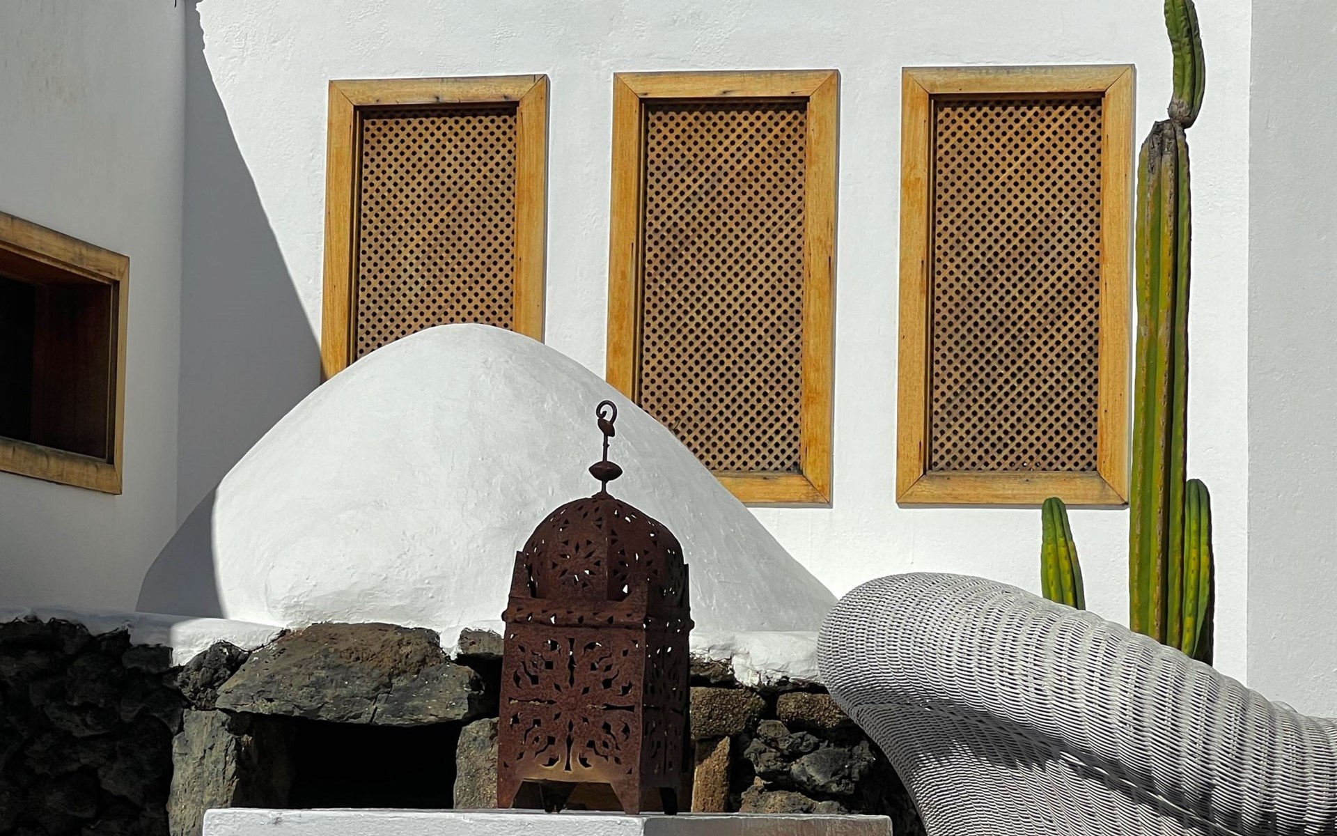You enter "Casa HIBISCO" through the picturesque inner courtyard of the farmhouse, which has been lovingly restored over many years. The unusual and southern architecture and the private garden of Casa HIBISCO make the special charm.The kitchen is charming, well equipped and lovingly designed.Real lava stone floor, wooden furniture, Moroccan lamps, handmade pictures, the brick kitchen unit with handmade ultramarine blue tiles & the many homemade details give it a fresh and special touch.The kitchen leads directly to the large terracotta tiled sun terrace, to the other rooms of the CASA and to the garden. The terrace tempts you to feast, sunbathe, chat, reflect, lazy and make you PLEASURE of an incomparable barbecue evening under the shining stars of Lanzarote.The bright hallway, which connects the rooms as well as inside and outside, leads into the other rooms of the house.The cozy salon, the most historic room in the entire FINCA, has an enamelled cast iron fireplace and a 32inch TV (Astra / German programs, English news) and invites you to cuddle and relax.The bathroom is spacious and of high quality with a washbasin, a bidet, a toilet and a walk-in shower with a rain shower. Hardwood floorboards, hand-painted pictures, natural slate and a lava stone wall give this room its charm.The bedroom. Here, to the Finca Creativa colors, blue, white and black, red elements have been added. Romantic lighting, hardwood floorboards, wooden ceilings, curtains and a second direct access to the beautiful garden make it a place of rest and relaxation. The dressing room offers plenty of space for clothes, suitcases and beach items.