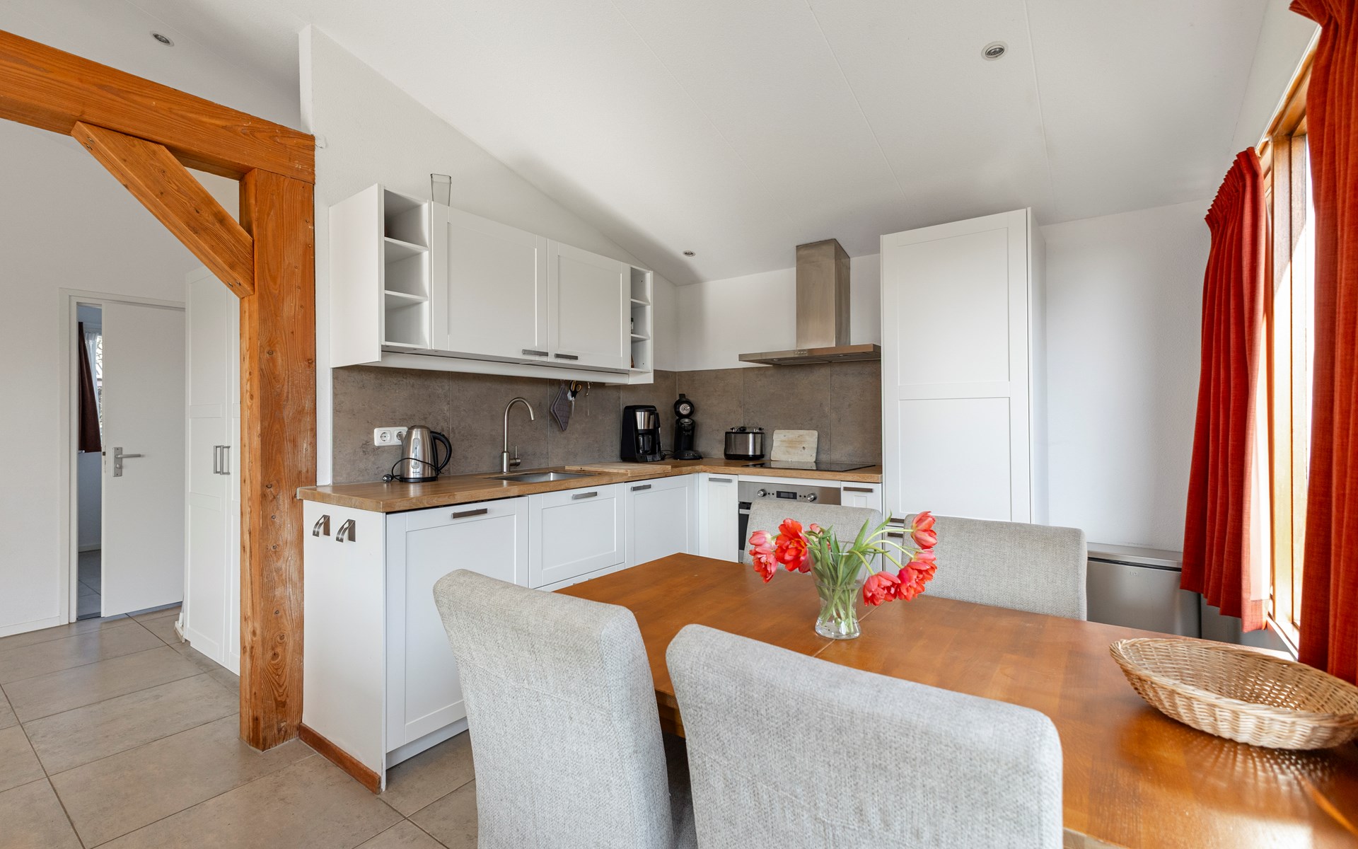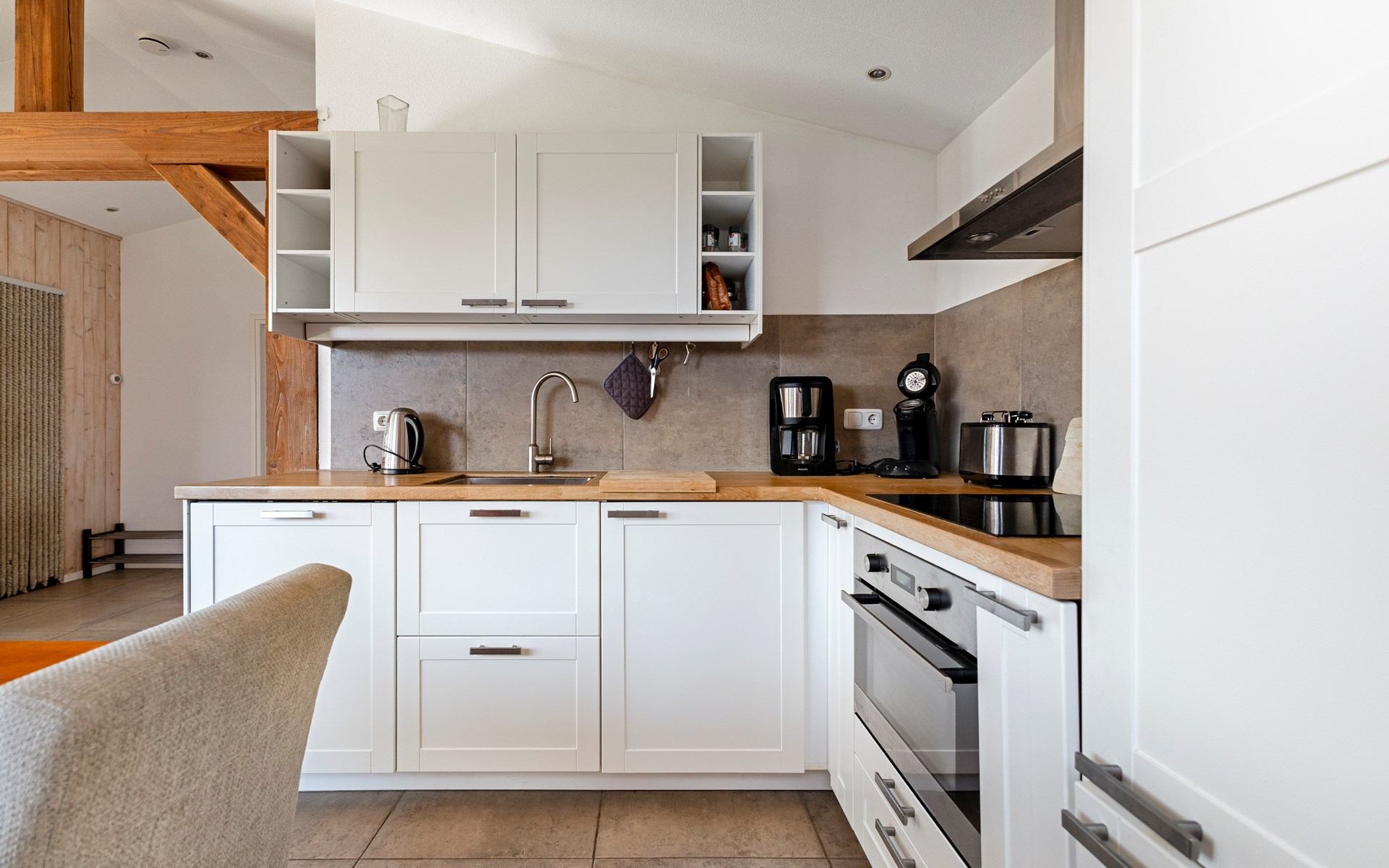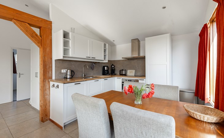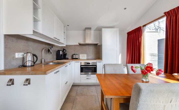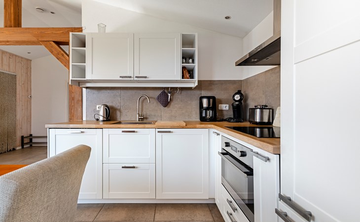 The open kitchen is fully equipped and includes a dishwasher, induction hob and combination microwave with convection oven. Whether you enjoy cooking elaborate meals or preparing something simple, everything is available for a carefree stay.