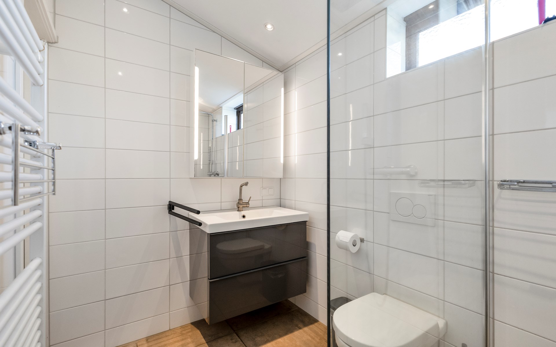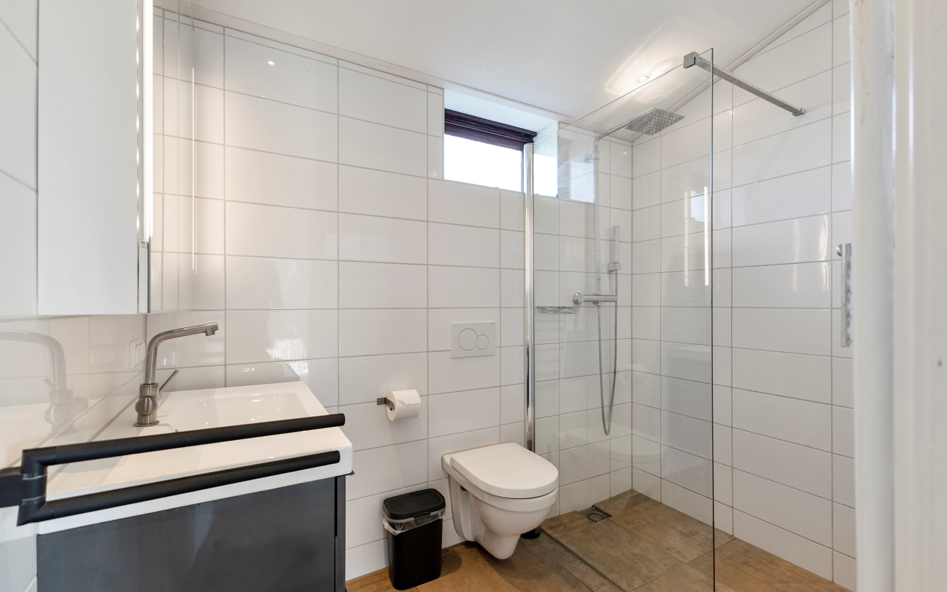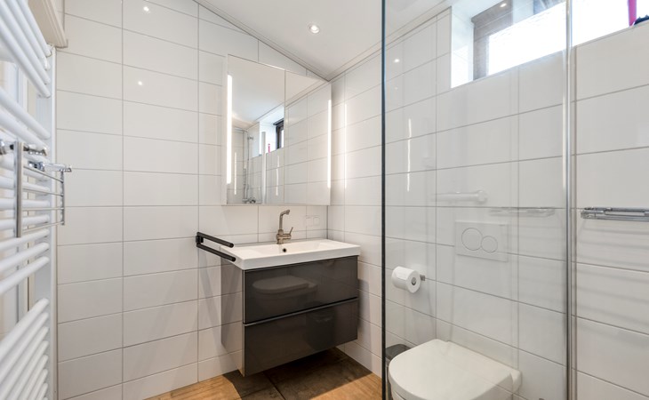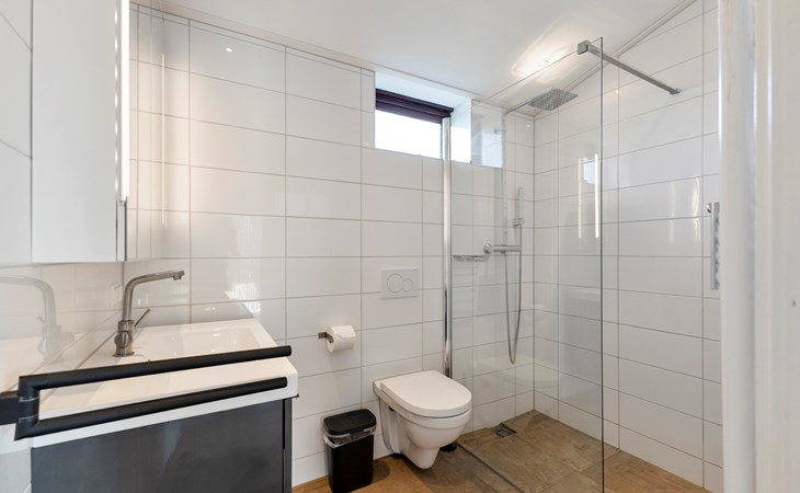 The stylish bathroom includes a spacious walk-in shower, toilet and washbasin — fresh, modern and comfortable.