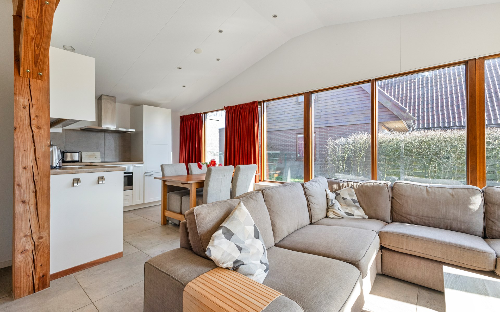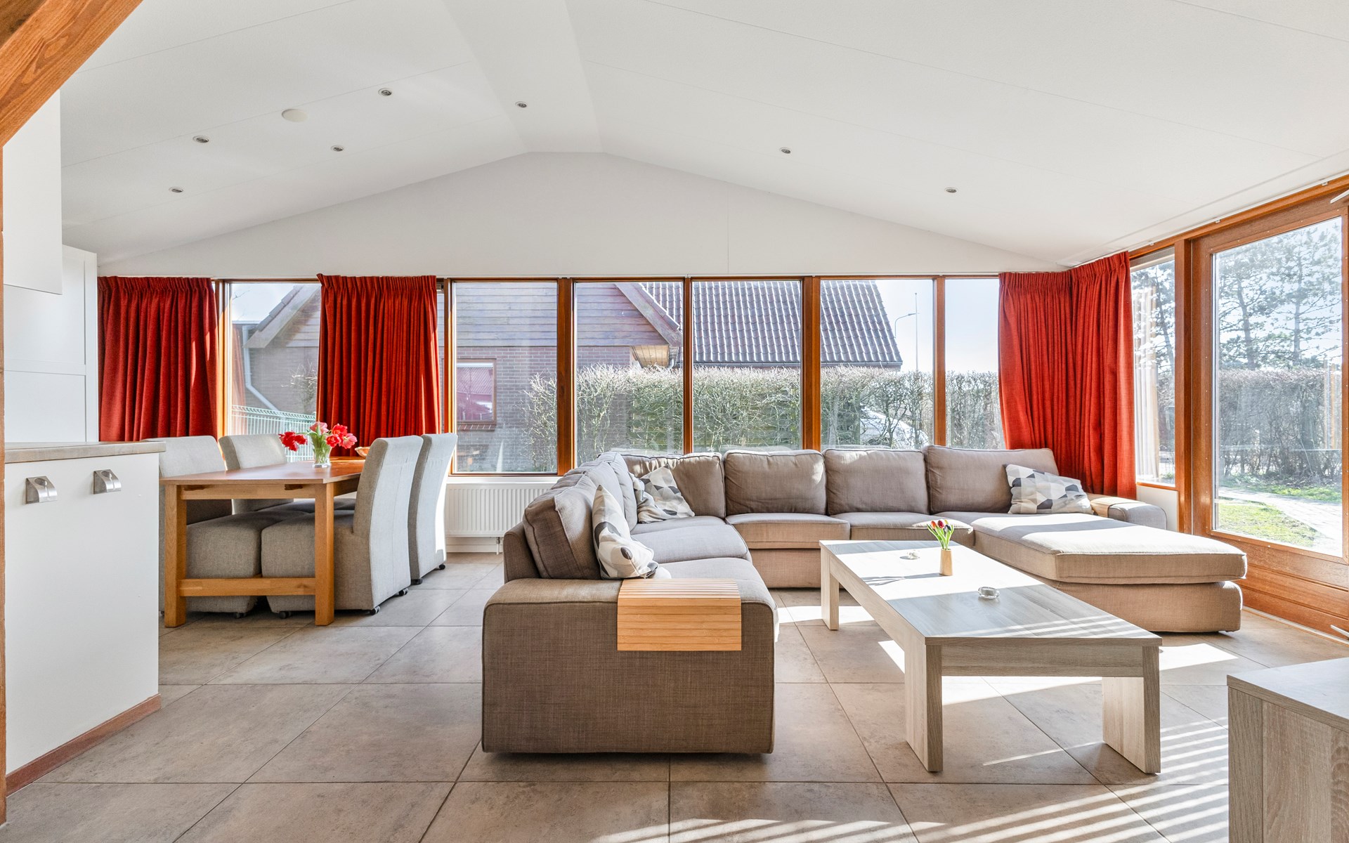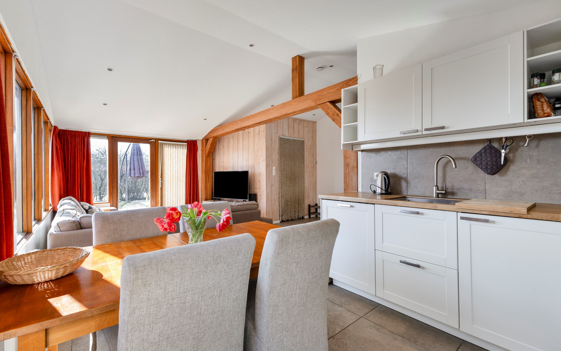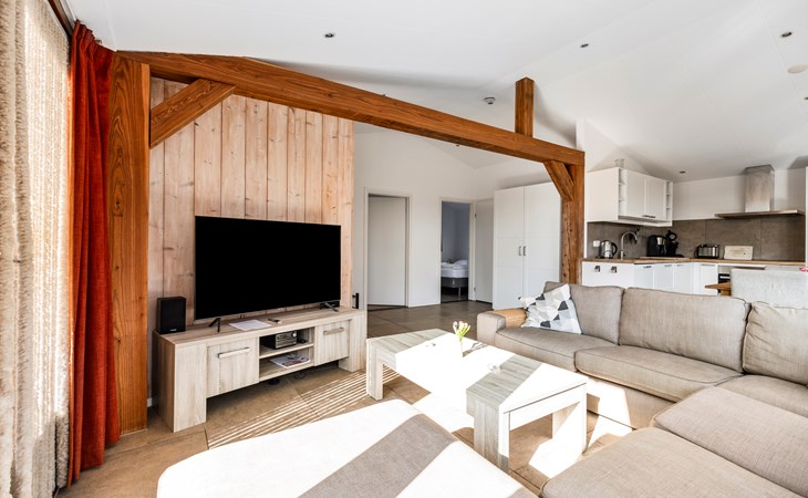 The living area is wonderfully bright thanks to large windows and offers a pleasant place to unwind after a day at the beach. The open layout seamlessly connects the lounge, dining area and kitchen, creating a spacious and welcoming atmosphere.