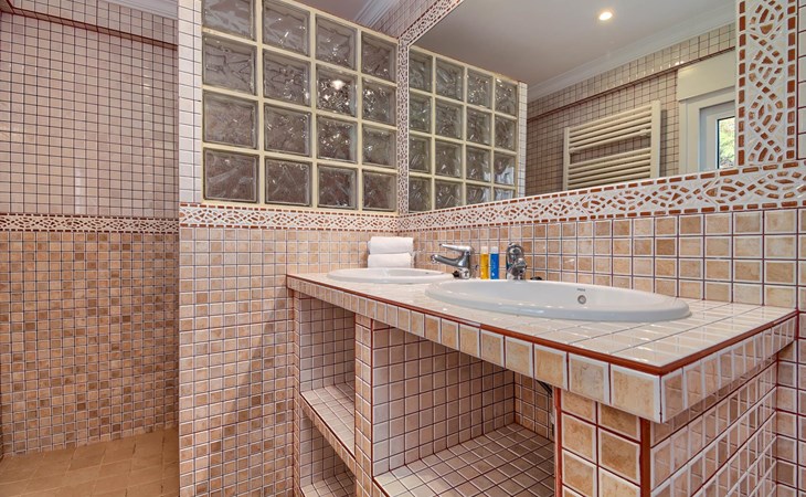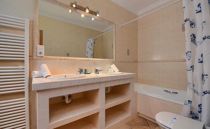 - en-suite bathroom with double washbasin, bath, bidet and toilet