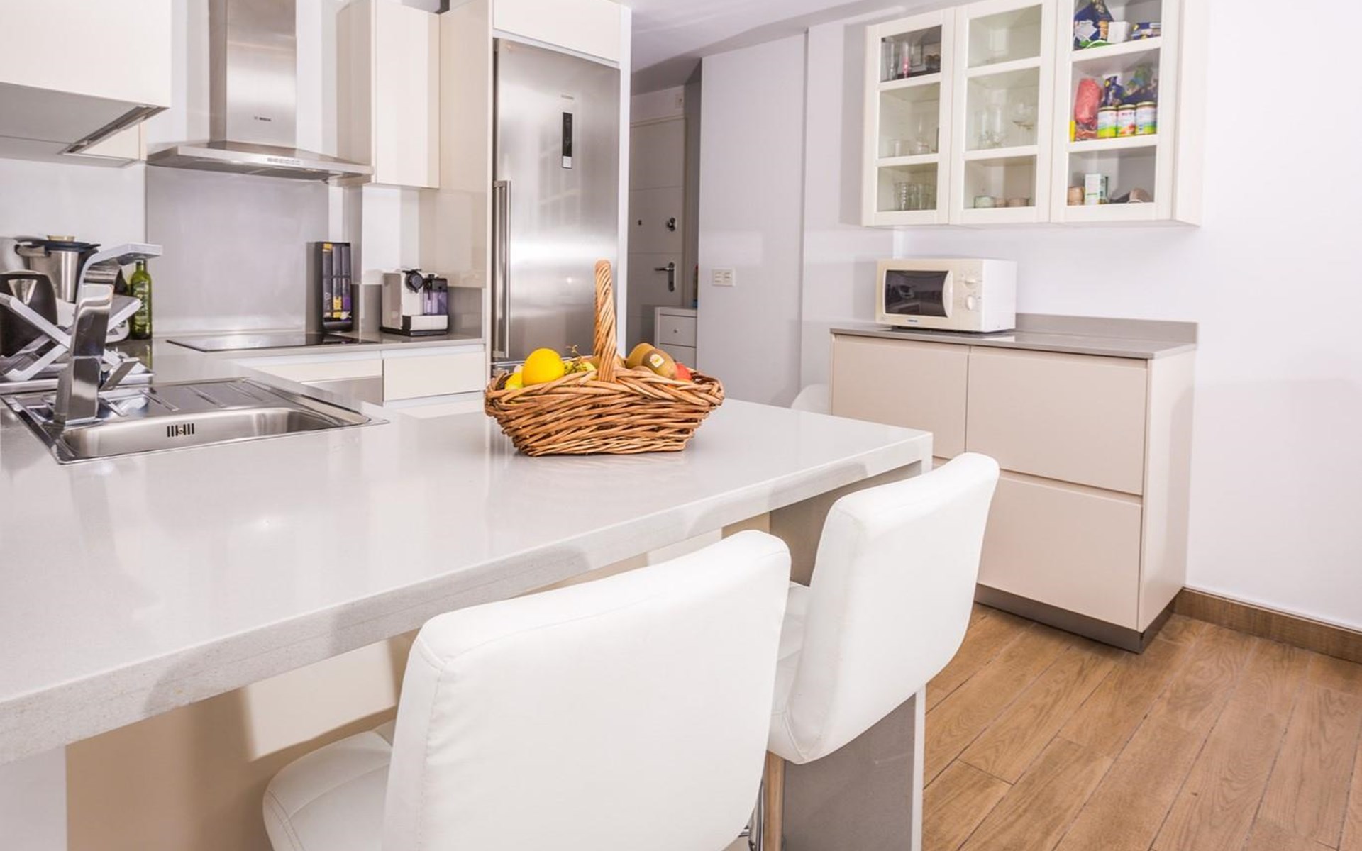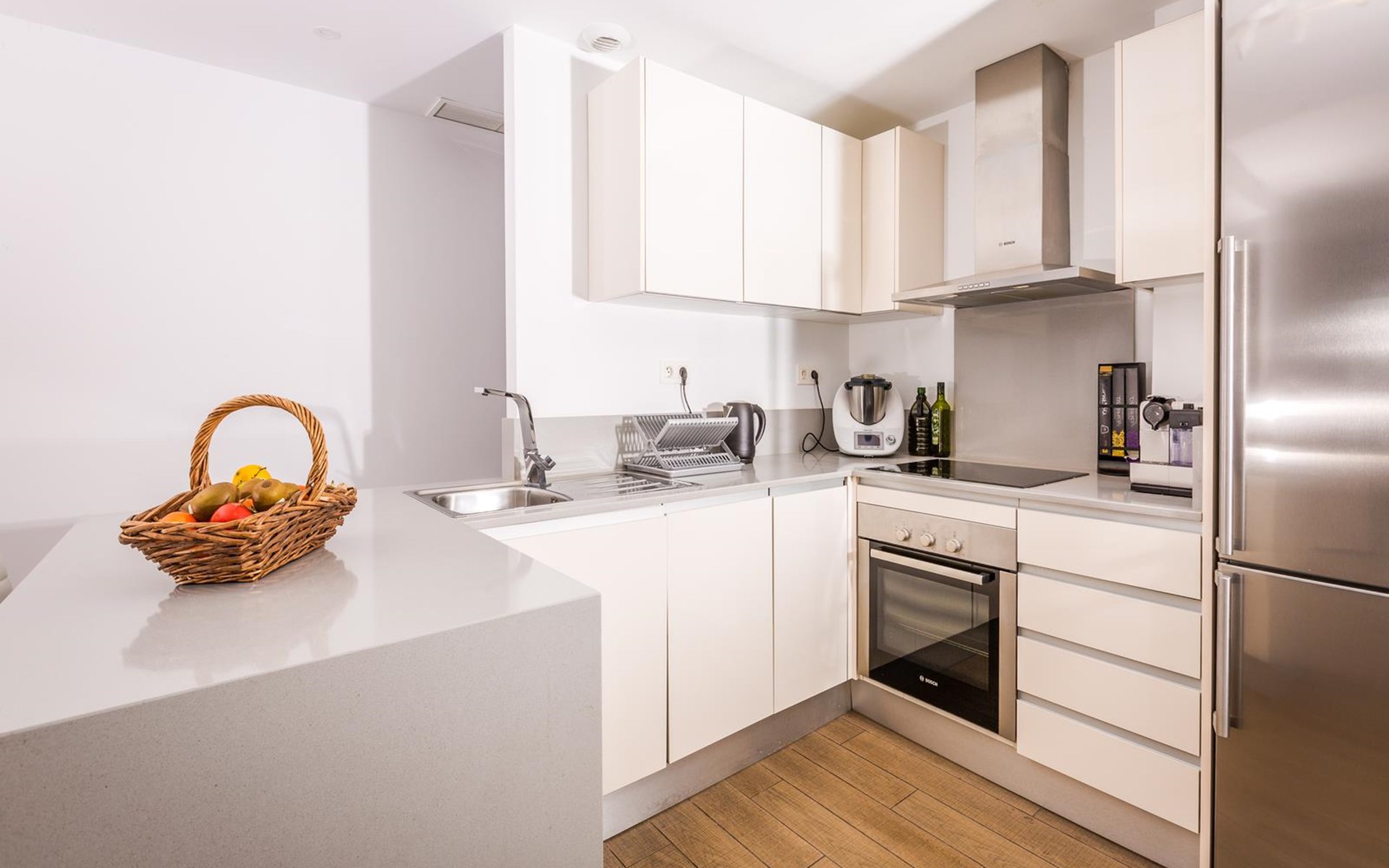 - Kitchen with electric hob, electric oven, microwave, dishwasher, refrigerator-freezer, coffee machine, electric kettle, toaster and juicer