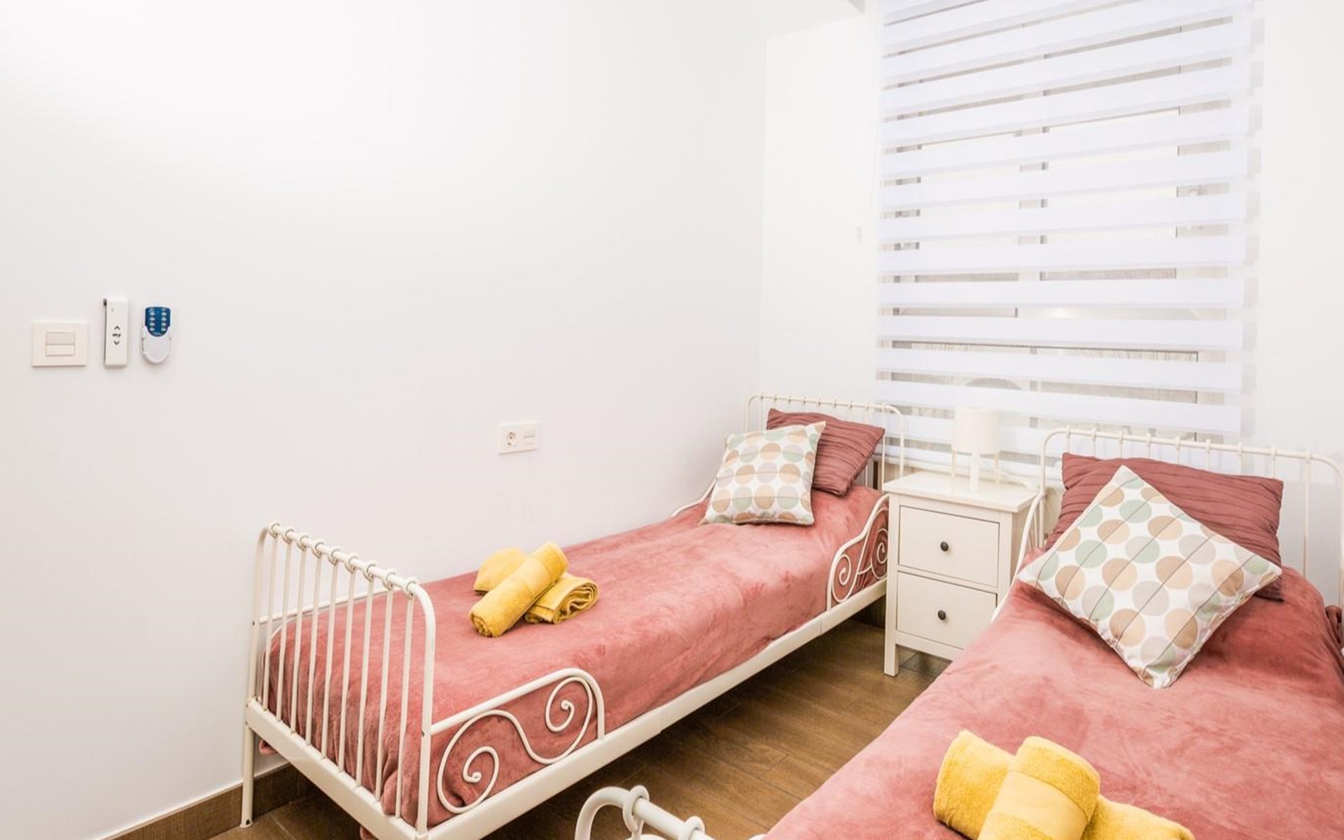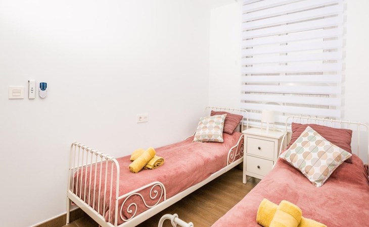 - Bedroom with air conditioning, 2 single beds (measuring 200 by 90cm) and fan