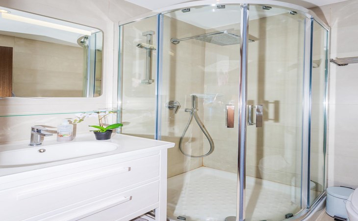 - Bathroom with single washbasin, shower, toilet and hairdryer
