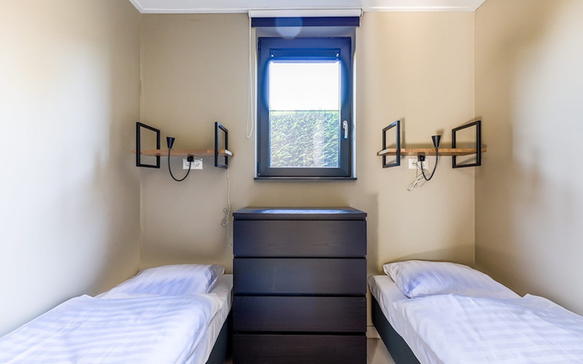 The chalet has three bedrooms: two bedrooms each with two single beds placed together, both equipped with their own Smart-TV, and one bedroom with two separate single beds.