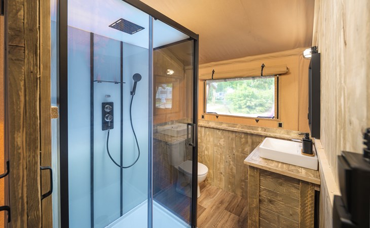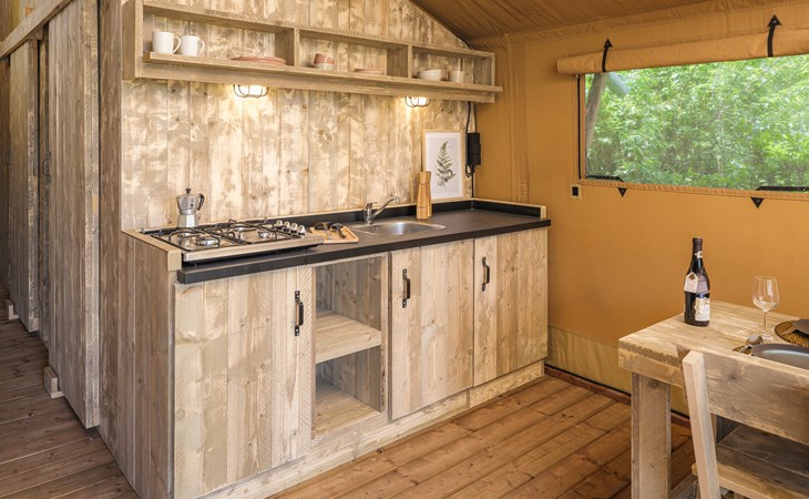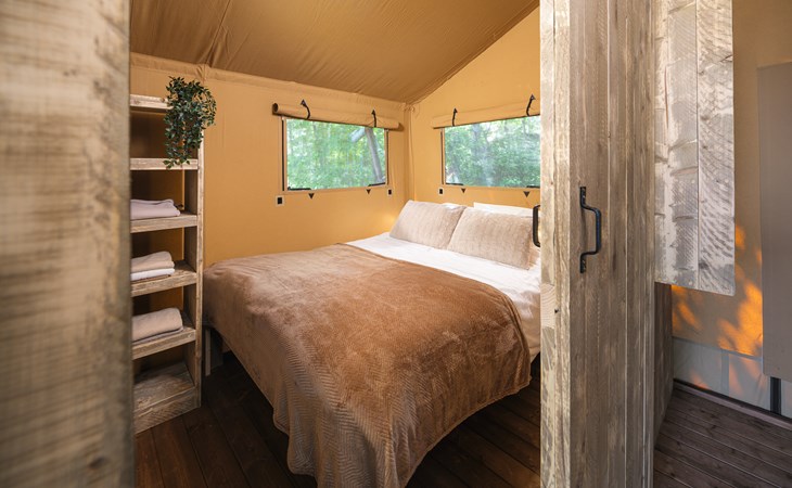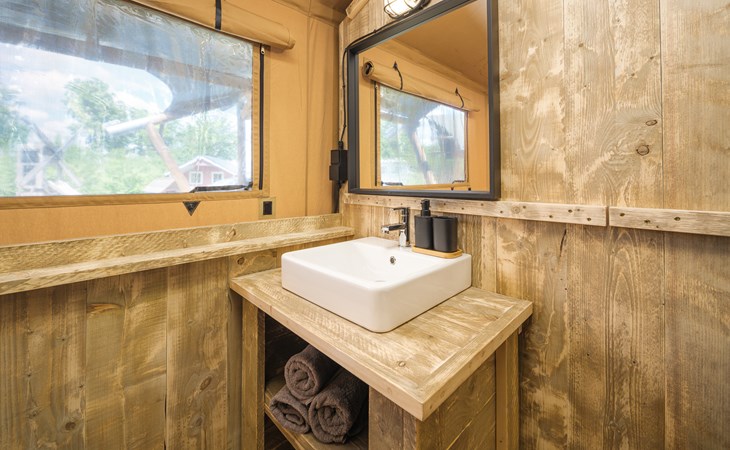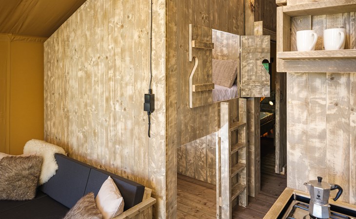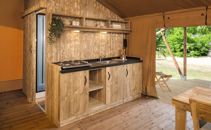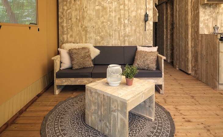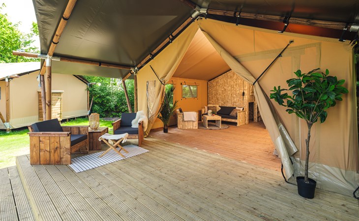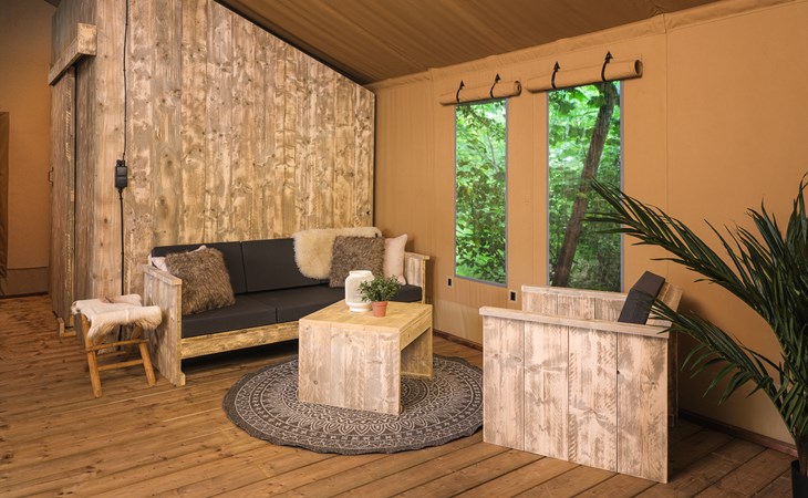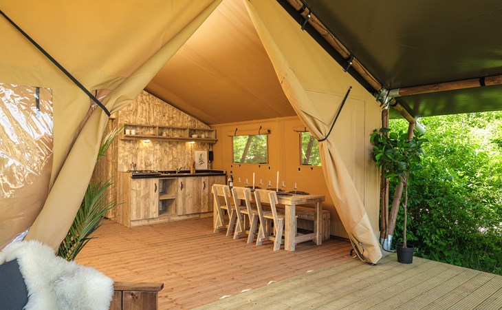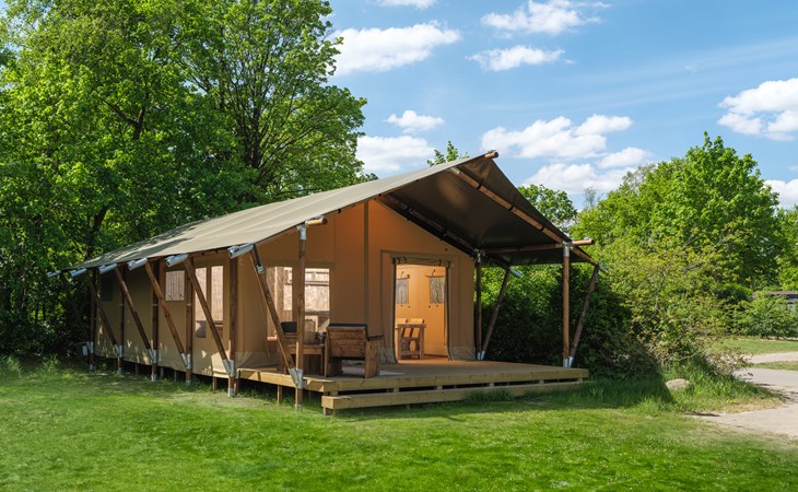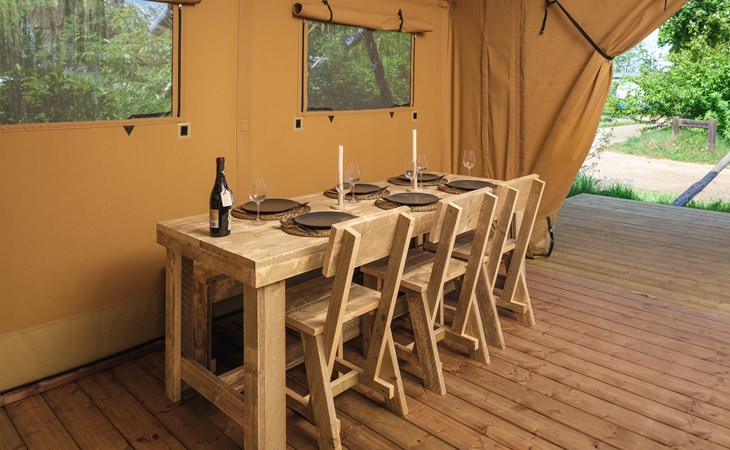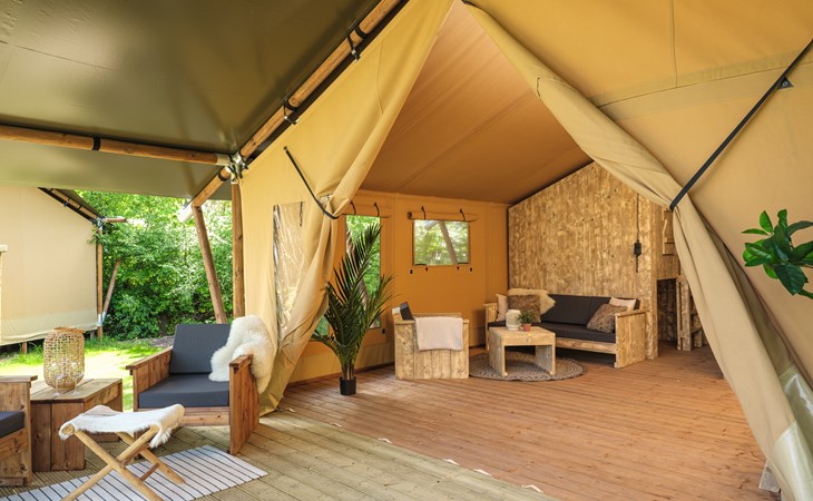 In this spacious and luxurious safari tent with private bathroom, your holiday starts the moment you drop your bags. The tent sleeps eight people and offers everything you need for a relaxing stay.Â
