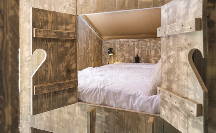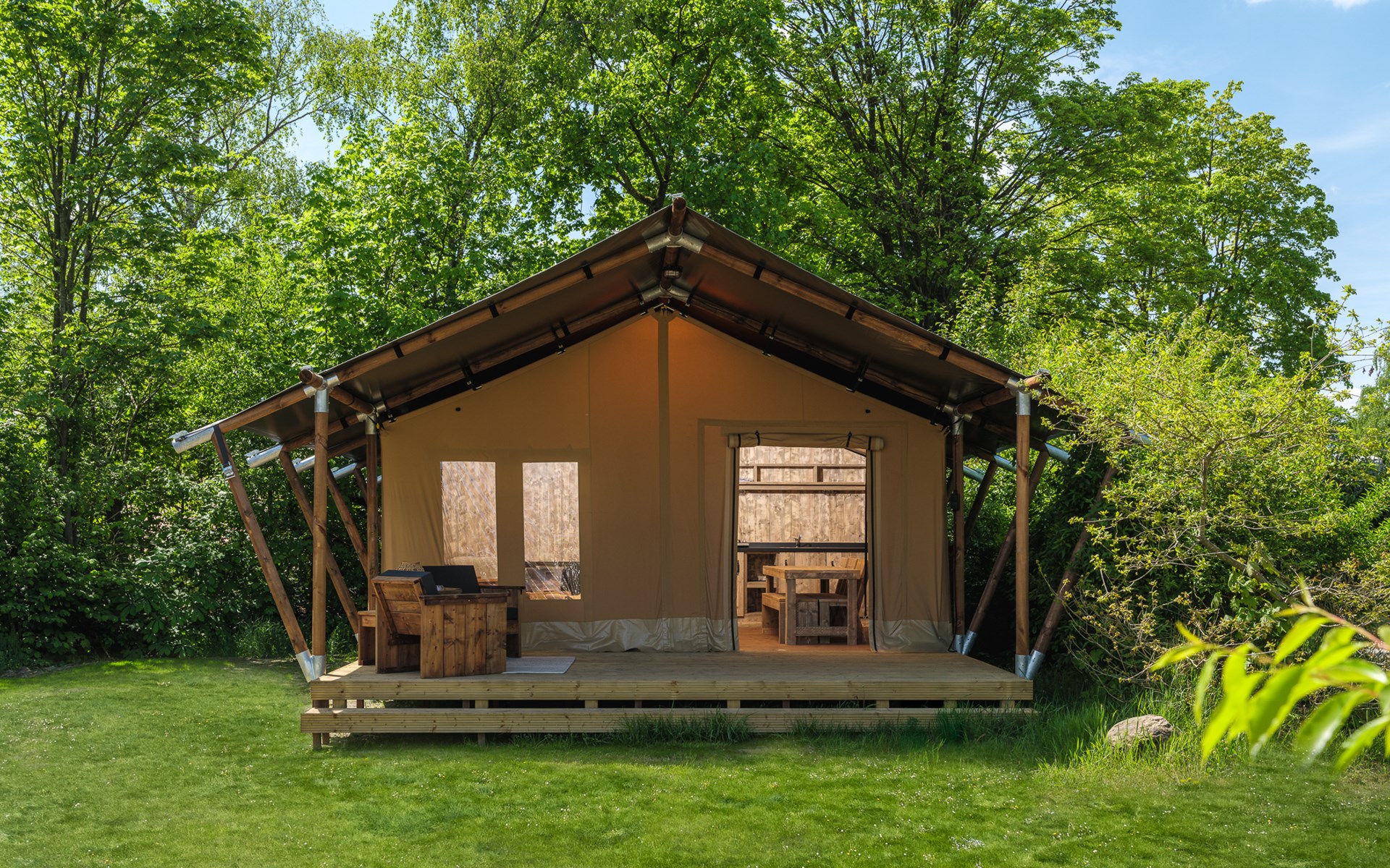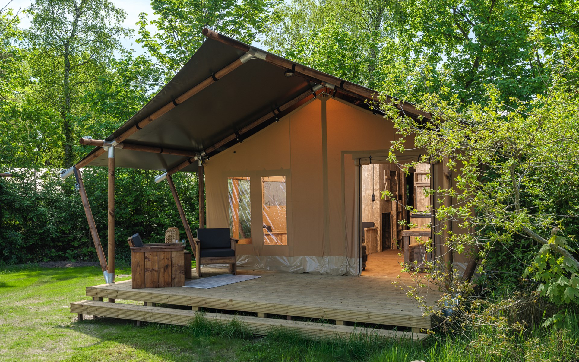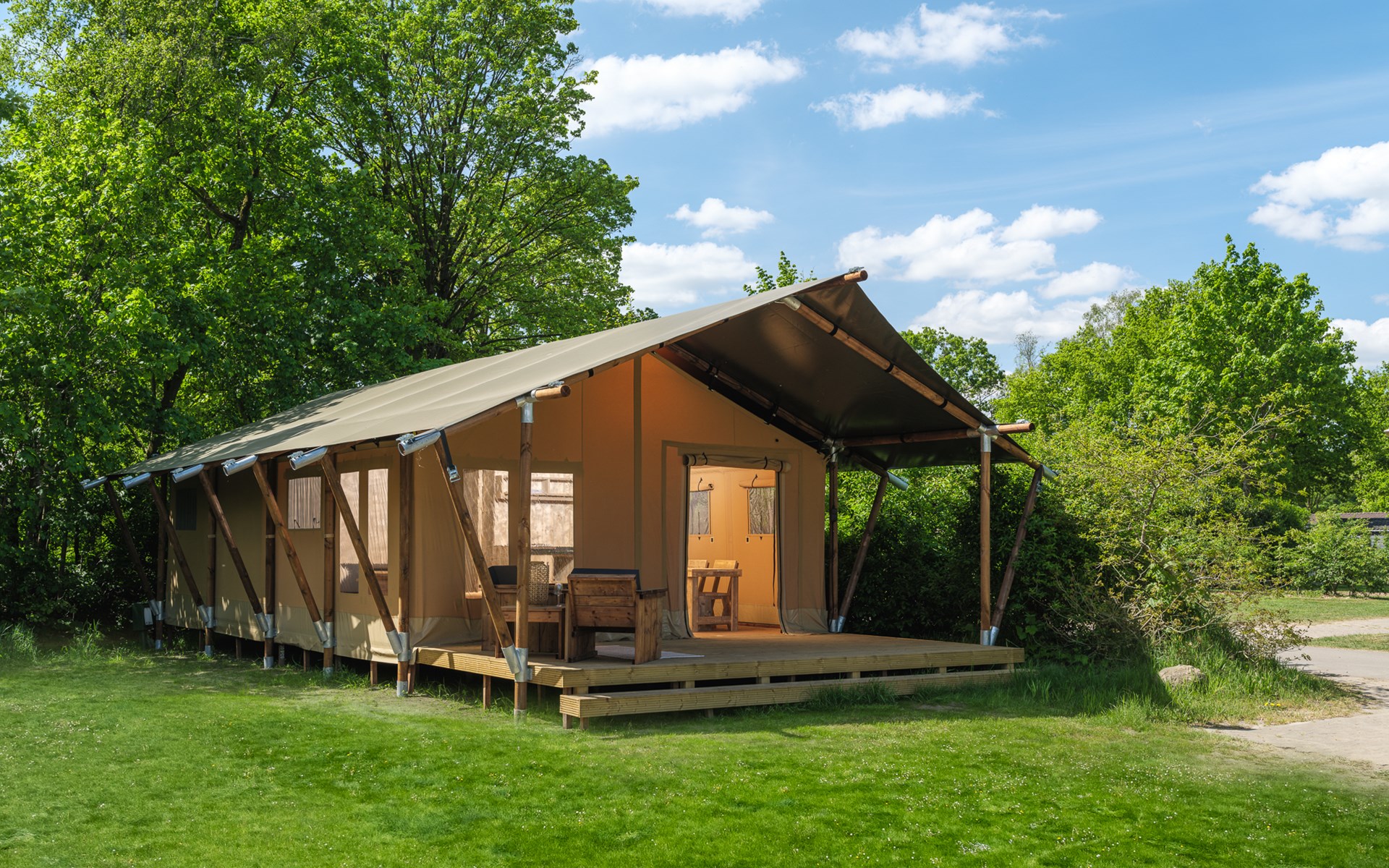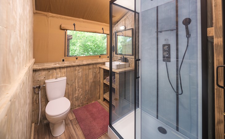 In this spacious and luxurious safari tent with private bathroom, your holiday starts the moment you drop your bags. The tent sleeps eight people and offers everything you need for a relaxing stay.Â