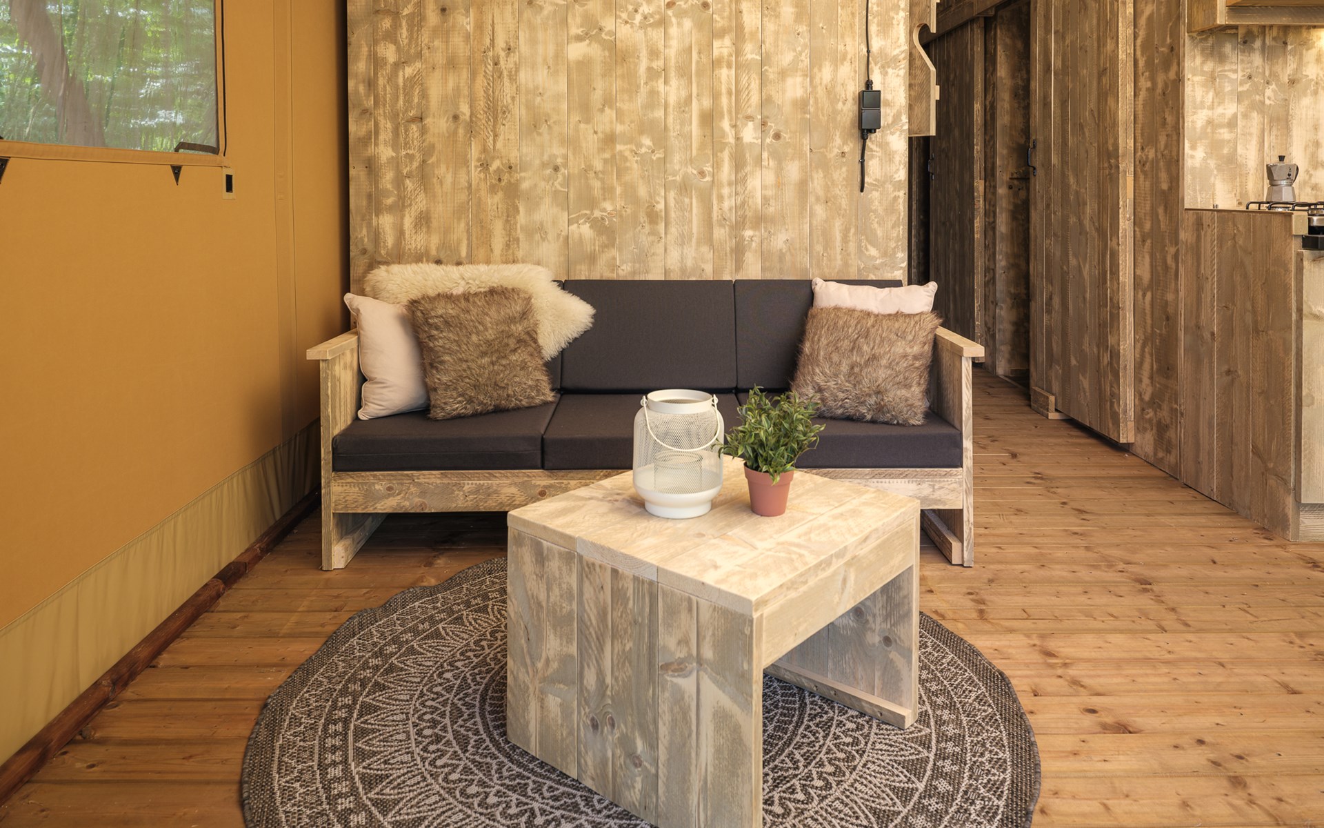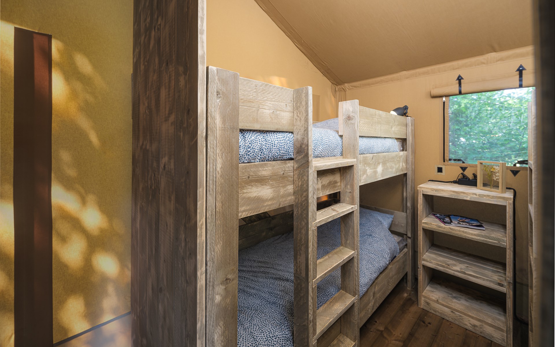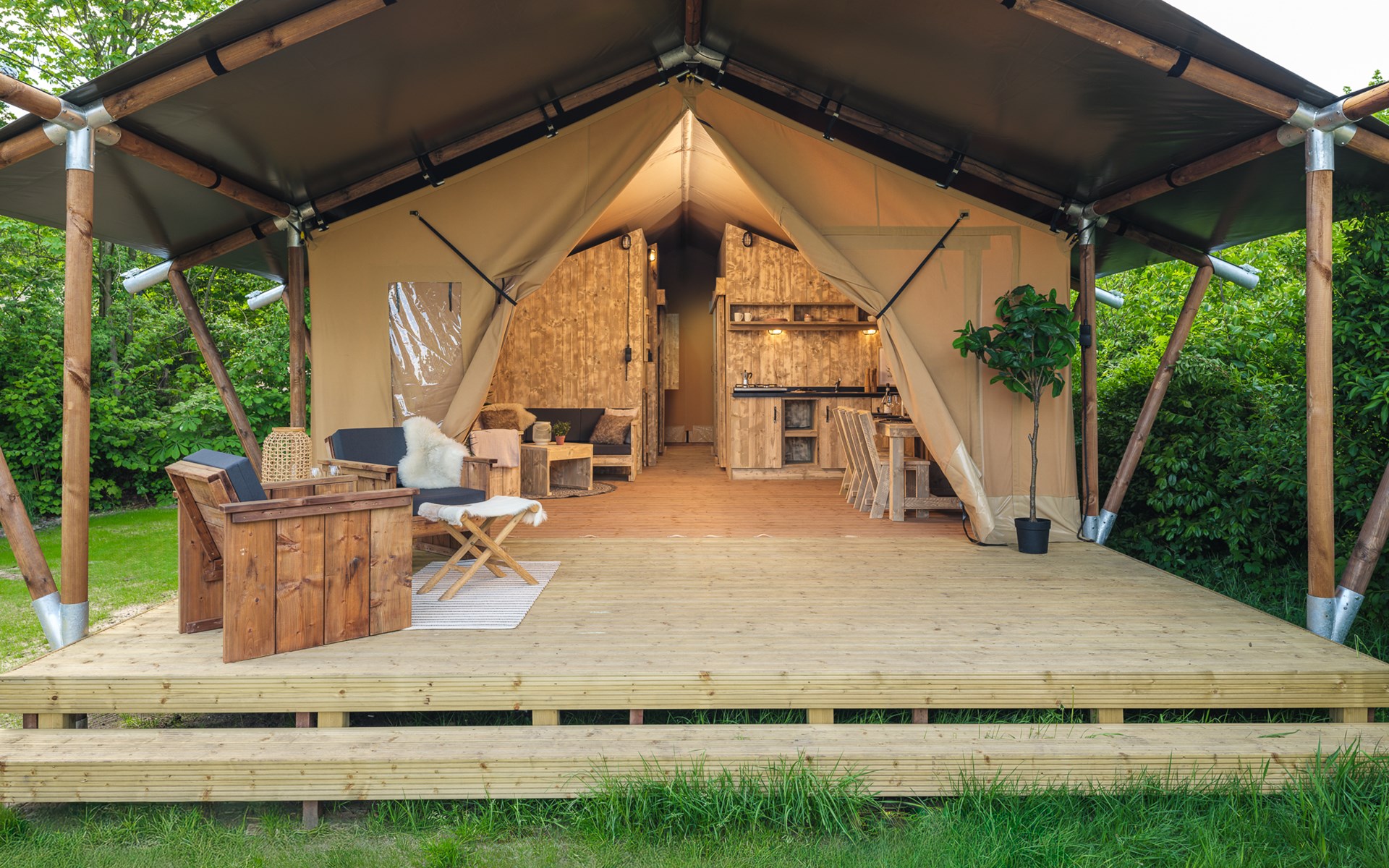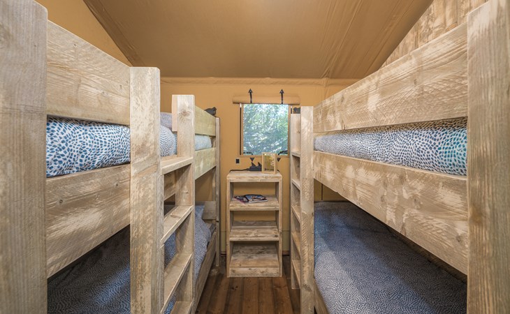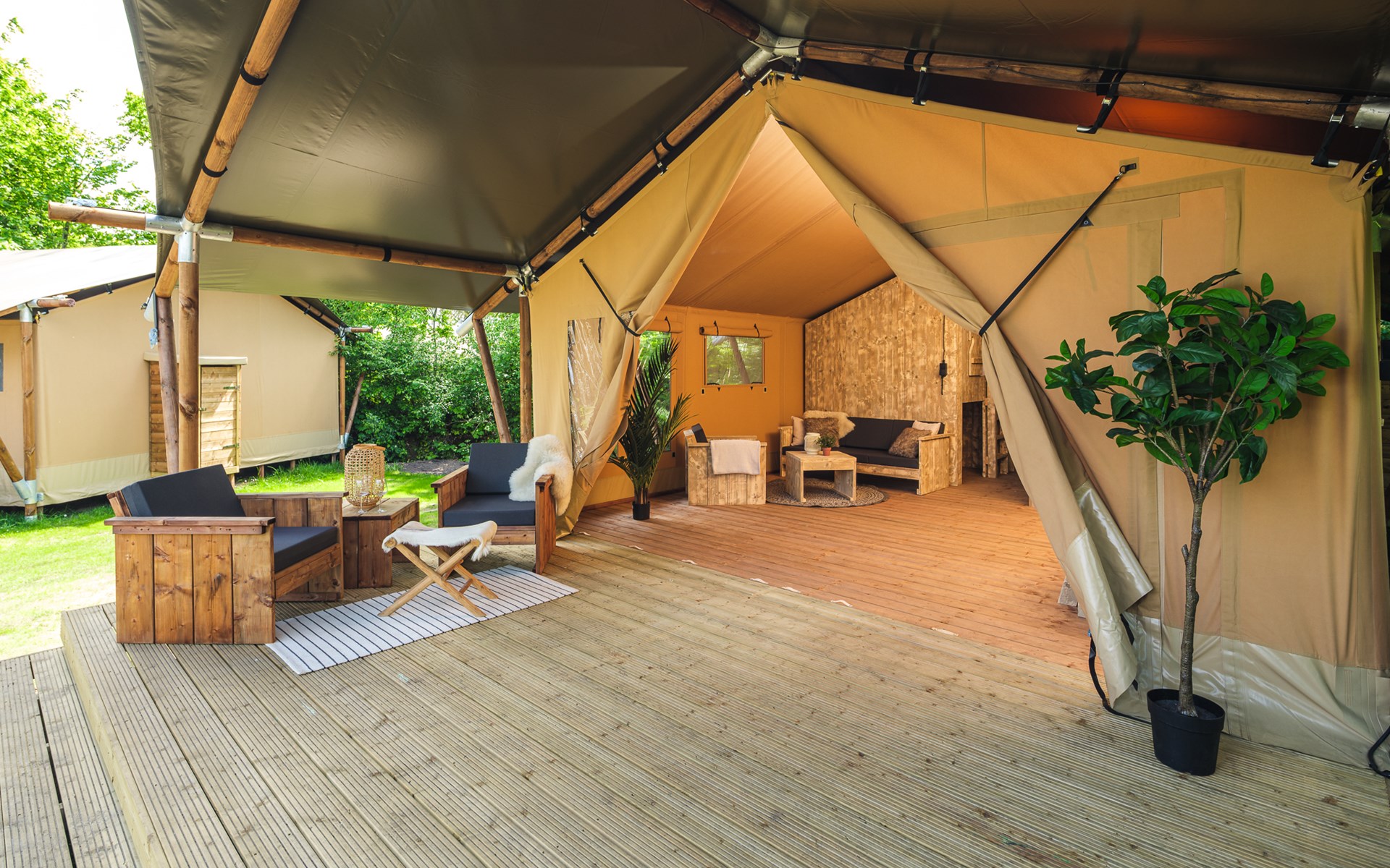 In this spacious and luxurious safari tent with private bathroom, your holiday starts the moment you drop your bags. The tent sleeps eight people and offers everything you need for a relaxing stay.Â