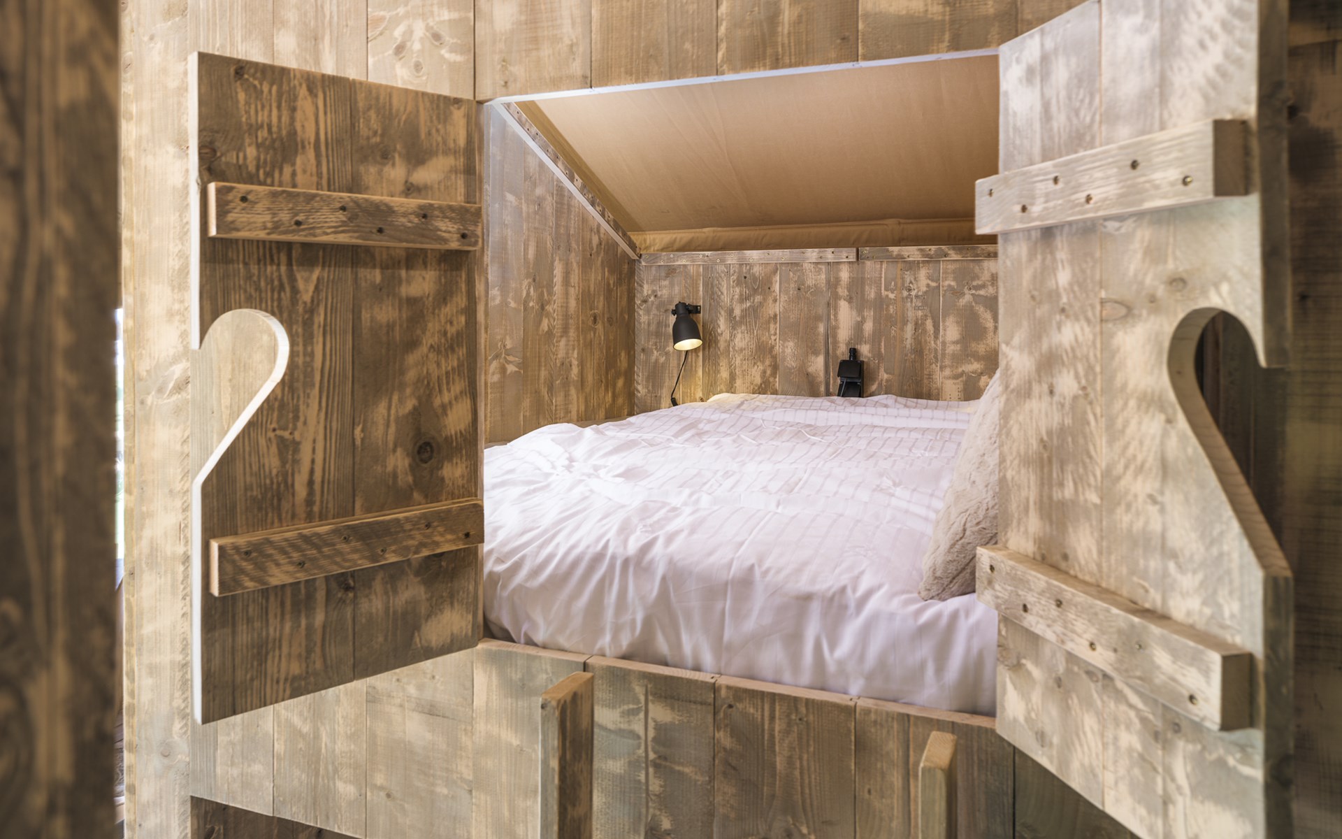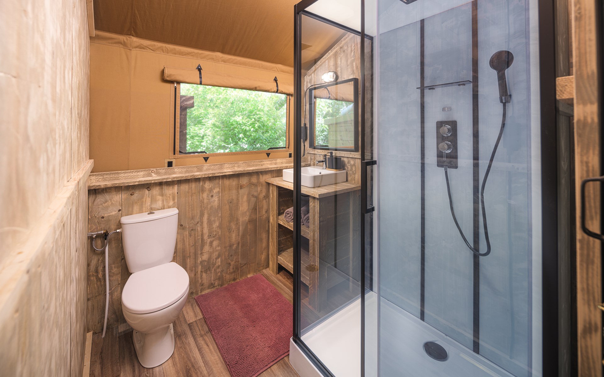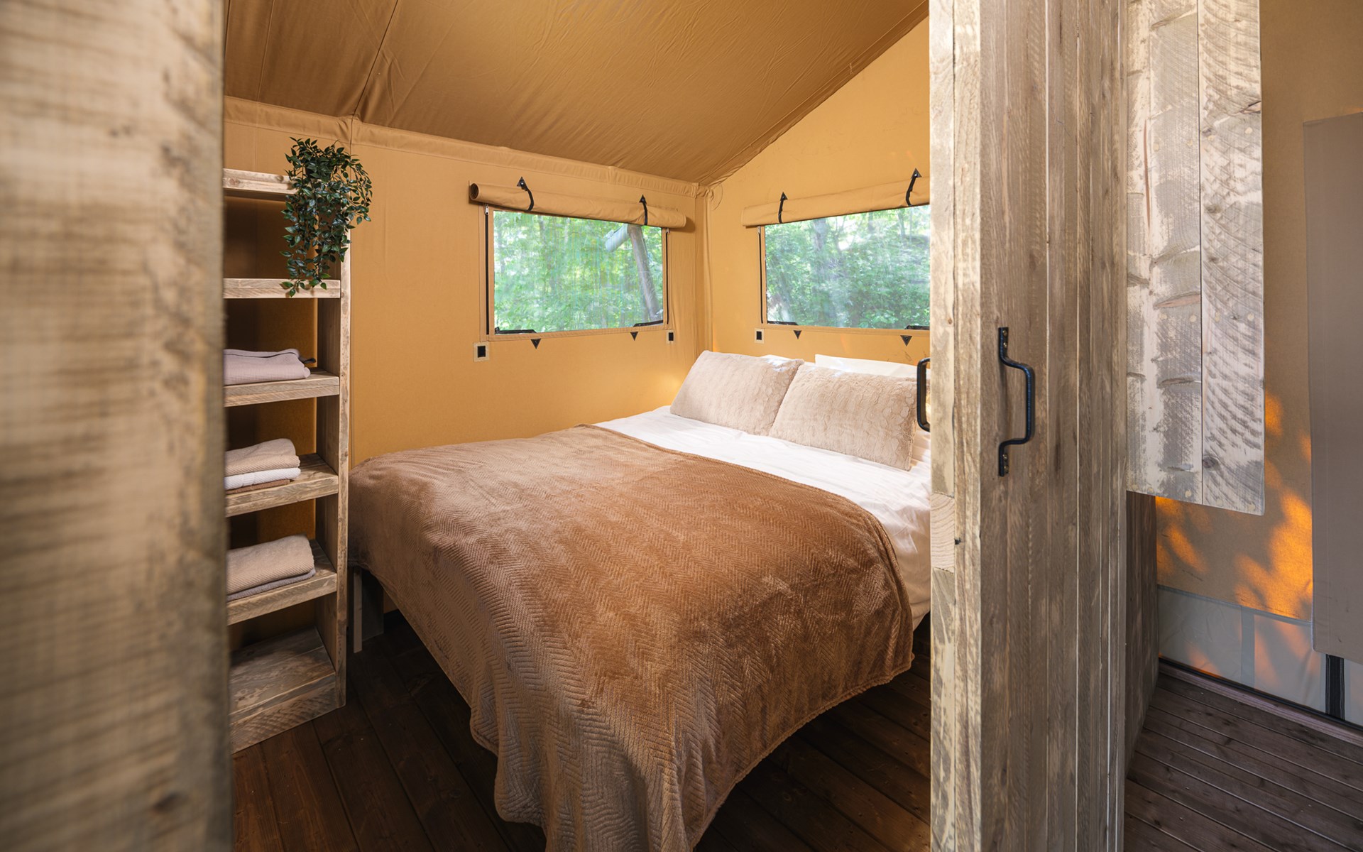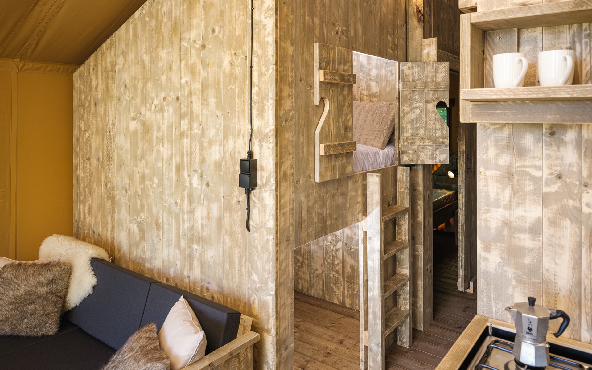 In this spacious and luxurious safari tent with private bathroom, your holiday starts the moment you drop your bags. The tent sleeps eight people and offers everything you need for a relaxing stay.Â