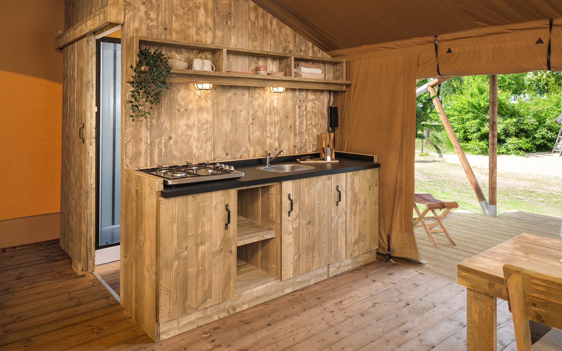 Inside, you’ll find a comfortable bathroom with a rain shower and toilet. The kitchen is fully equipped with a fridge and cooking facilities. Want to prepare something yourself? You can. Prefer not to cook? Simply join us in the restaurant. It’s one of our favourite spots.Â