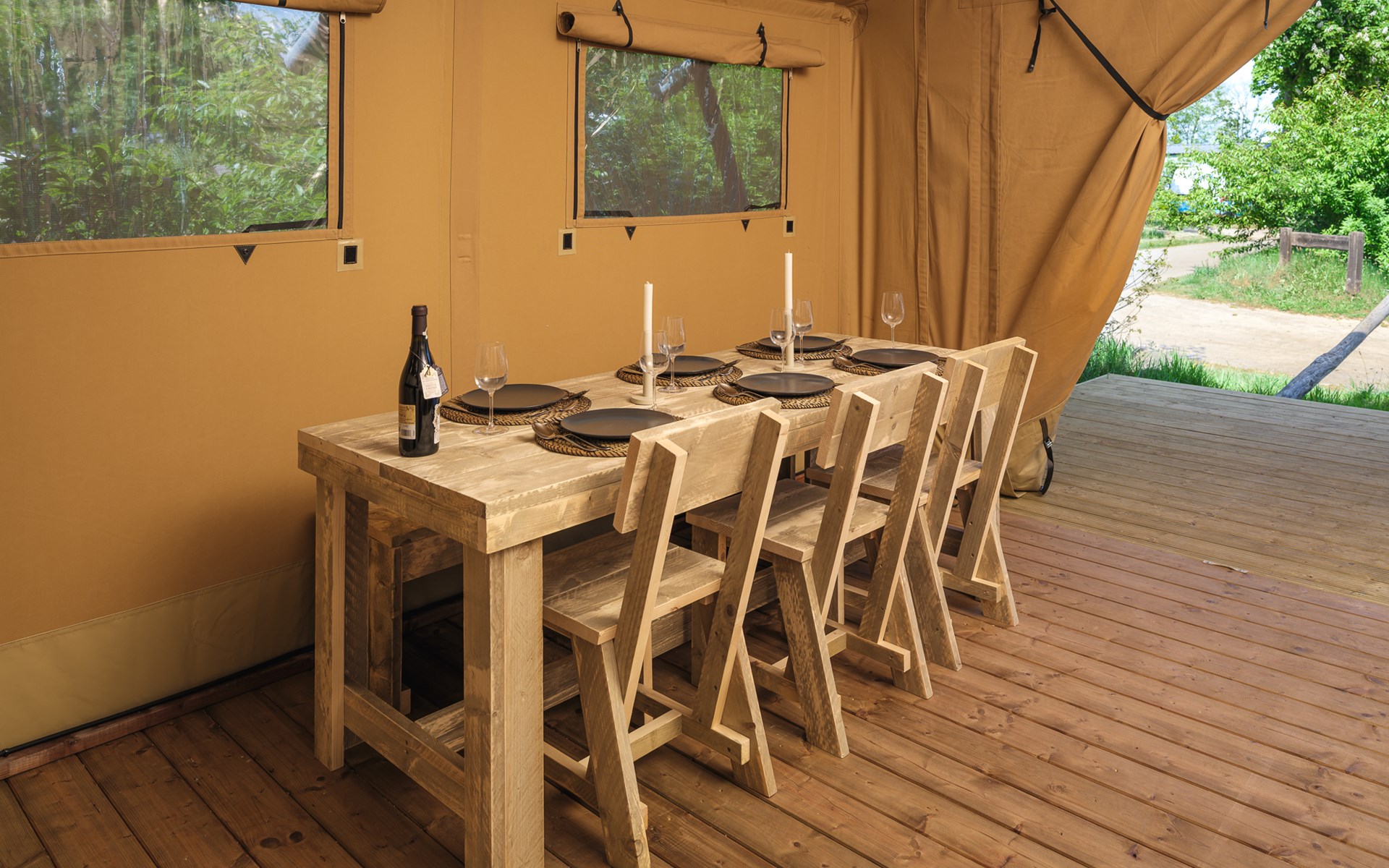 Outside, the tent offers plenty of space with a large wooden deck. A lovely place to unwind together. The picnic table is ideal for sunny breakfasts, family games or just enjoying the moment.Â