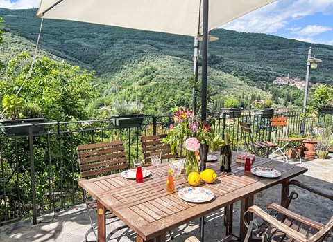 From here you can access the partially covered terrace with garden furniture. Spend many relaxing hours on the sun loungers in the shade of the olive tree and enjoy meals at the garden table overlooking the hilly landscapes and the sea.
