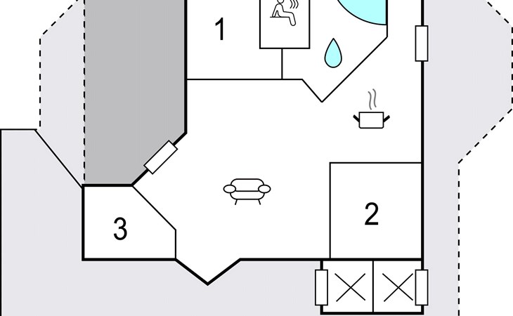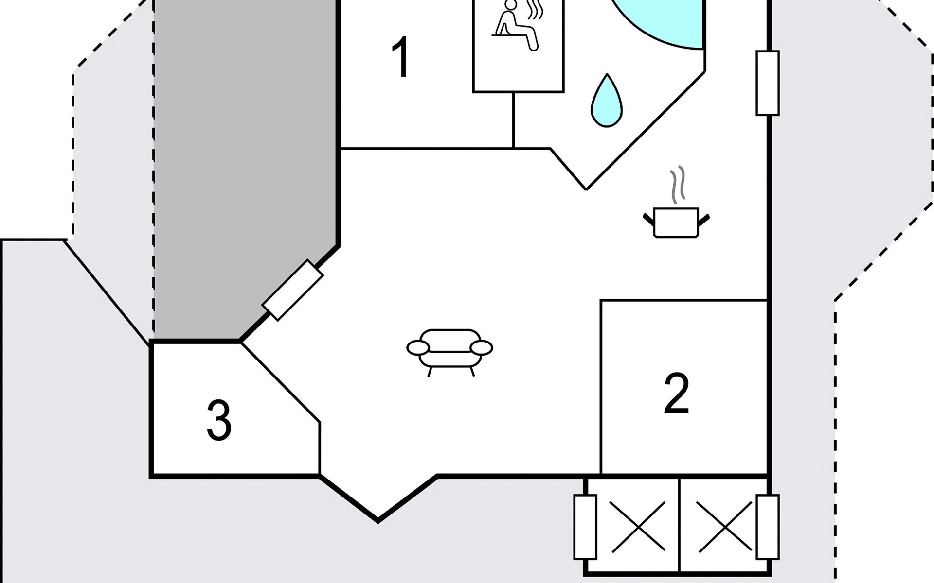 The cottage is furnished with bright furniture and has an open kitchen-living room characteristic of the Nordic style. There are three nice bedrooms and a bathroom with wellness area. Outside, the terraces are spread along three sides of the facade, so you will always find a windless spot outside. From the kitchen-living room you have access to all the terraces.