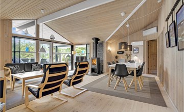 Look forward to a fantastic vacation in this beautiful vacation home in the middle of nature. Here you can spend a pleasant time with many of your favorite people. The rooms, clad in light wood, radiate a pleasant atmosphere, which is only enhanced by the fireplace. Here you can cozy up on the cool summer evenings and listen to the crackling of the fire. Use the huge outdoor area to let the kids run around, or sit together at the fireplace and make stick bread. Also on the terrace you can sit in the fresh air almost at any time of the day and enjoy your meals in company.